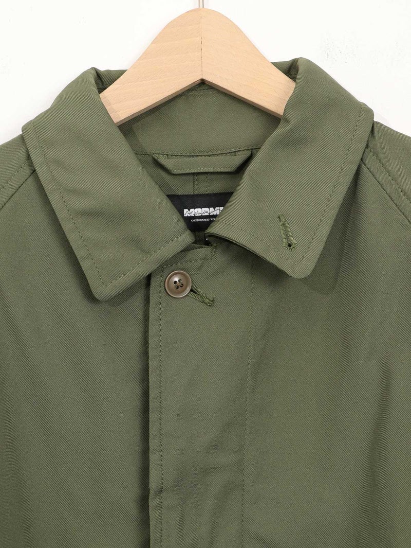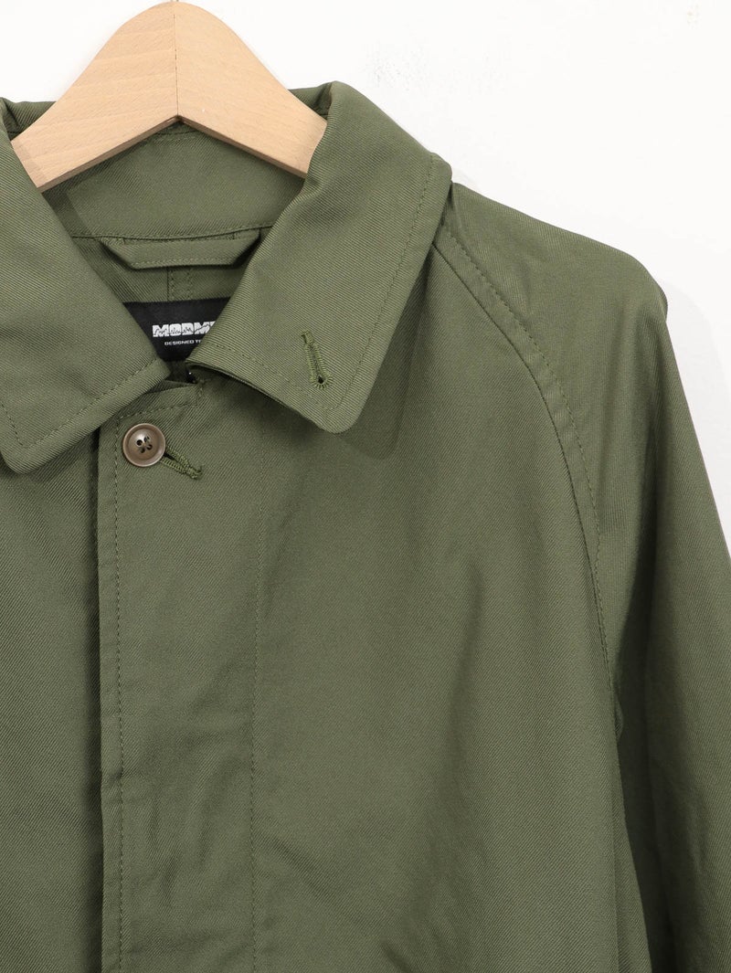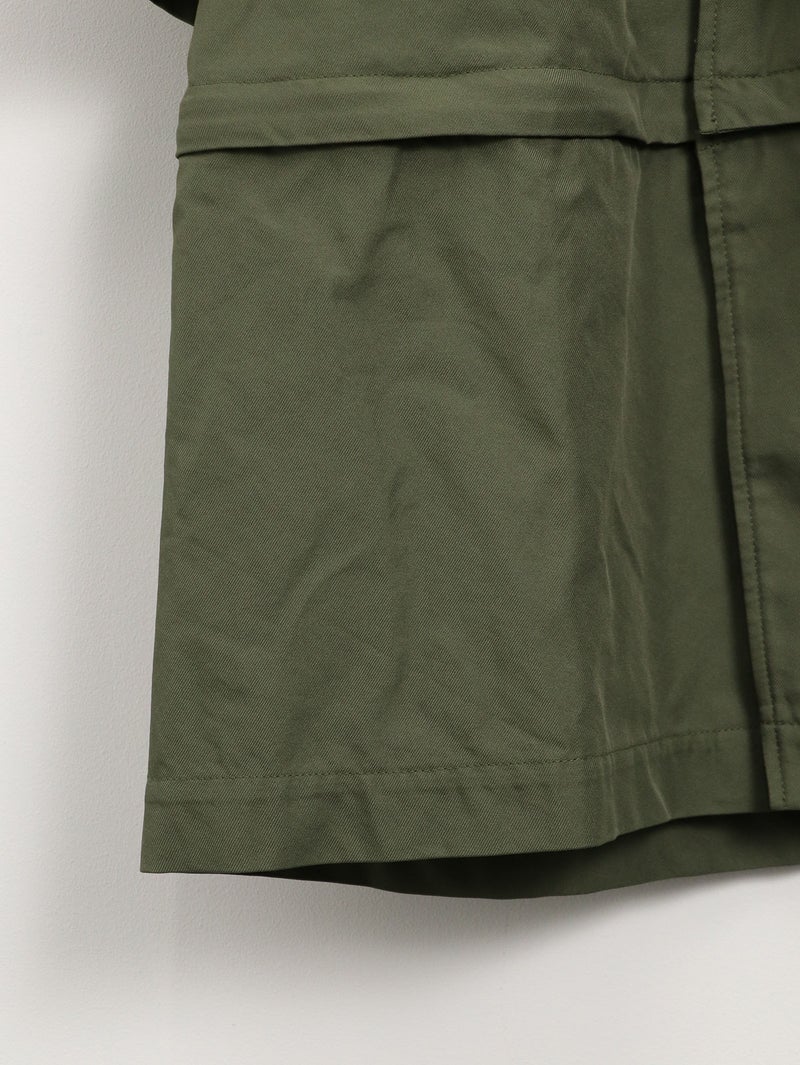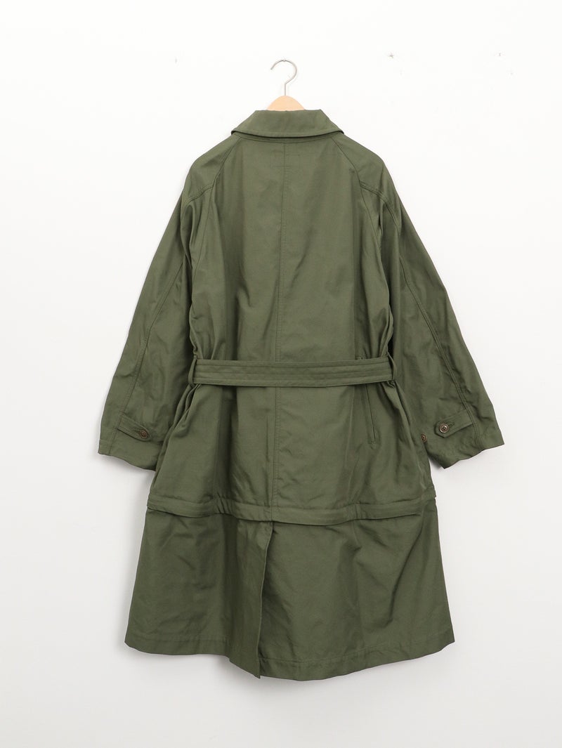 2WAY、あるいはトランスフォーマブルな構造を取り入れたコート。 コートとして着用しながら、トップ部分のみを切り替えることで、ブルゾンとしても着られる構成です。用途やスタイリングに応じて使い分けられます。素材には、太番手のポリエステル製ハイカウント糸を使用した先染めの高機能ツイル素材を採用しています。程よい肉感と軽さを両立し、しわがつきにくく、シルエットを保ちやすい形状記憶加工を施しています。着用の仕方によって印象が変わり、一着で複数の役割を担う、可変性と実用性を備えたコートです。