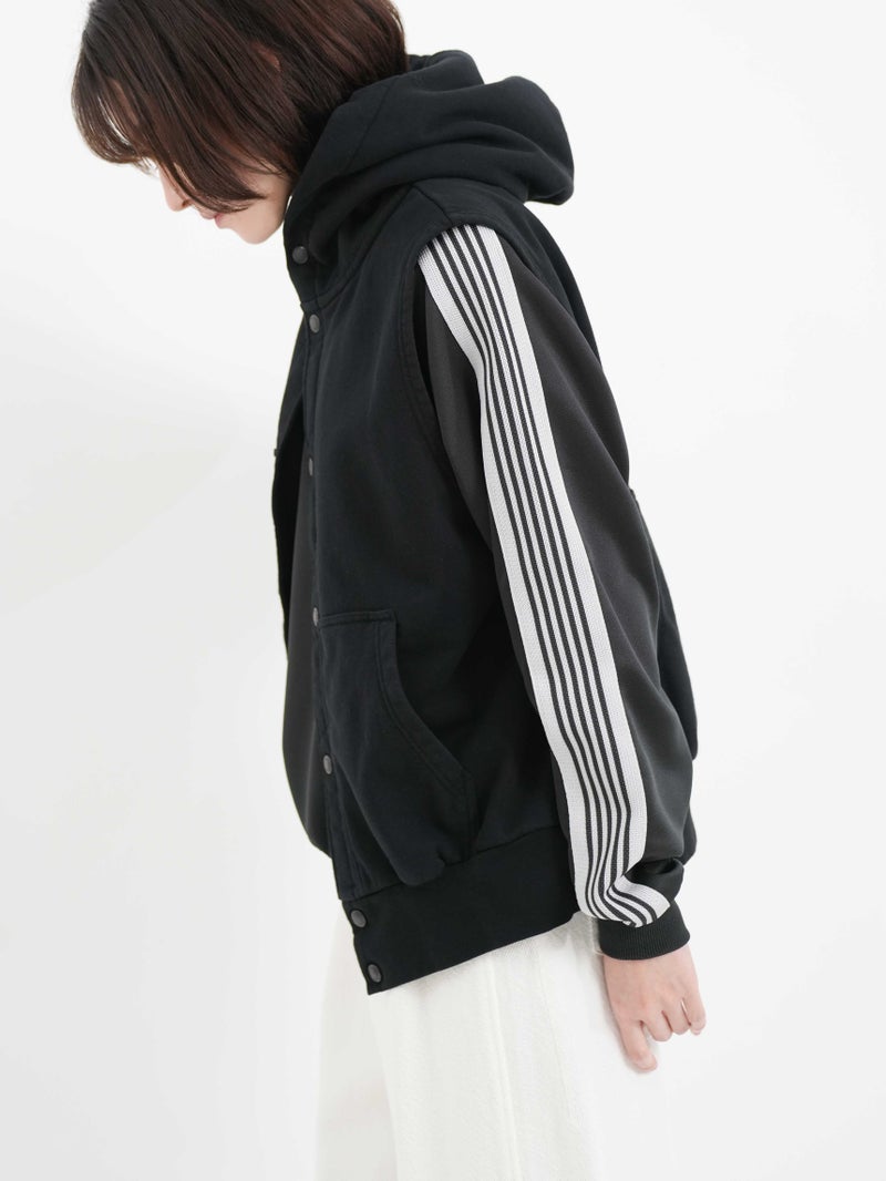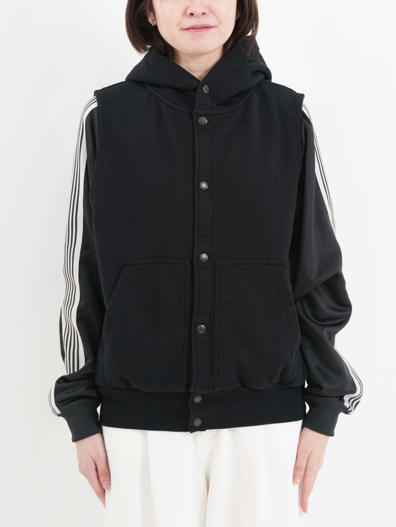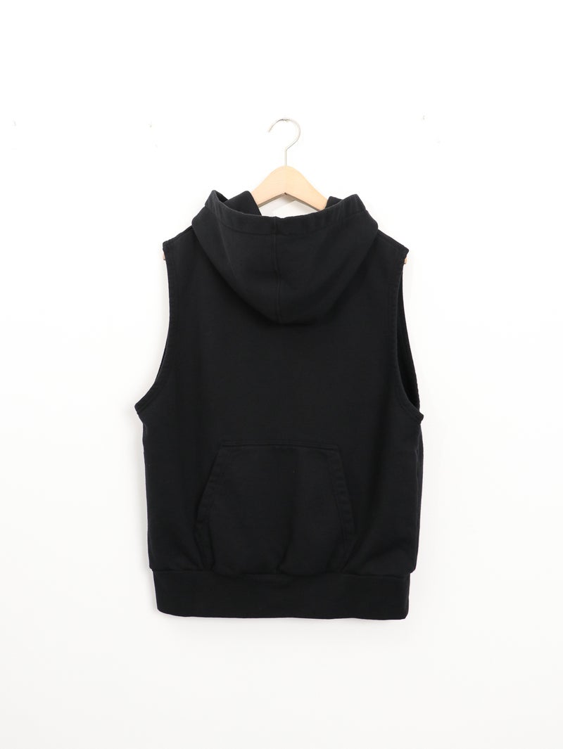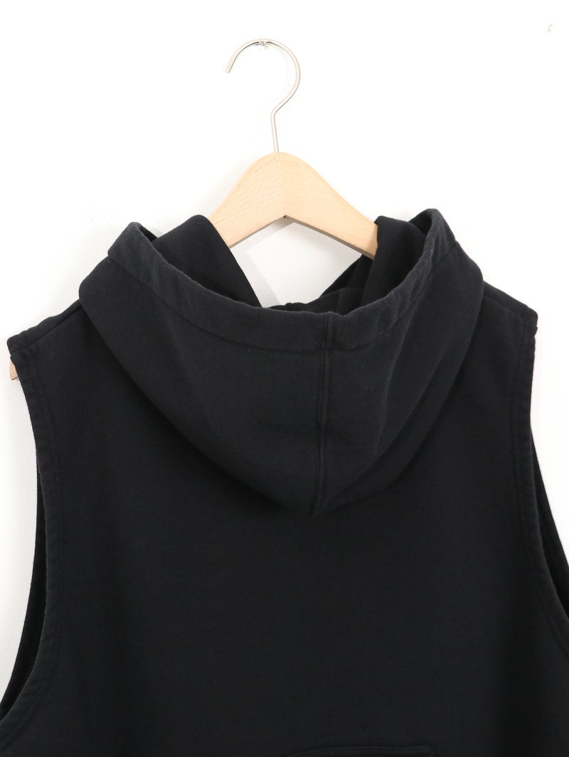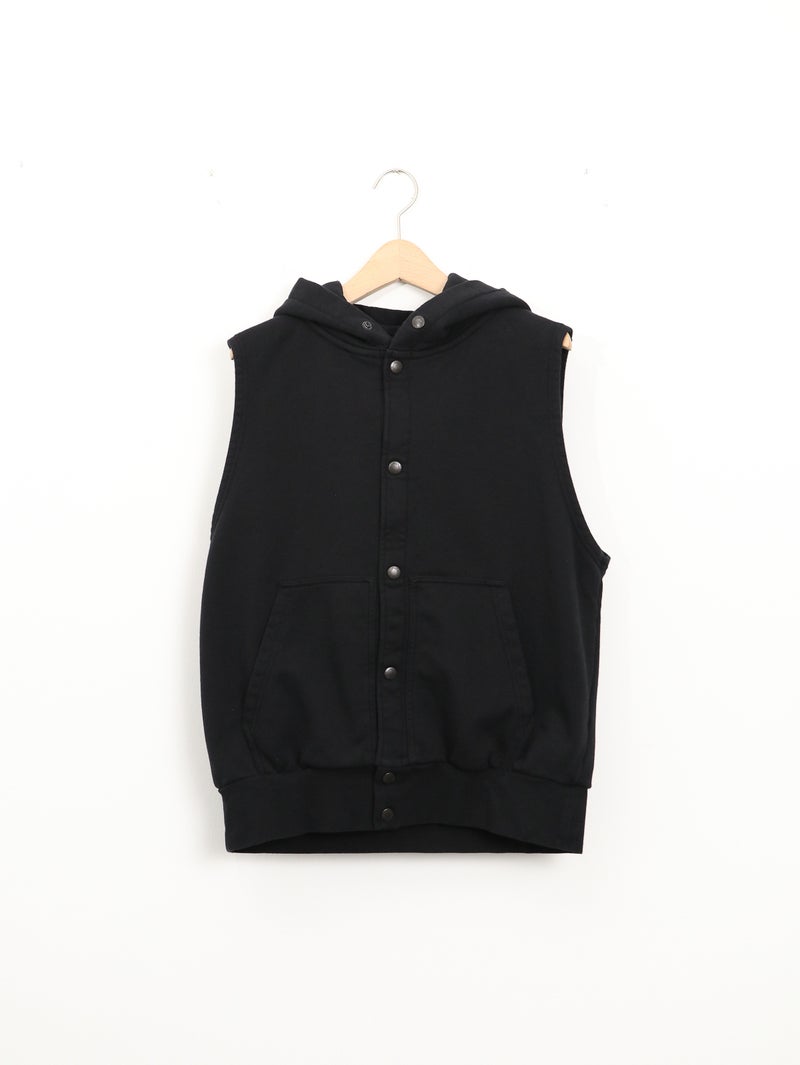 フーディの要素をベストに落とし込み、レイヤリングの幅を広げたスウェットベスト。 フード付きベストとして設計することで、スウェットやアウターの上から重ねやすく、スタイリングに立体感を加える一着です。軽さを活かした構成により、季節の変わり目やレイヤードスタイルで自然に取り入れやすいバランスに仕上げています。素材には、和歌山で1970年代初期に導入された旧式編み機「アズマ編み機」を使用したライトウエイト裏毛素材を採用。一日に限られた量しか編み立てることができない工程から生まれる、膨らみのある柔らかな風合いと、整った表情が特徴です。製品洗いを施し、全体の風合いを整えています。