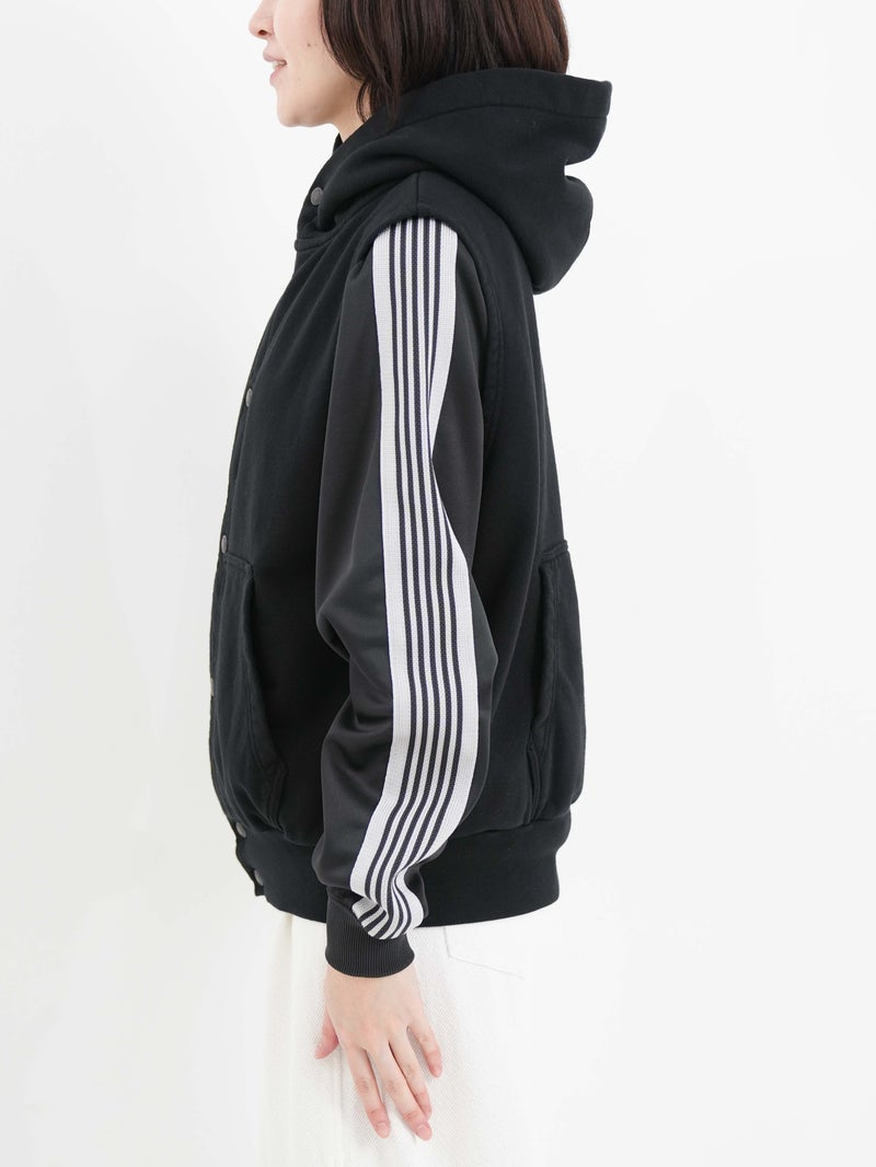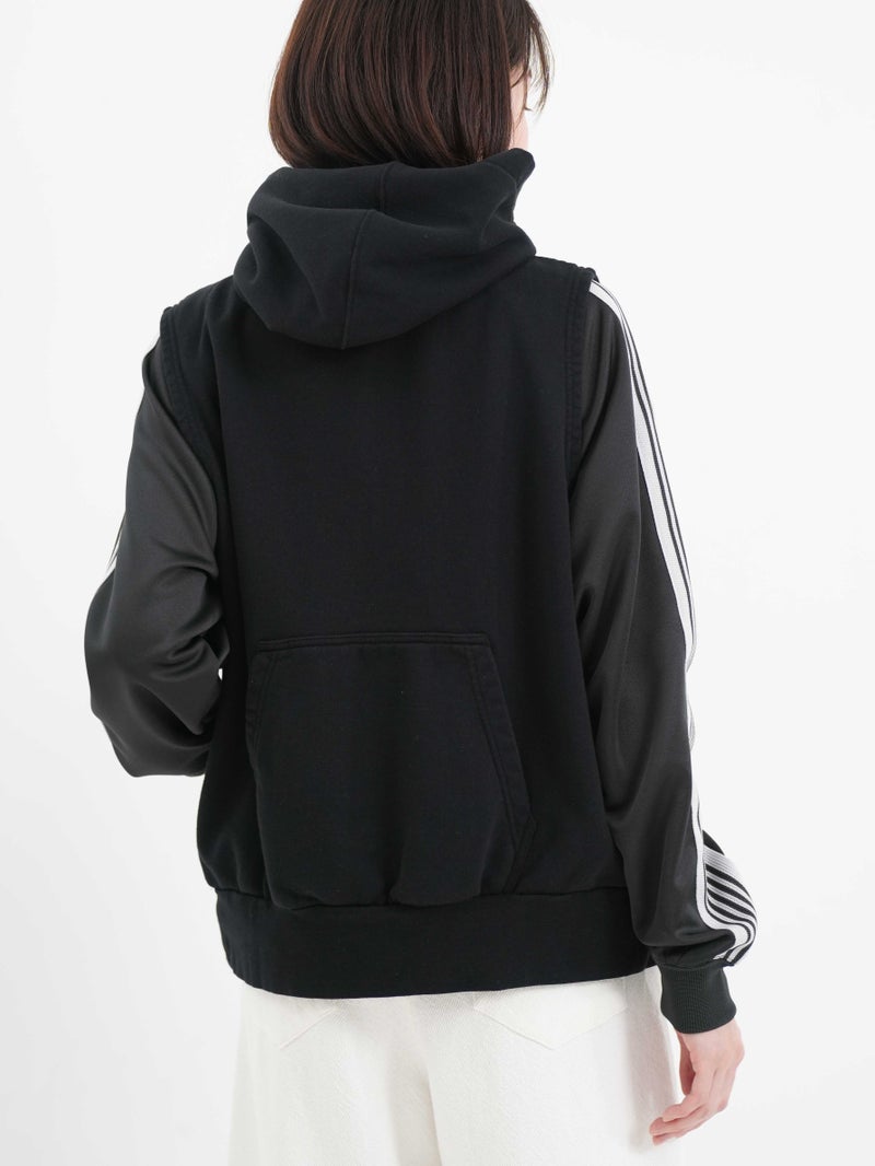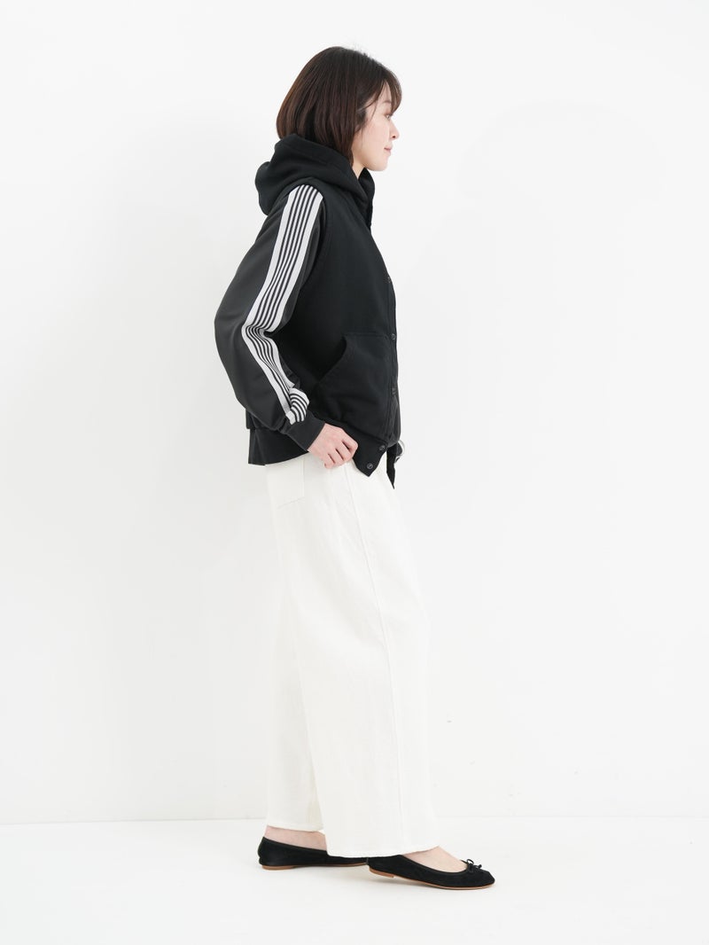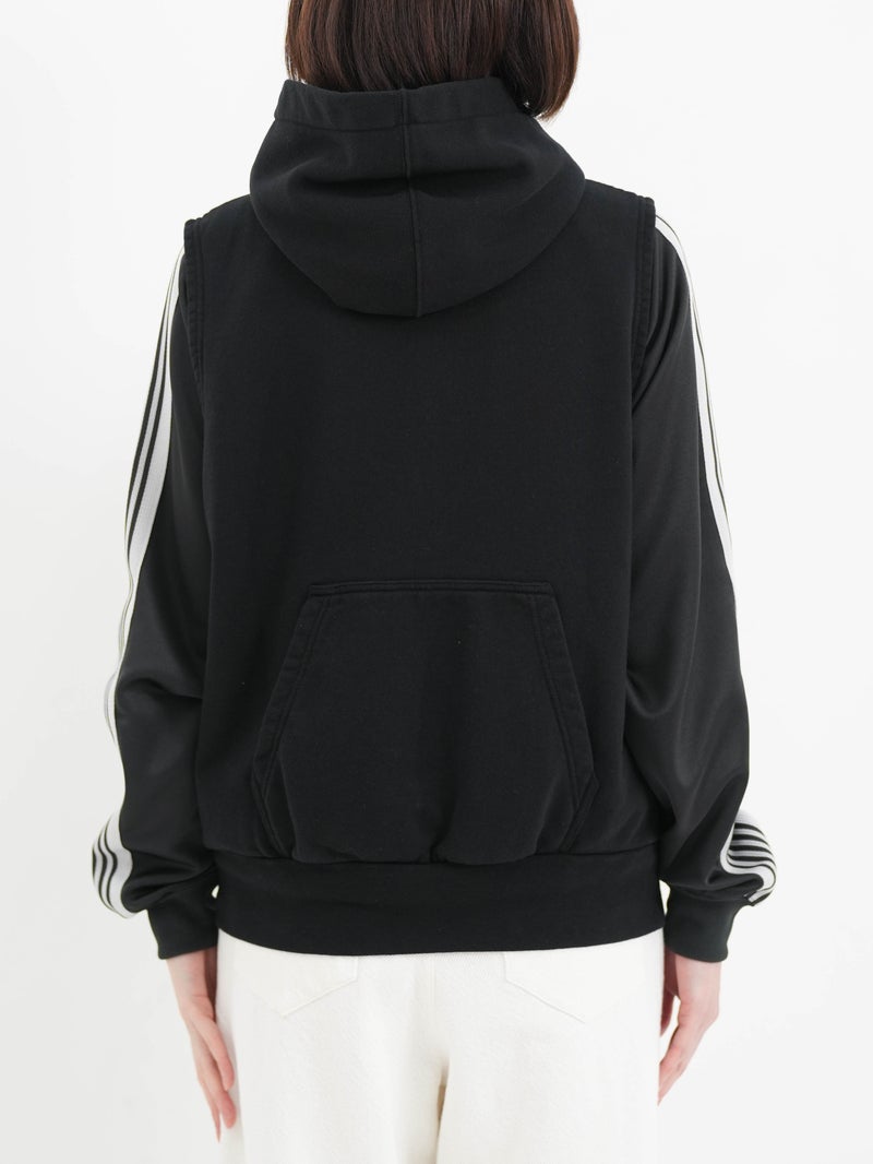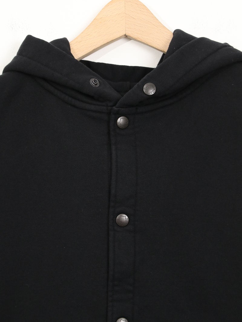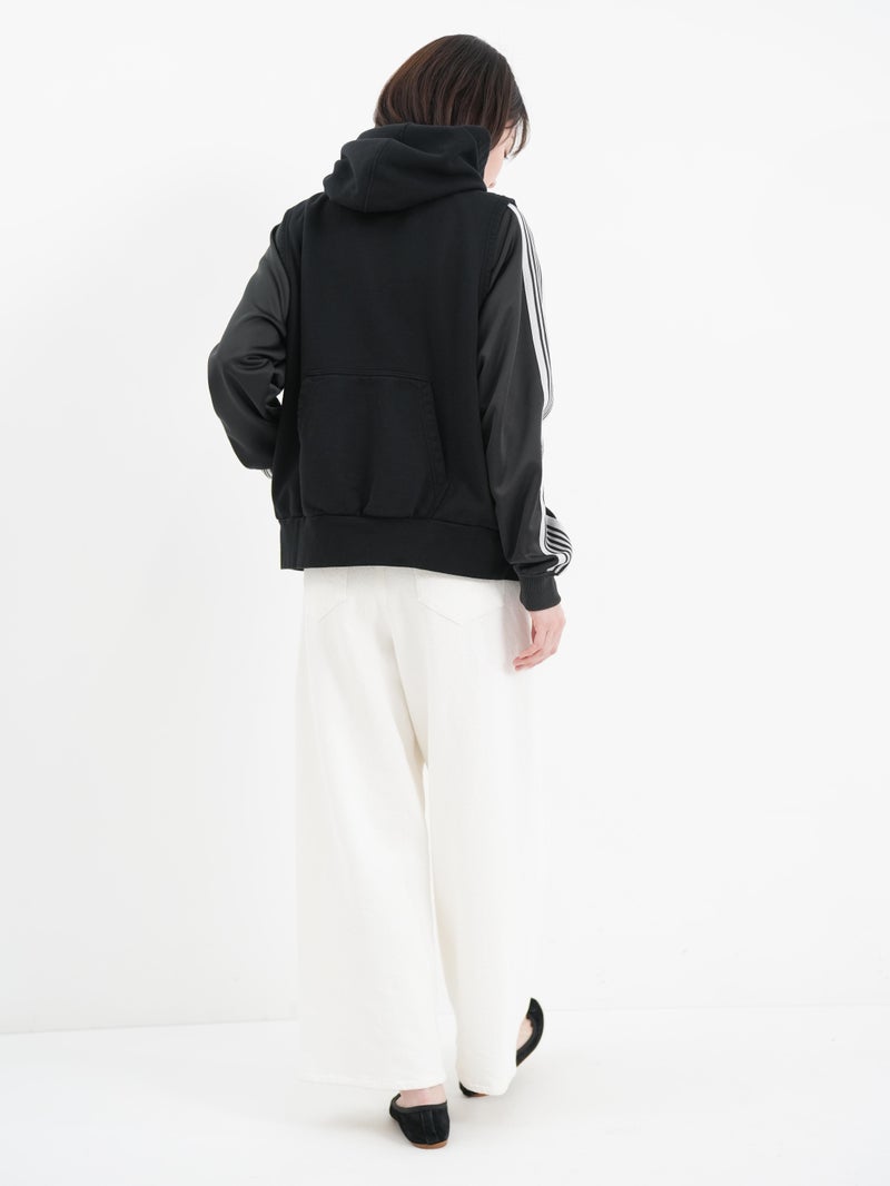 フーディの要素をベストに落とし込み、レイヤリングの幅を広げたスウェットベスト。 フード付きベストとして設計することで、スウェットやアウターの上から重ねやすく、スタイリングに立体感を加える一着です。軽さを活かした構成により、季節の変わり目やレイヤードスタイルで自然に取り入れやすいバランスに仕上げています。素材には、和歌山で1970年代初期に導入された旧式編み機「アズマ編み機」を使用したライトウエイト裏毛素材を採用。一日に限られた量しか編み立てることができない工程から生まれる、膨らみのある柔らかな風合いと、整った表情が特徴です。製品洗いを施し、全体の風合いを整えています。