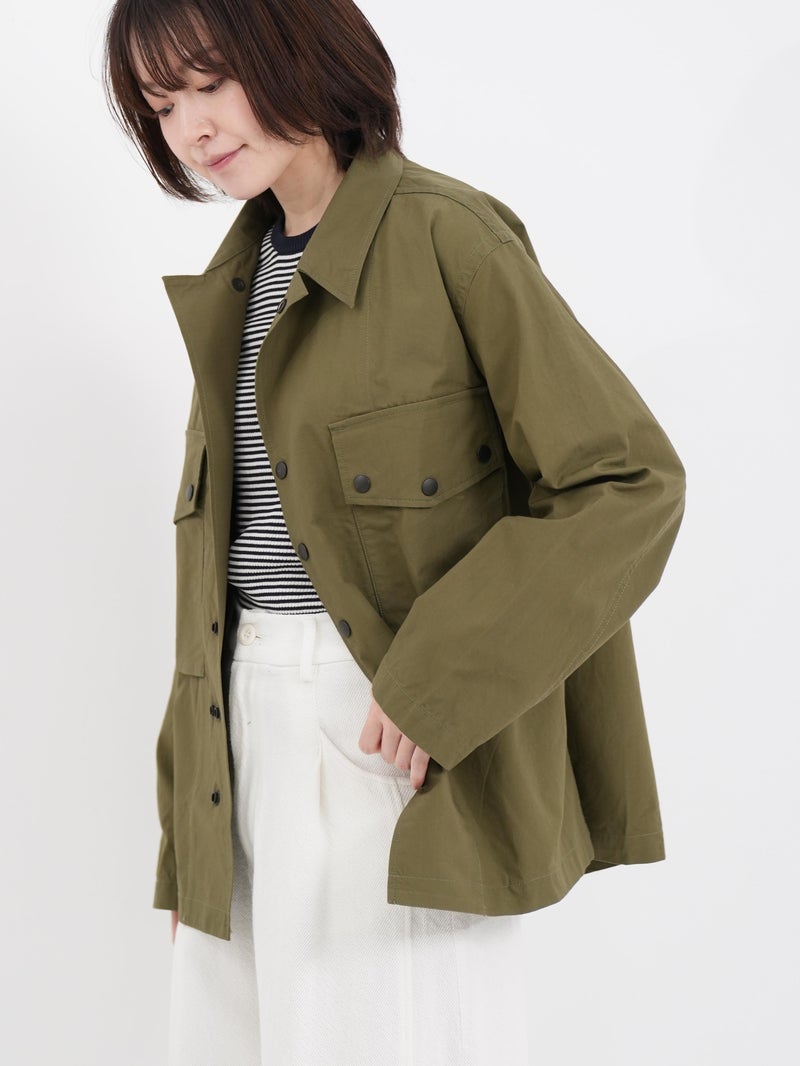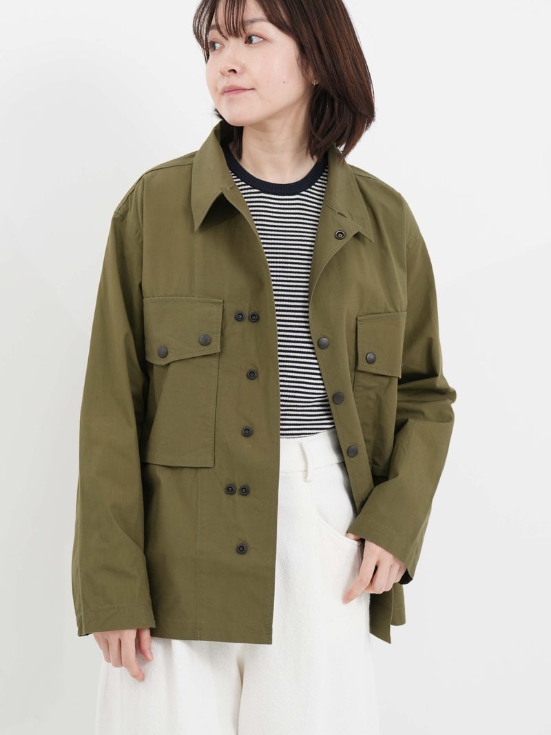 両胸に大きなマチ付きフラップポケットを備えた軽快なフィールドジャケット。 スナップボタンを多用したデザインが特徴的で、袖口も調整可能のです。ミリタリーでは定番のコットンリップストップを使用し、シーズンを問わず活躍する一着です。