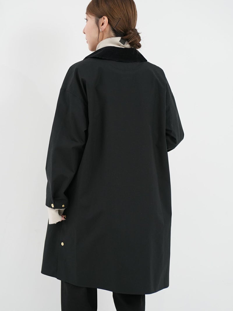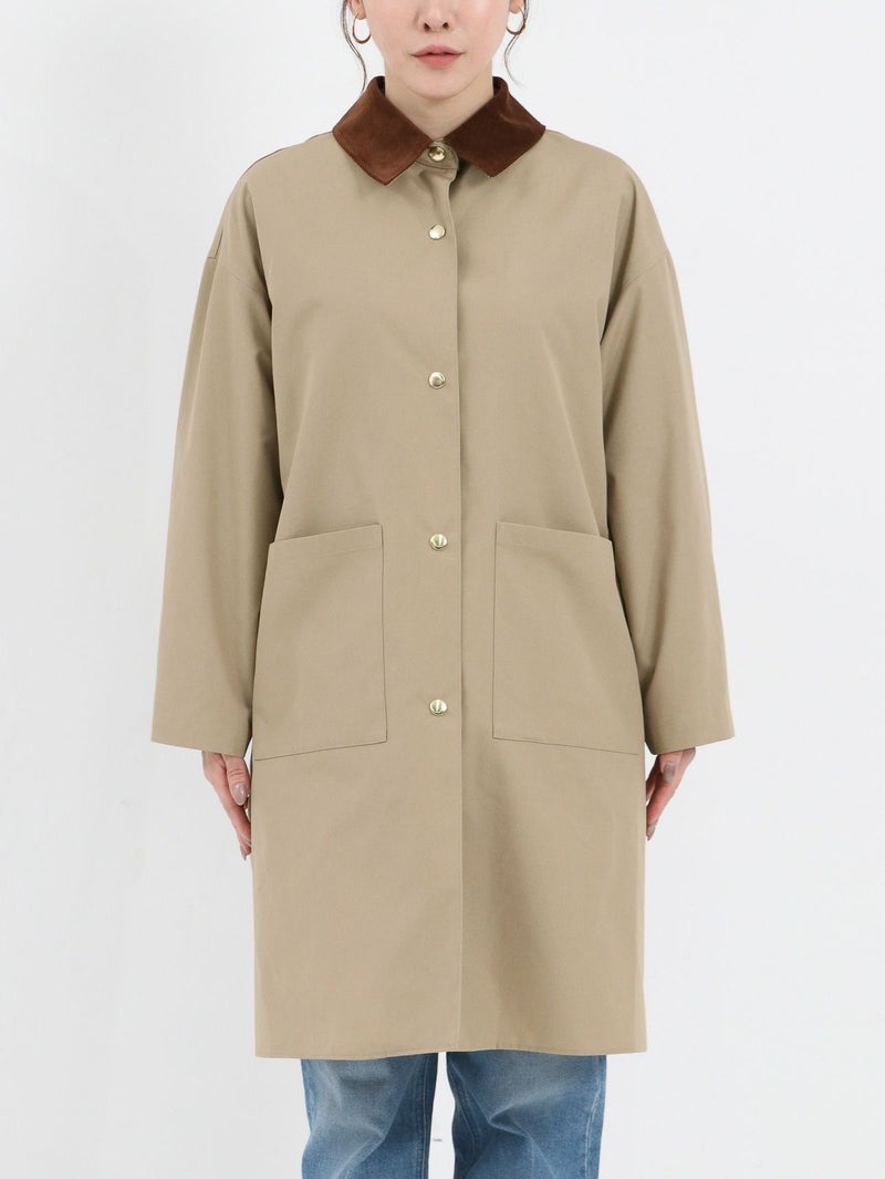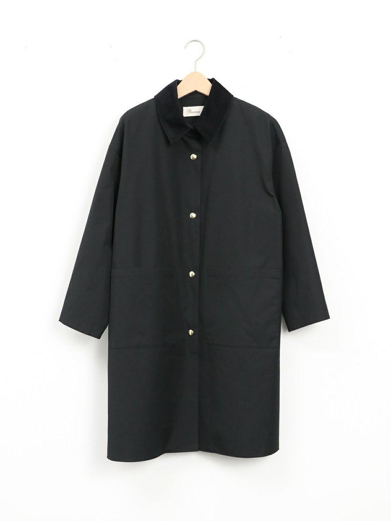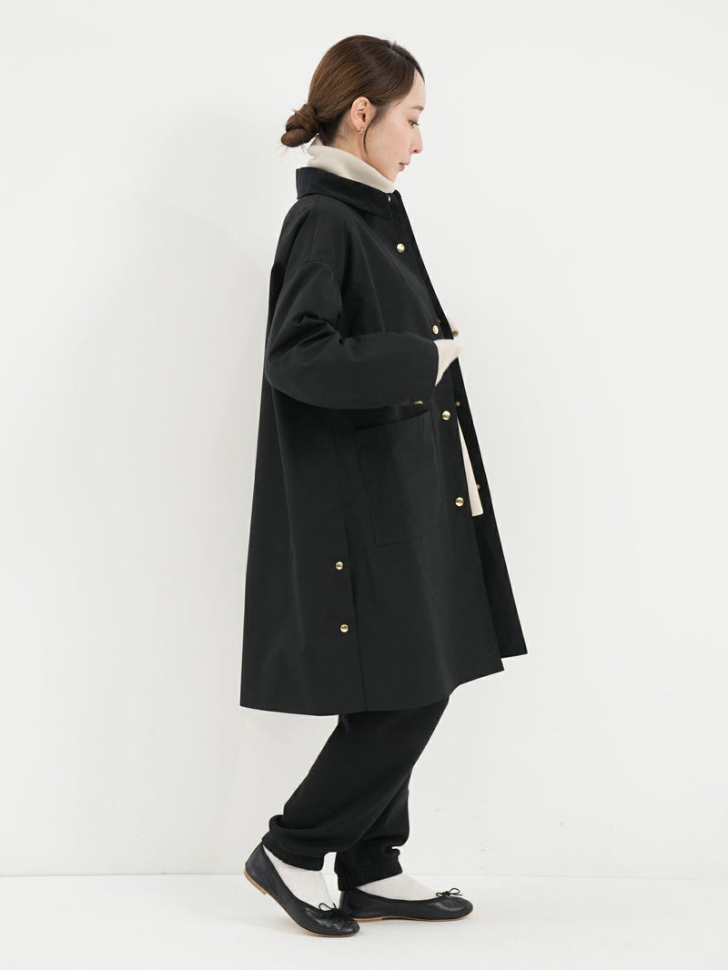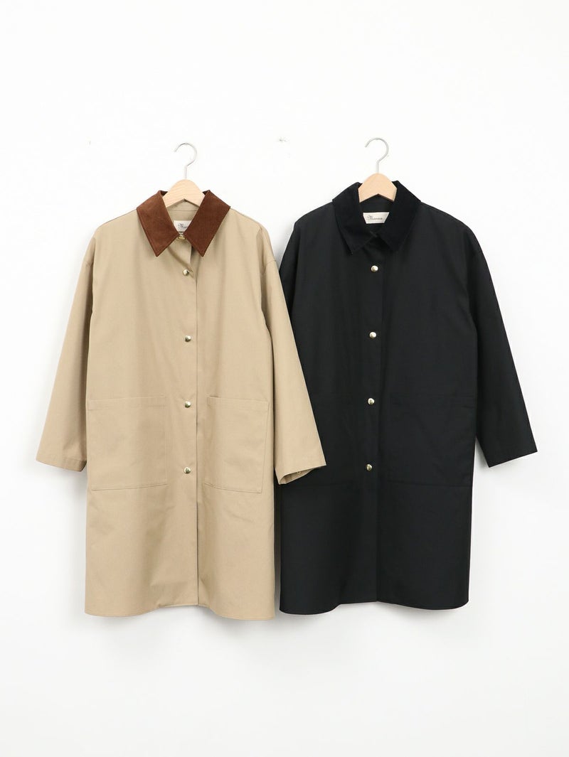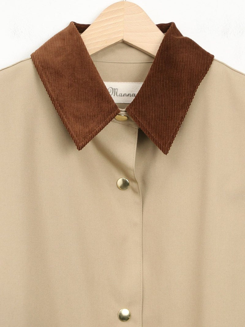 Mannaのライナー付きコート。 襟部分はコーデュロイ生地で、フロント部分と裾サイドには金ボタンが施されています。チェック柄のライナー付きで、ボタンで着脱可能。程よい着丈で、トップスやボトムを選びません。ベーシックでありながら今の気分にフィットするコートです。
