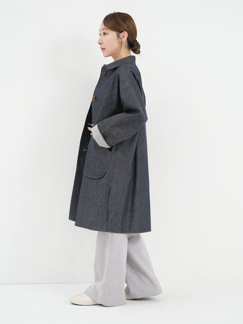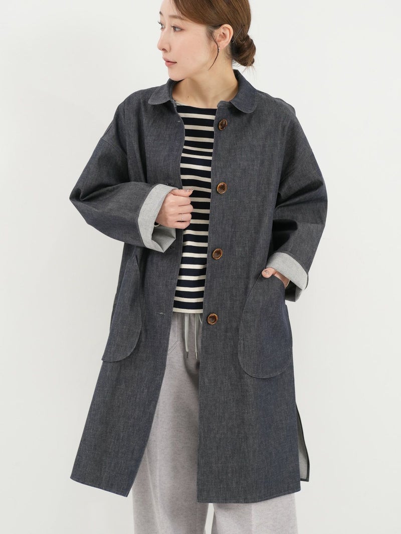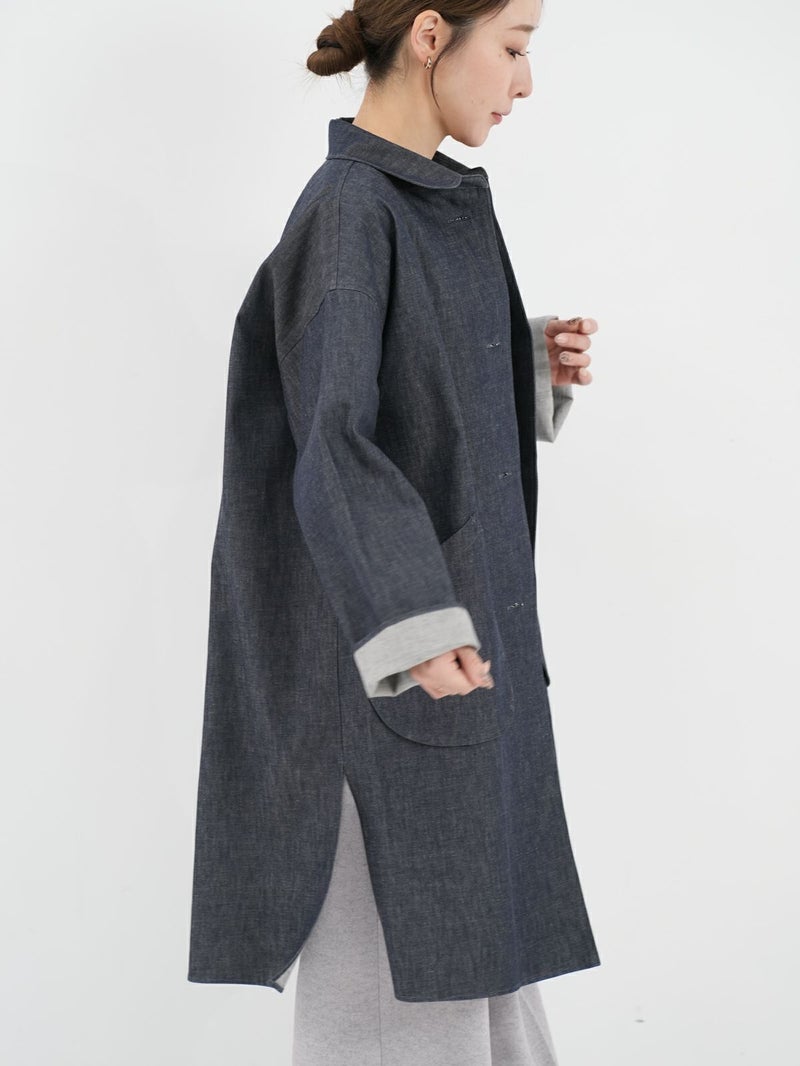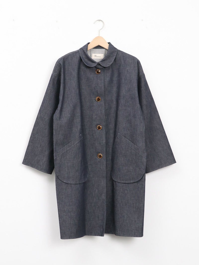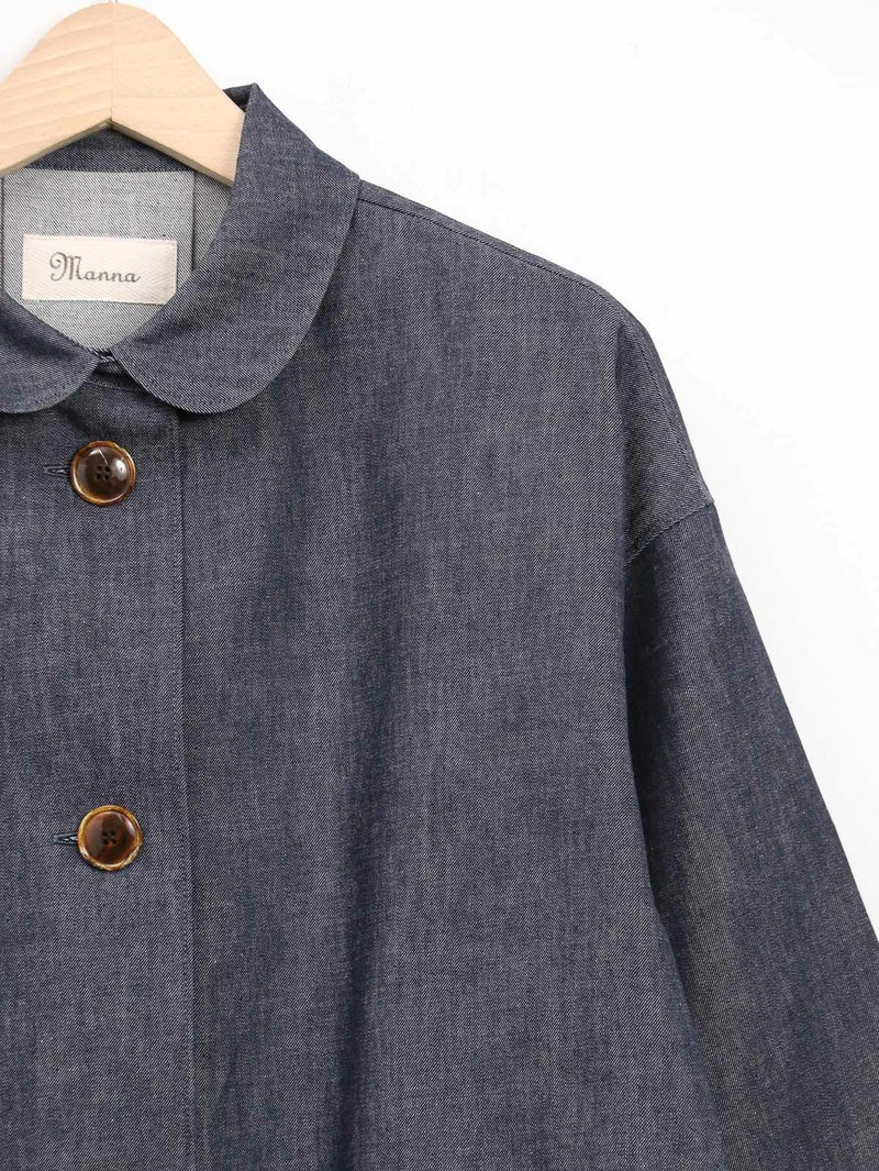 春が待ち遠しくなるデニムコート。 洗いがかかってない軽めのデニム素材で、マンナお得意の丸い襟と斜めのポケットが特徴的。タートルやボーダーを合わせてシンプルに合わせるのがオススメ。ミドル丈なのでスカートやワンピースにも好相性。おでかけしたくなるコートです。