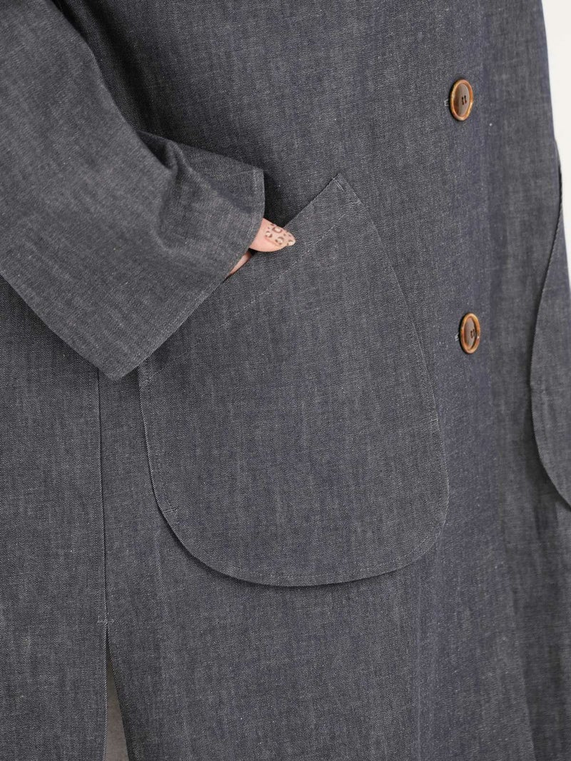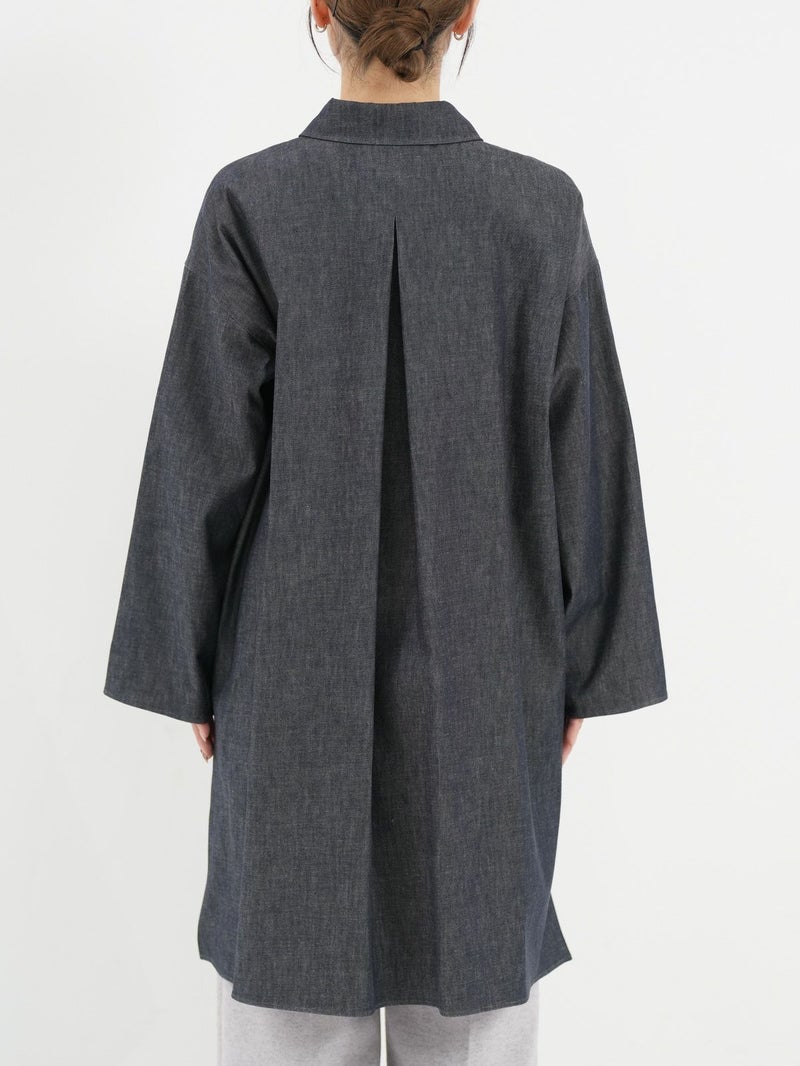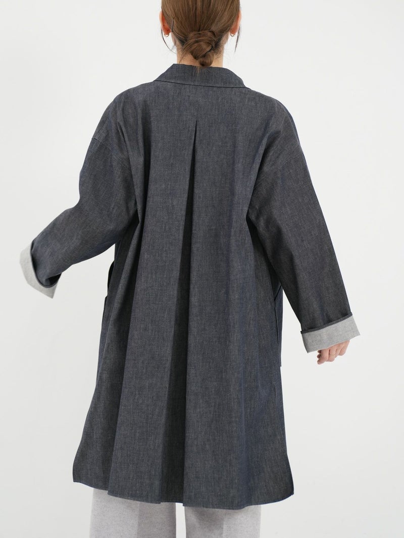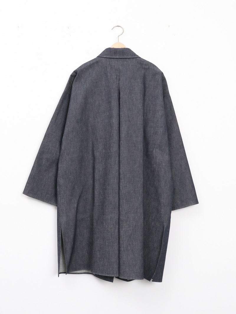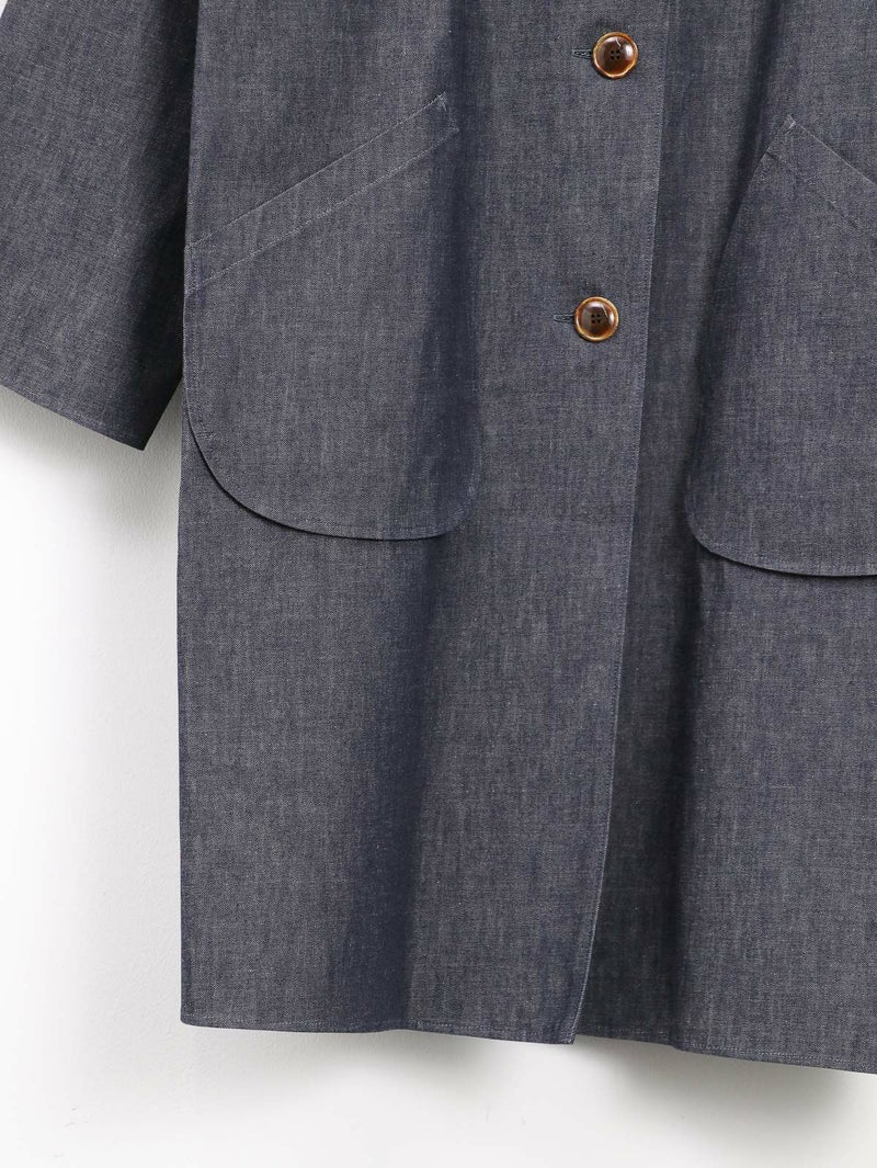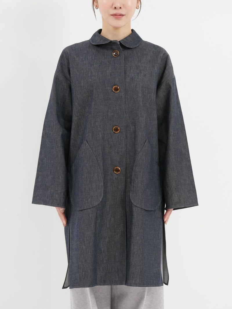 春が待ち遠しくなるデニムコート。 洗いがかかってない軽めのデニム素材で、マンナお得意の丸い襟と斜めのポケットが特徴的。タートルやボーダーを合わせてシンプルに合わせるのがオススメ。ミドル丈なのでスカートやワンピースにも好相性。おでかけしたくなるコートです。