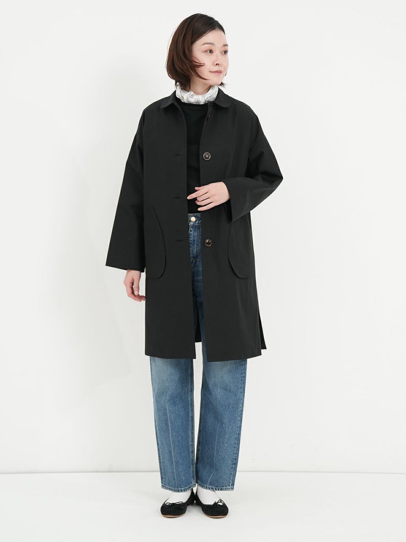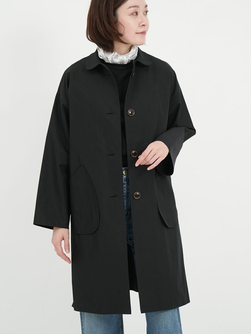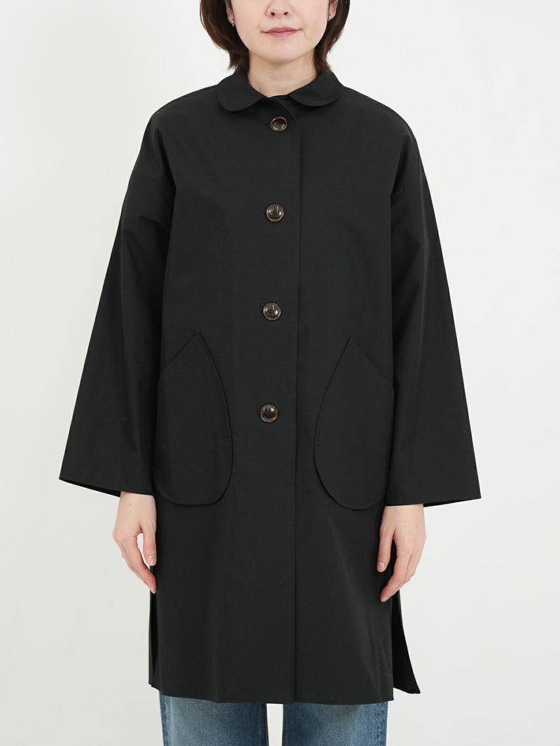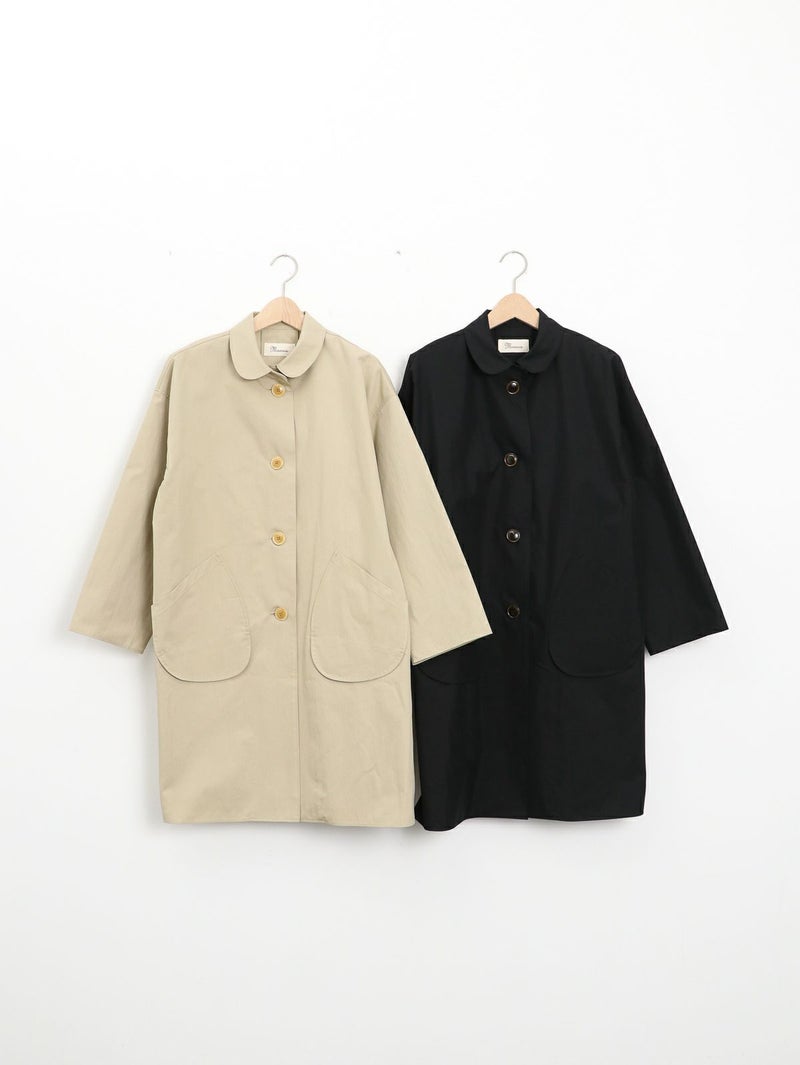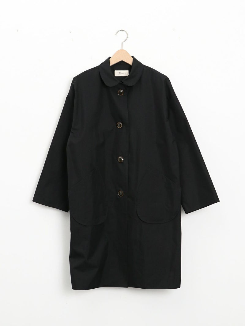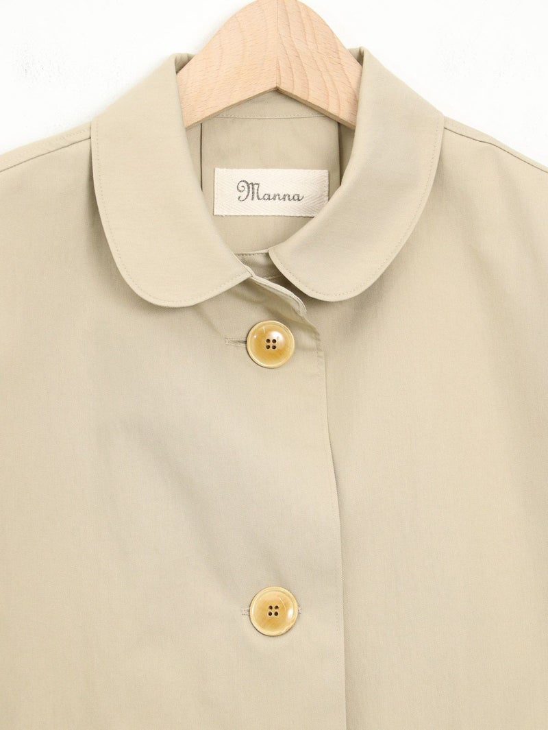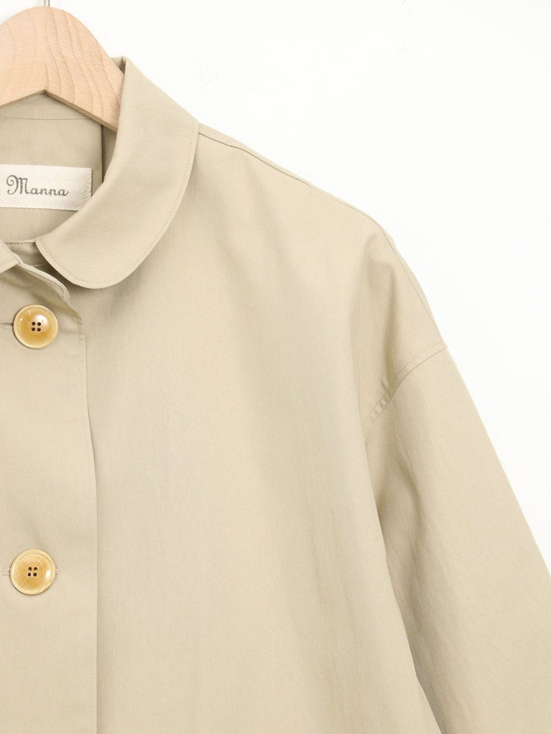 丸襟やボタン、ポケットデザインがマンナらしいコート。 薄手なコットンナイロン素材が使用してあり、さらりと軽い着心地です。程よくゆとりのあるサイズ感で、裾にかけて広がるAラインシルエットも魅力的。カジュアルなスタイルにはもちろん、少しツヤ感のある生地なのできれいめなスタイルにも◎