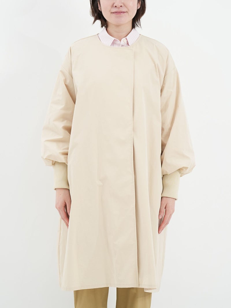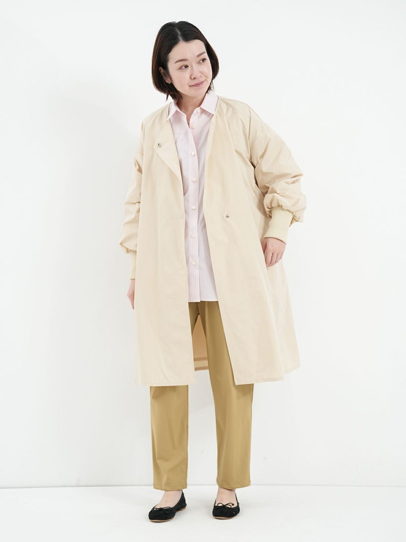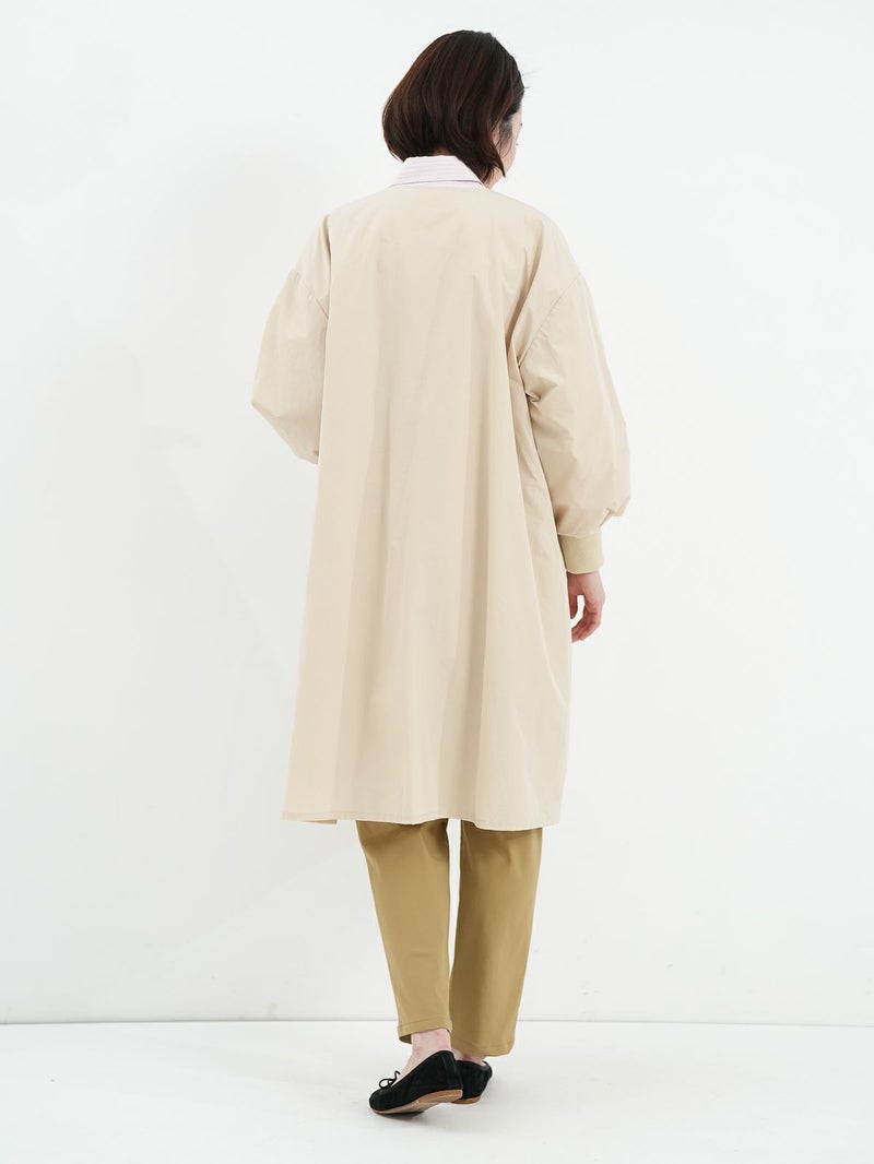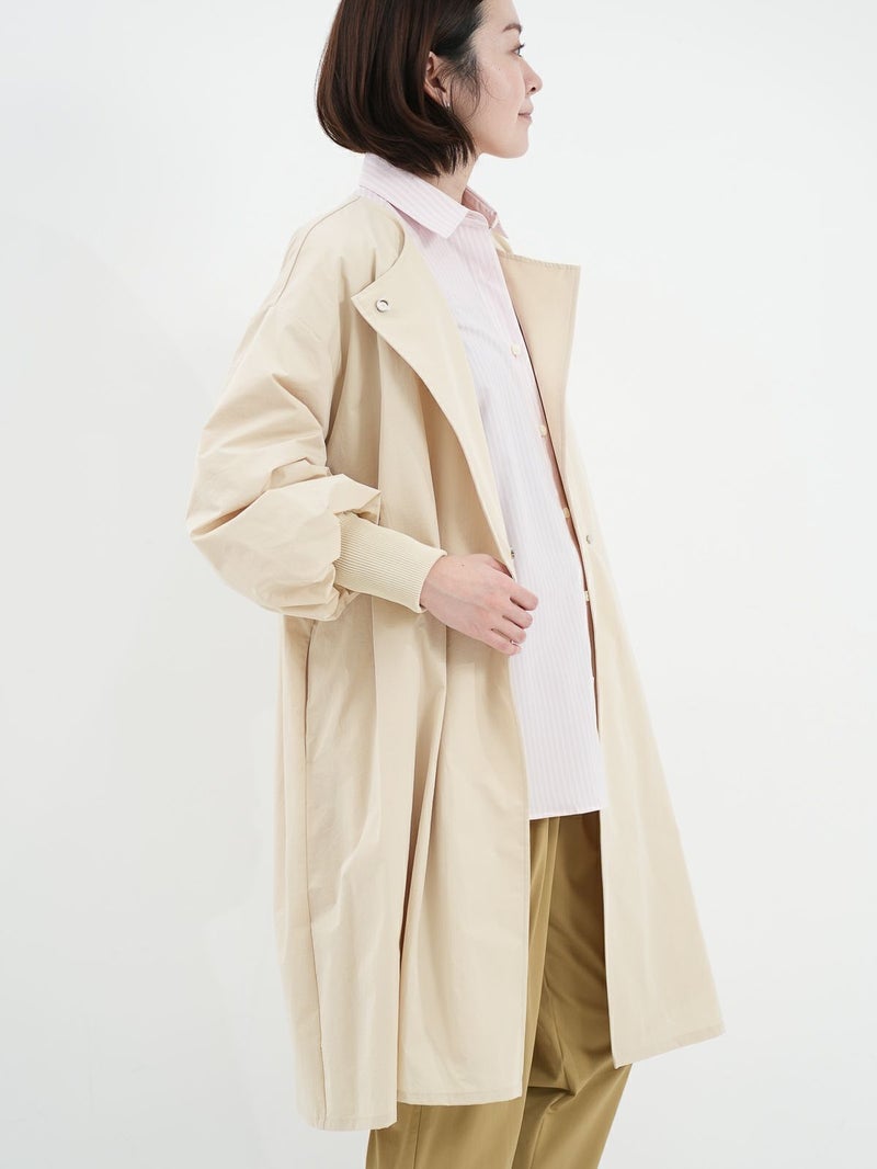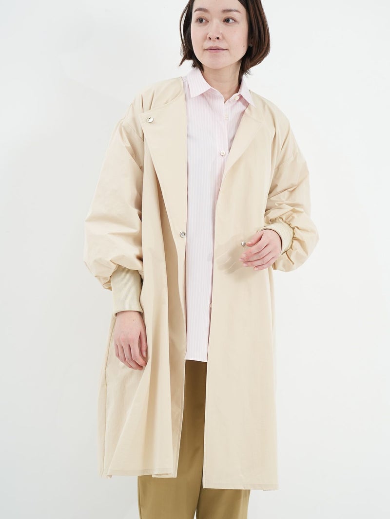 微ワッシャー加工が施されたポリエステル素材を使用したライトコート。 シャリ感のある肌触りと軽さがポイントです。ノーカラーのシンプルなデザインは、合わせるアイテムを選ばず、季節の変わり目に活躍します。