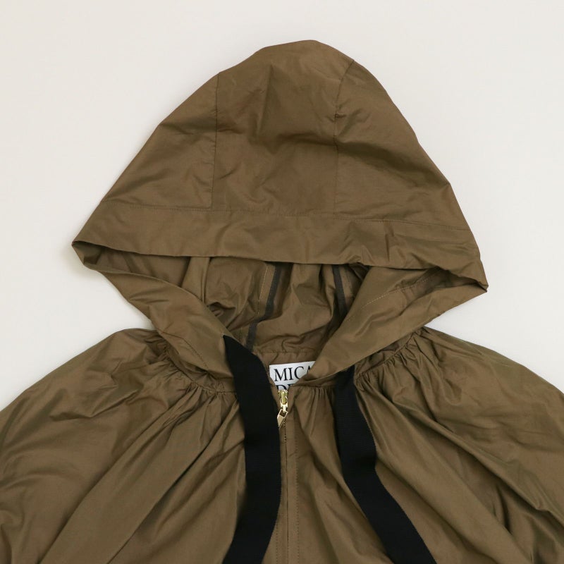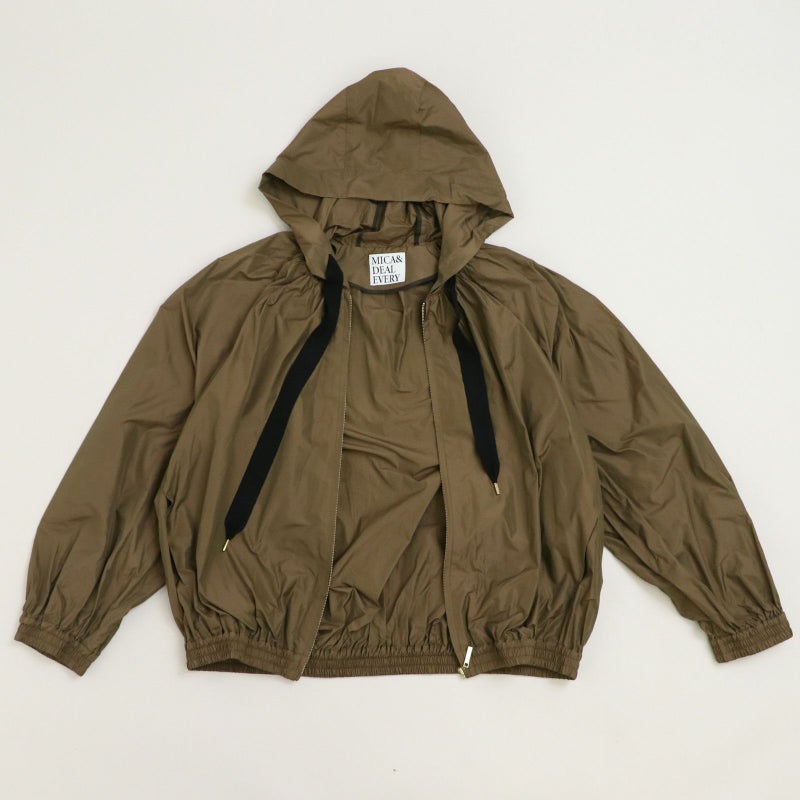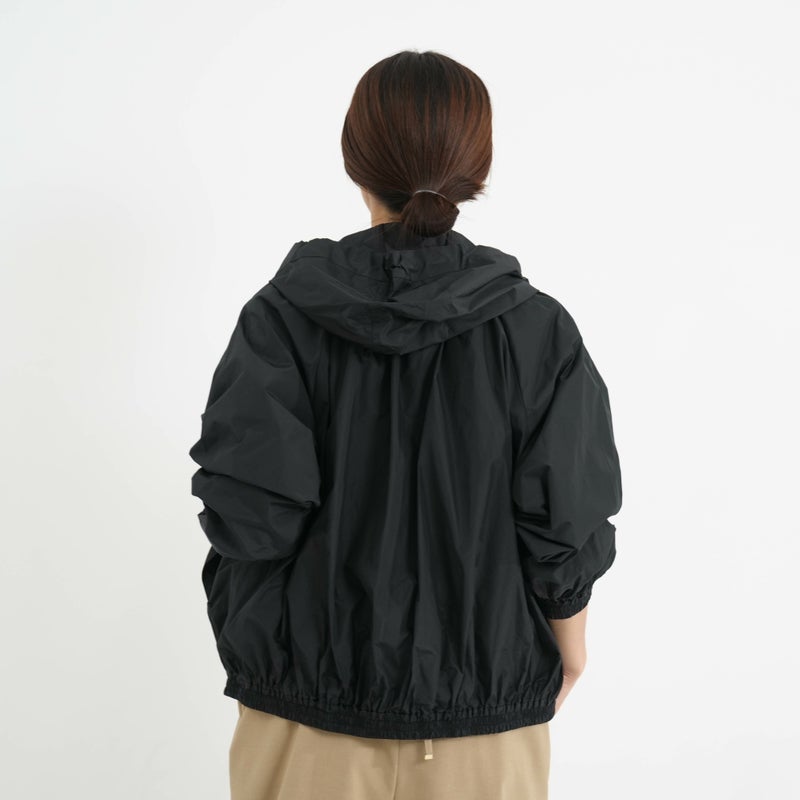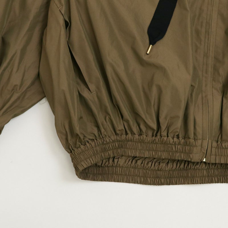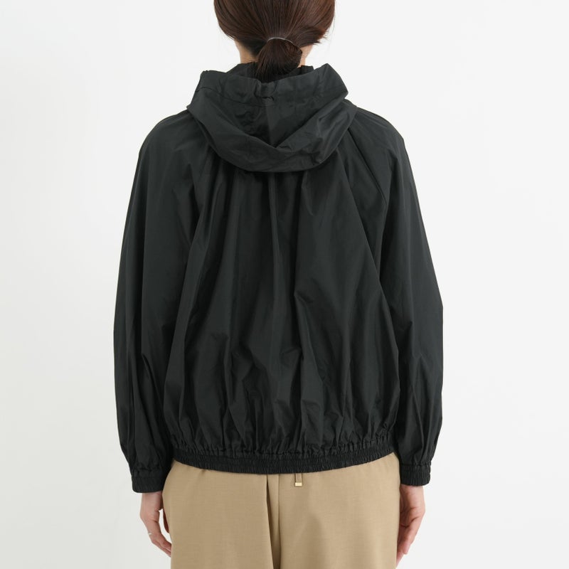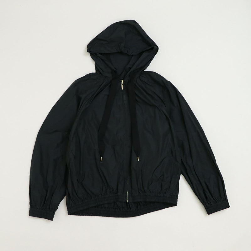 50デニールのリサイクルポリエステルとシャンブレー素材を使用したZIPフーディー。 シルク混素材の光沢感と先染めシャンブレーの色の見え方が高級感あがります。しわになりにくく、フード後ろのパイピングがアクセントに。