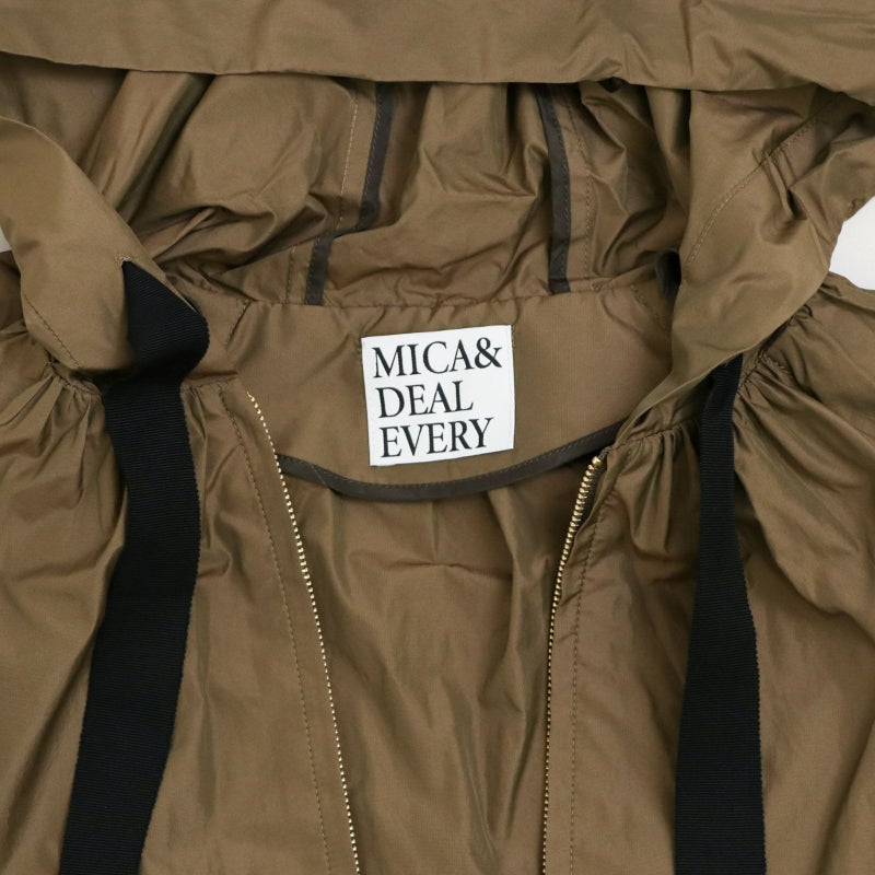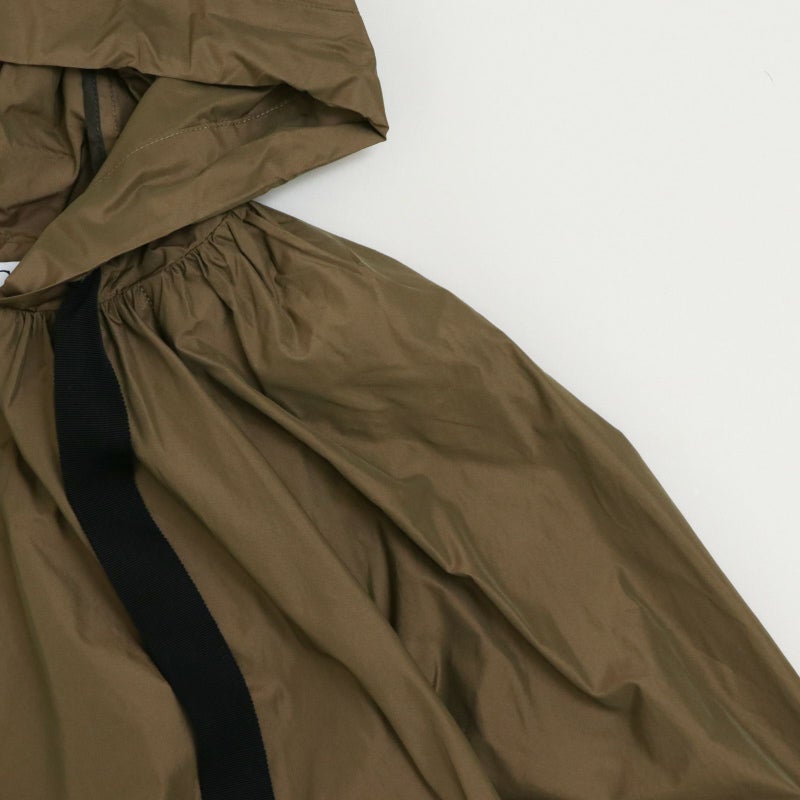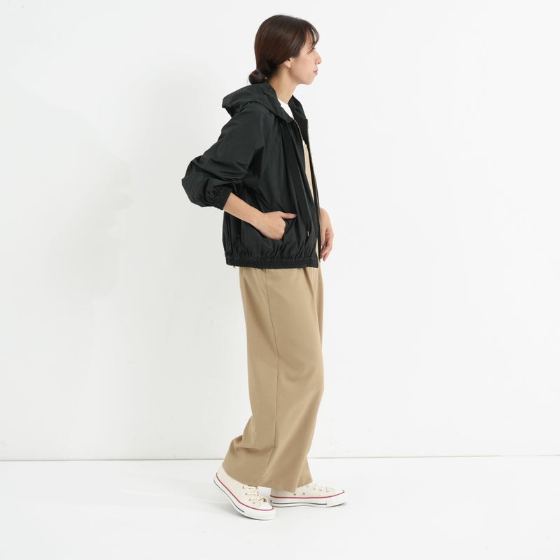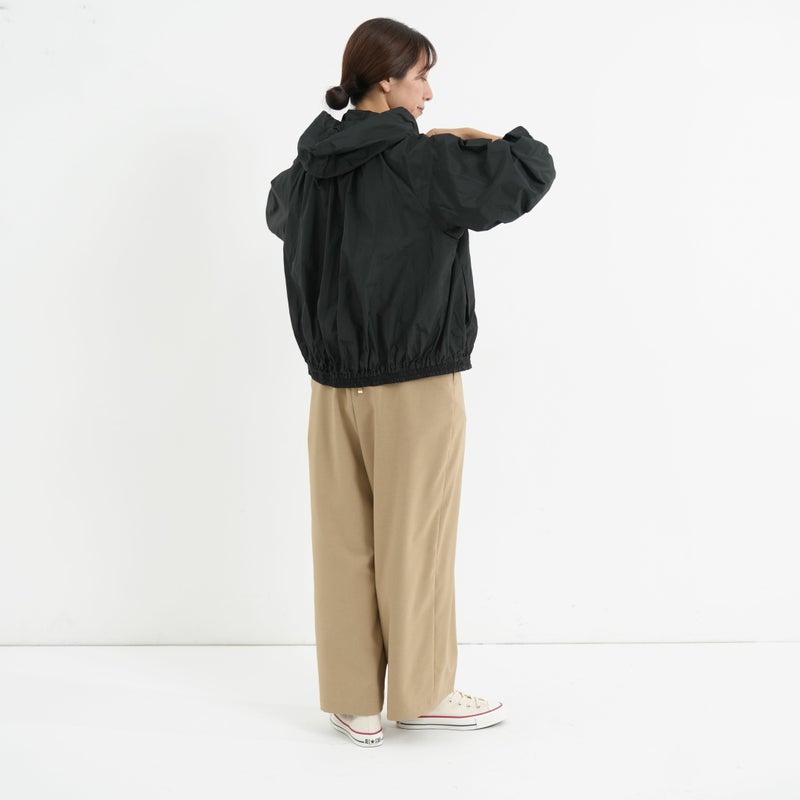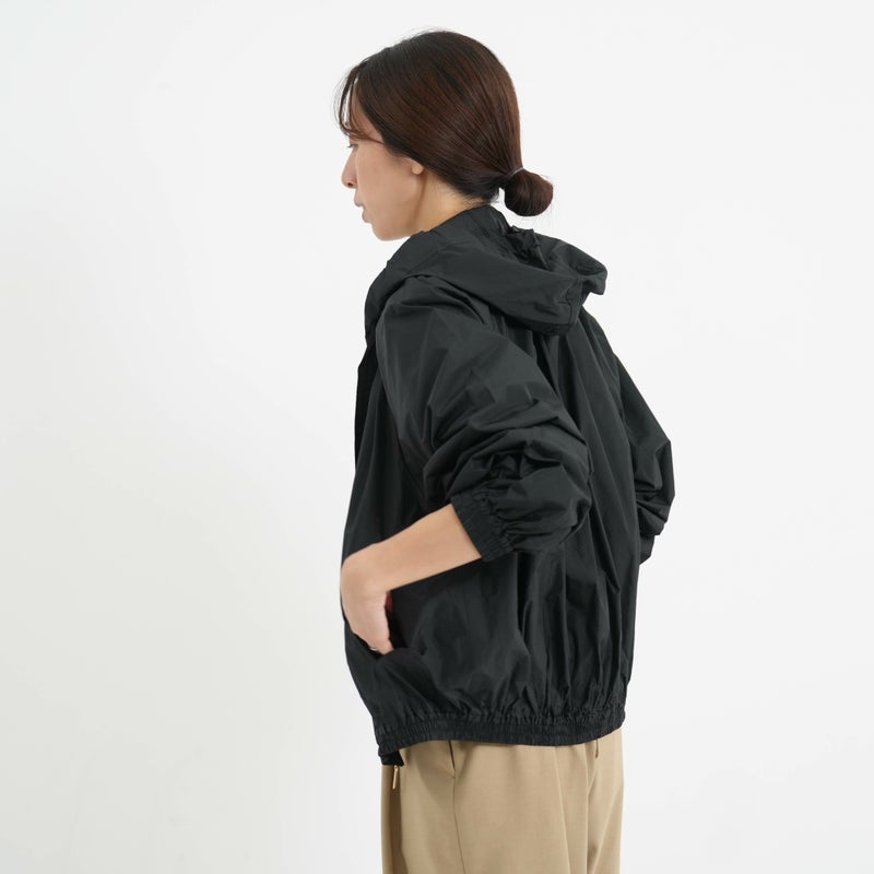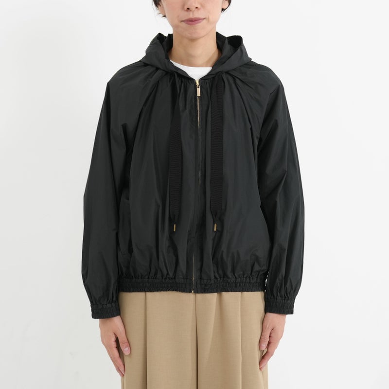 50デニールのリサイクルポリエステルとシャンブレー素材を使用したZIPフーディー。 シルク混素材の光沢感と先染めシャンブレーの色の見え方が高級感あがります。しわになりにくく、フード後ろのパイピングがアクセントに。
