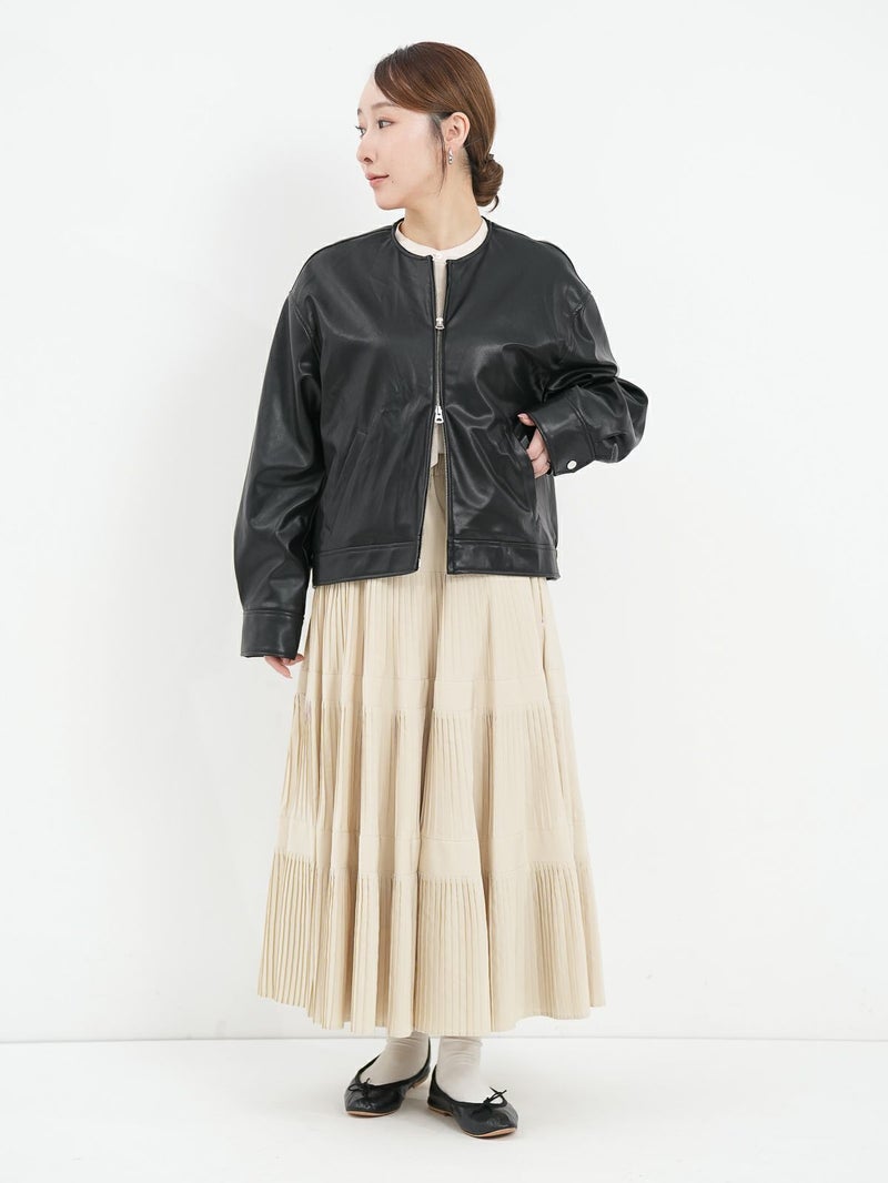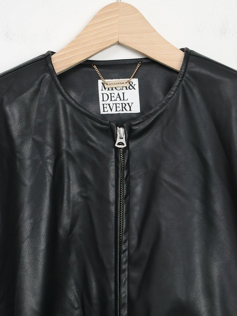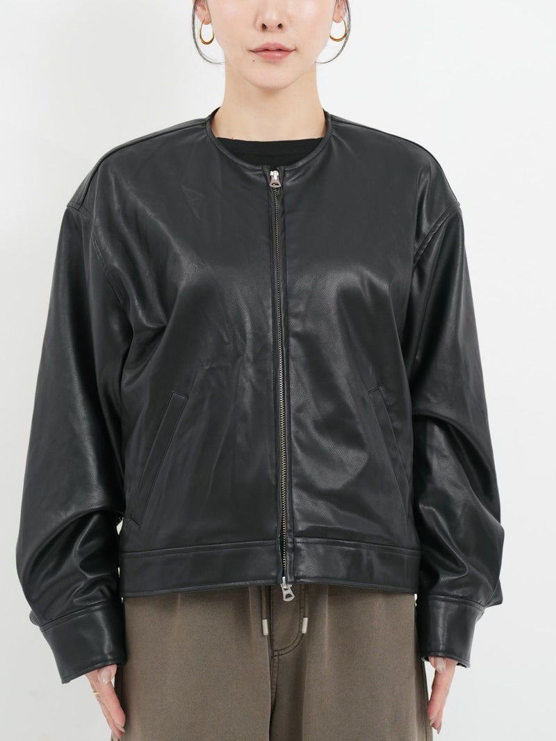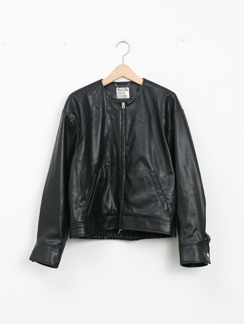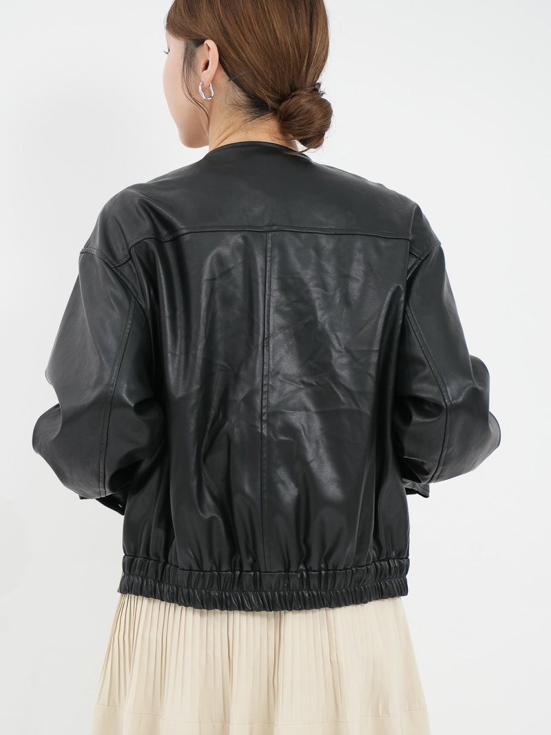 まるで本物のラムレザーのような柔らかさを持つ合皮ブルゾン。 無骨なイメージがあるレザージャケットですが、ノーカラーにして後ろのフォルムを少し丸くすることにより、優しい雰囲気に仕上げています。 本物のレザーより気兼ねなく着れ、軽いのも嬉しいポイントです。 高級感がありつつもどんなスタリングも格上げしてくれ、大人っぽく着こなせる一枚です。