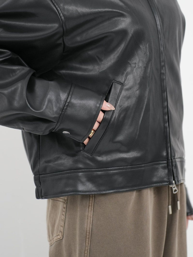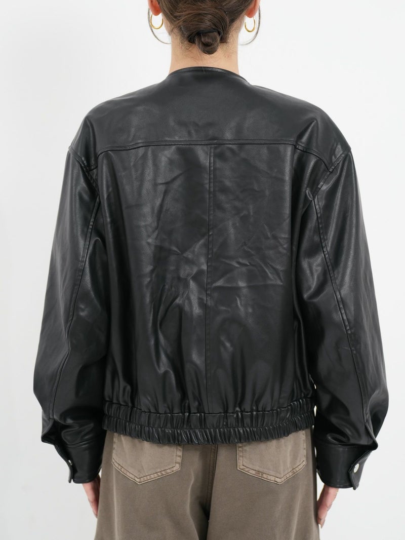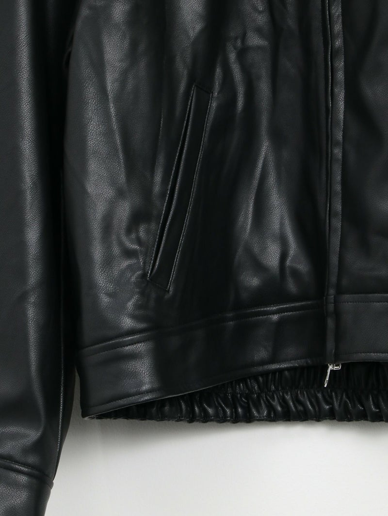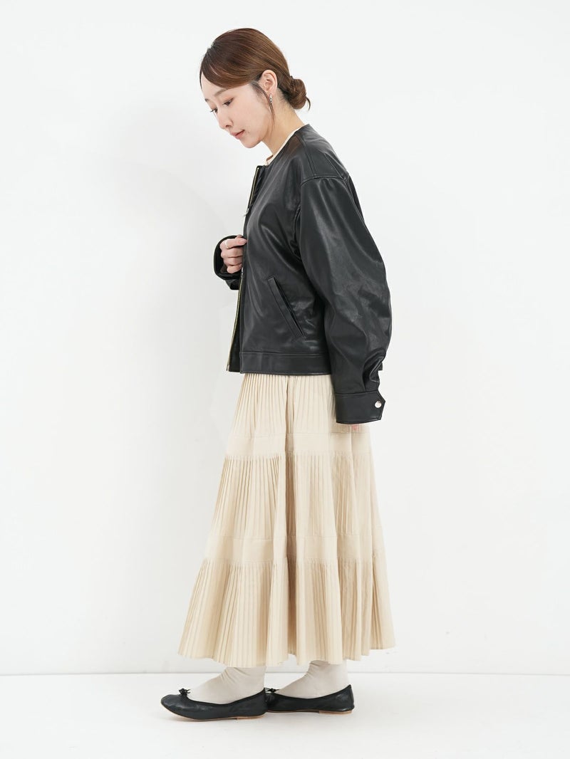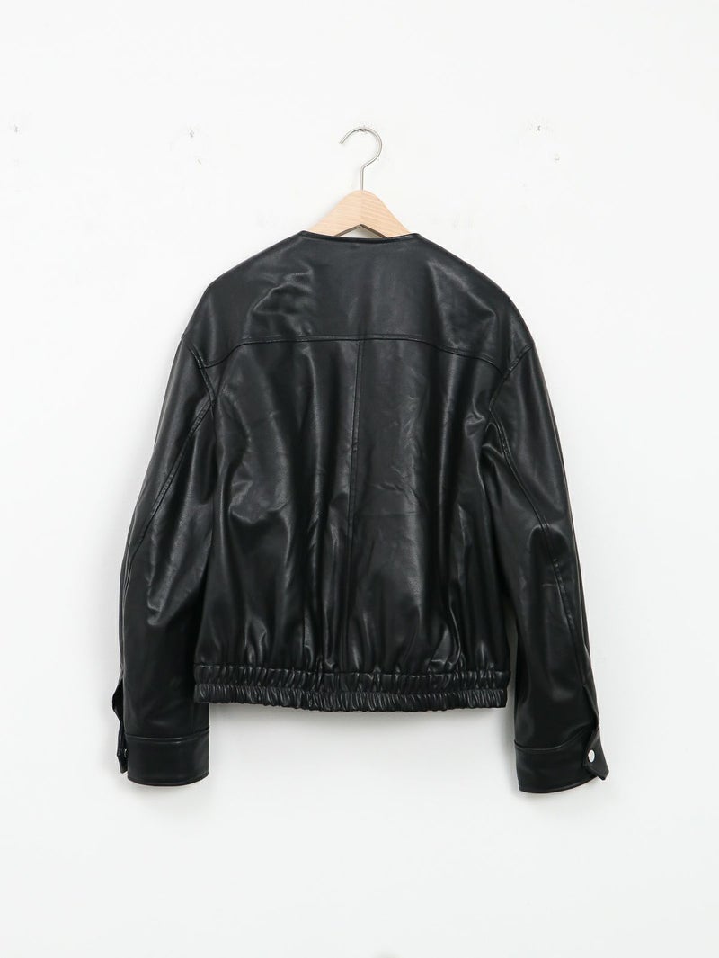 まるで本物のラムレザーのような柔らかさを持つ合皮ブルゾン。 無骨なイメージがあるレザージャケットですが、ノーカラーにして後ろのフォルムを少し丸くすることにより、優しい雰囲気に仕上げています。 本物のレザーより気兼ねなく着れ、軽いのも嬉しいポイントです。 高級感がありつつもどんなスタリングも格上げしてくれ、大人っぽく着こなせる一枚です。