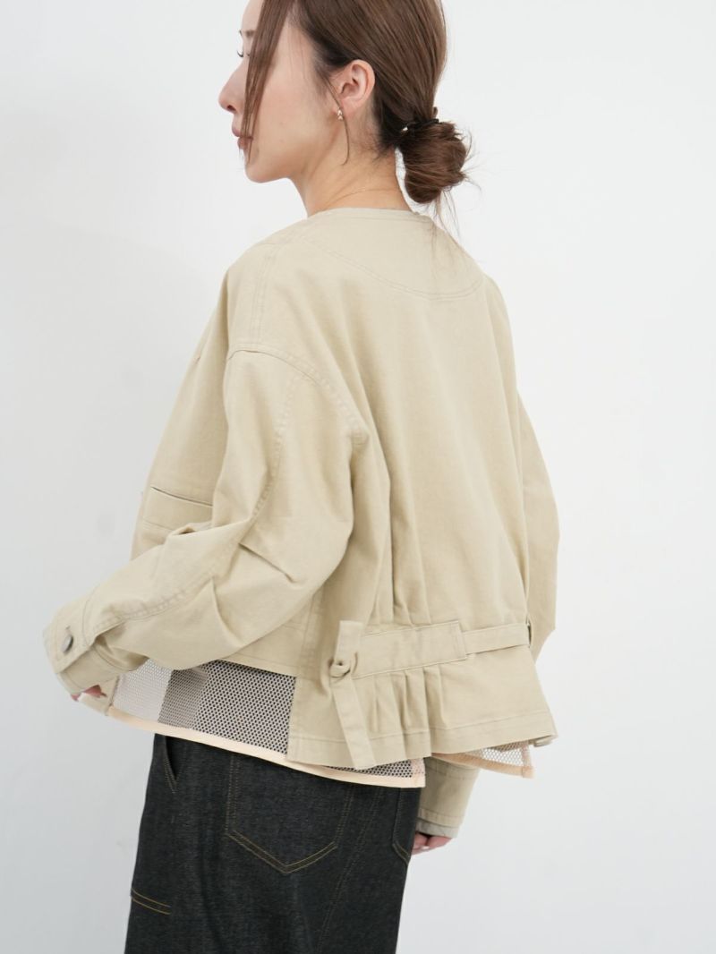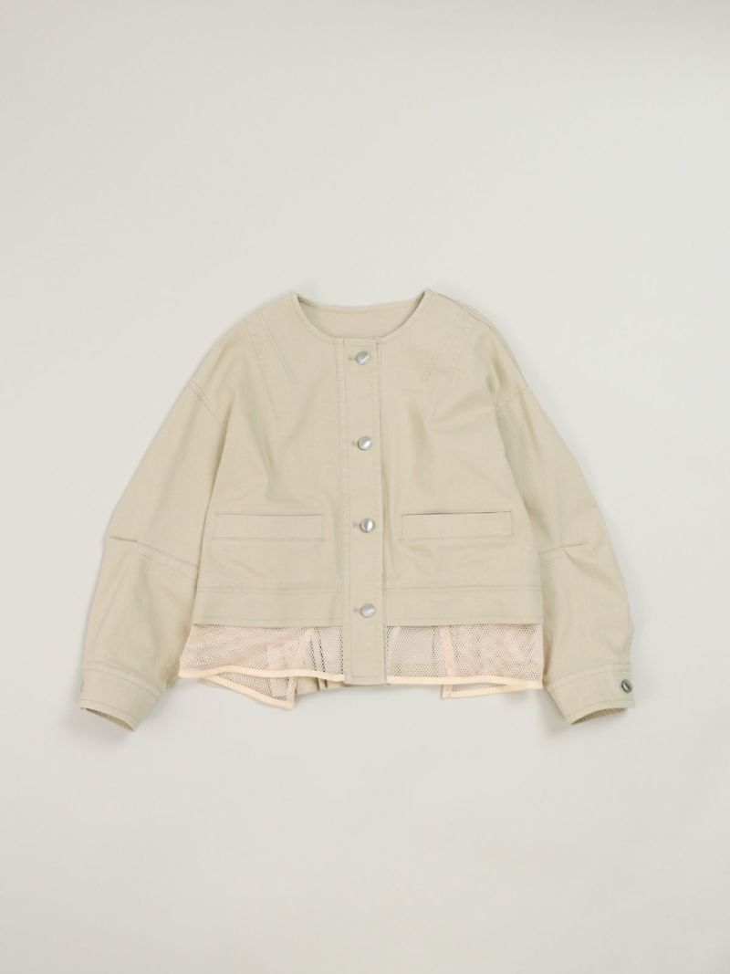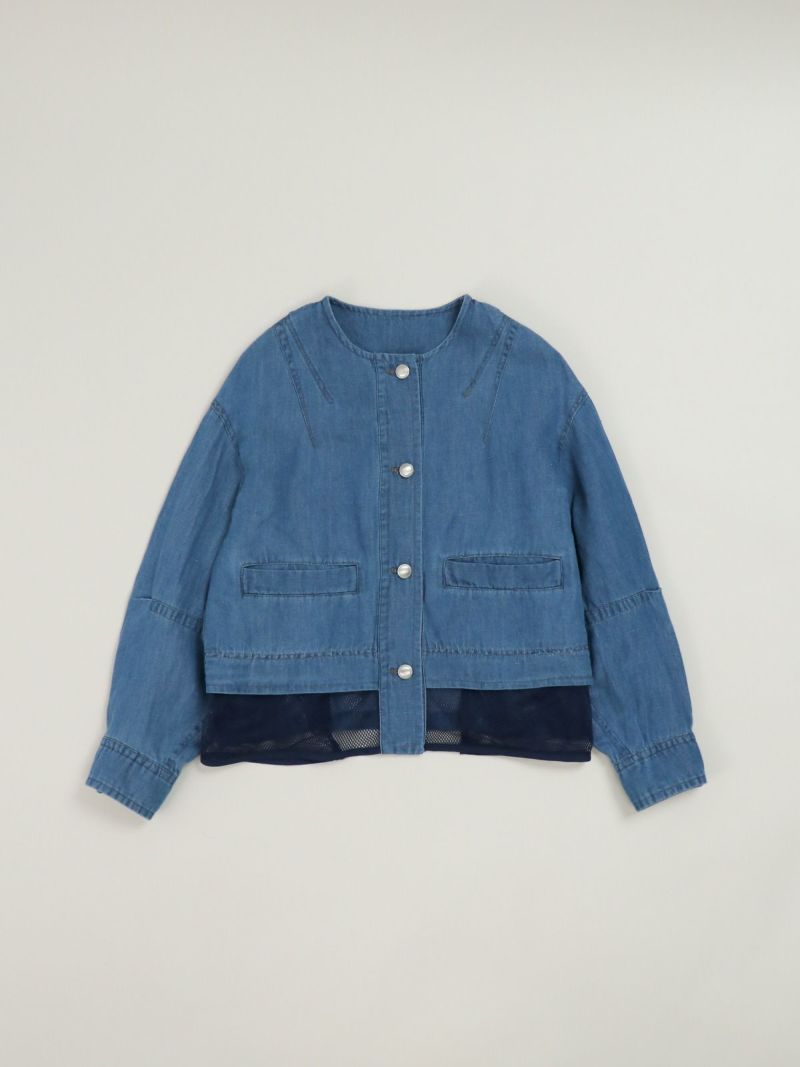 デニム風のノーカラージャケット。 カジュアルの中にもきれい目な印象で、ボトムやインナーで幅広いスタイルを楽しめます。デニム特有の重さがなく、裾のメッシュ効果で見た目にも抜け感があり春らしい軽快なアウターです。