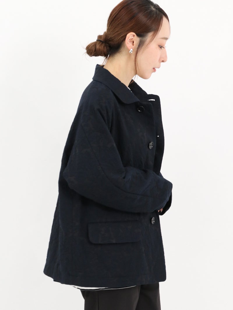 ゆったりとしたAラインシルエットのジャケット。 ラウンドカラーと身頃に配したフラップポケットがクラシックな印象。ネイビーのキャリコジャカード素材は上品で洗練された雰囲気です。