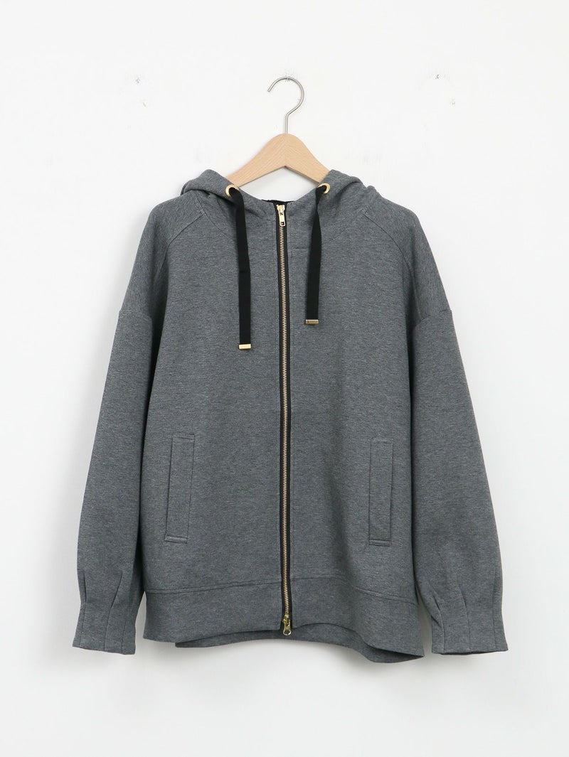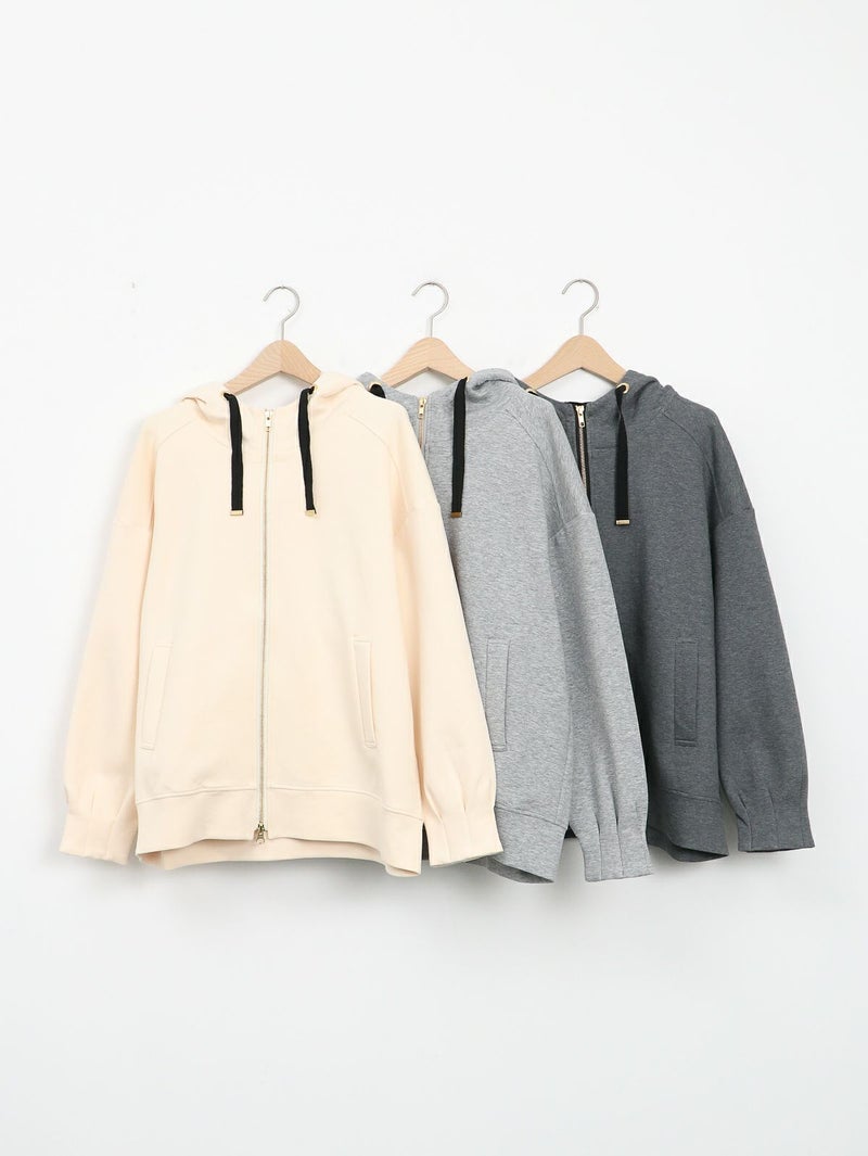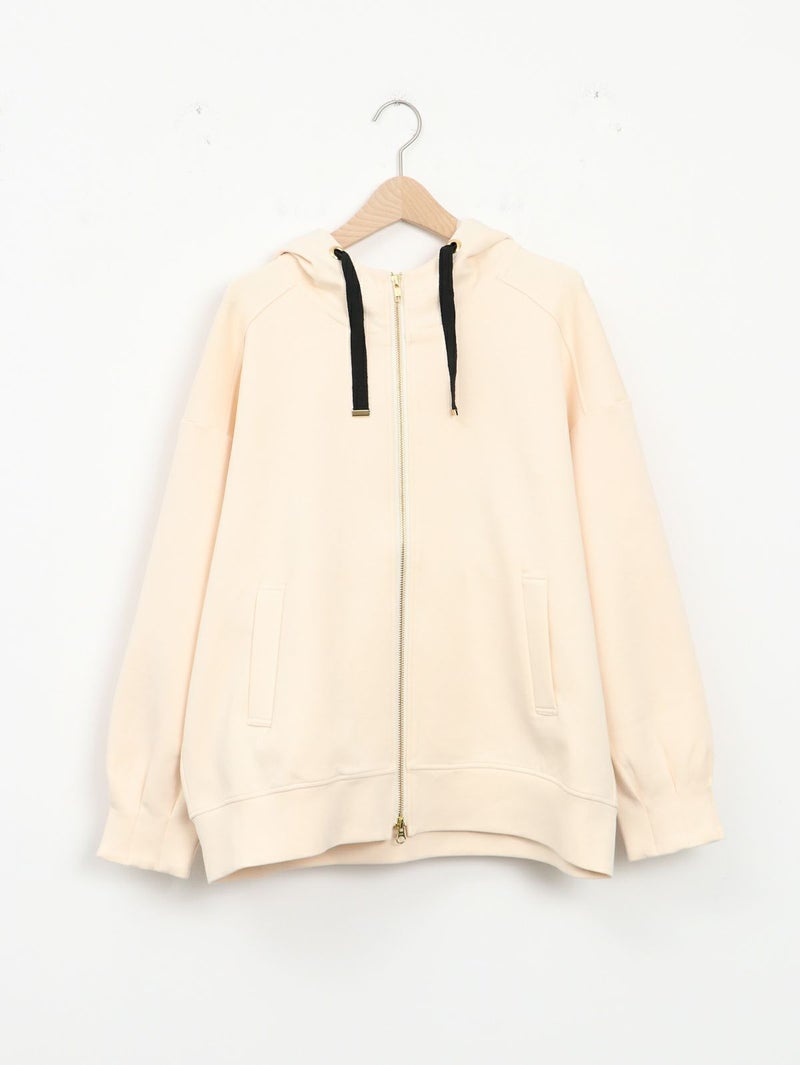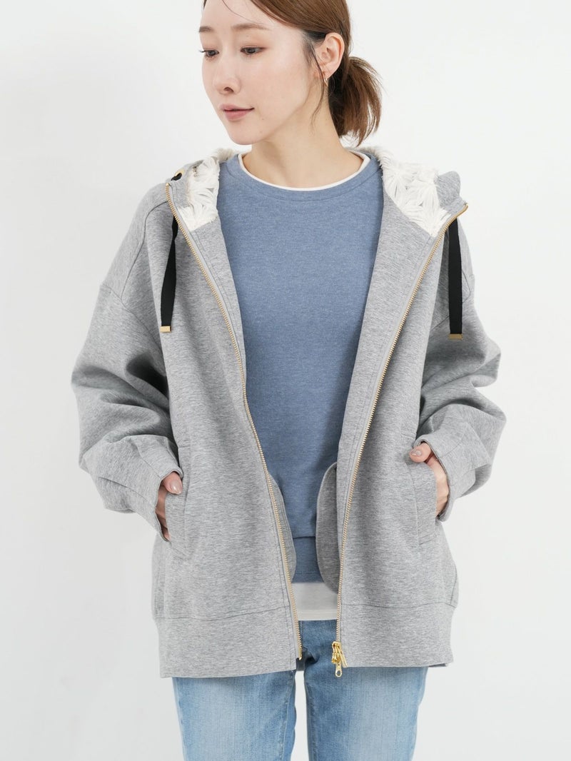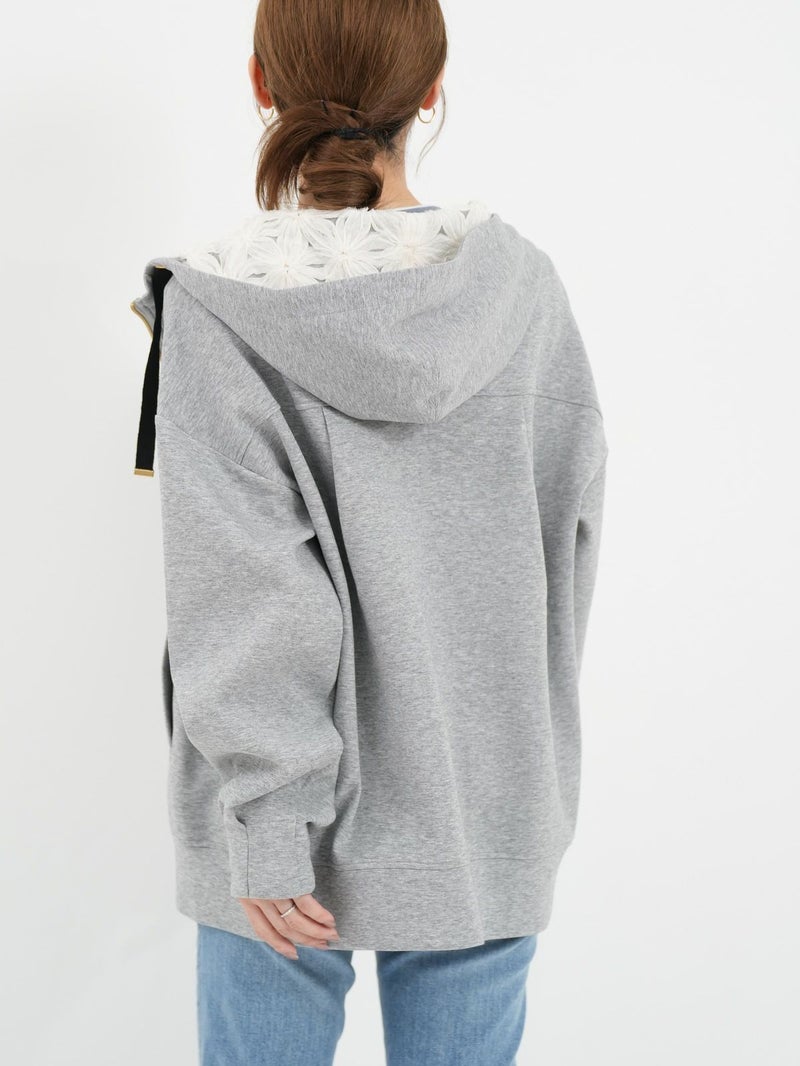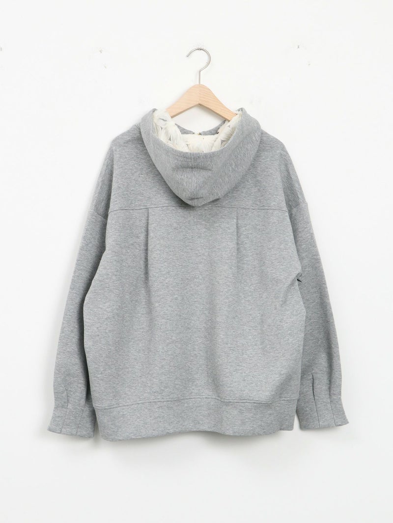 しっかりとした程よい厚みのポンチ素材のパーカーブルゾン。 軽く肌触りの良さが特徴です。フードの内側にフラワーチュールを重ね、さりげなく女性らしさをプラス。ゆったりとしたシルエットで体のラインを拾わず、パンツにもスカートにもバランスよく合わせられる万能ブルゾン。季節の変わり目や、ちょっと羽織りたい日に重宝する一枚です。