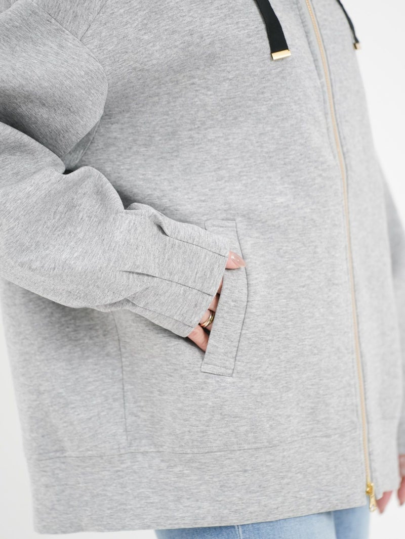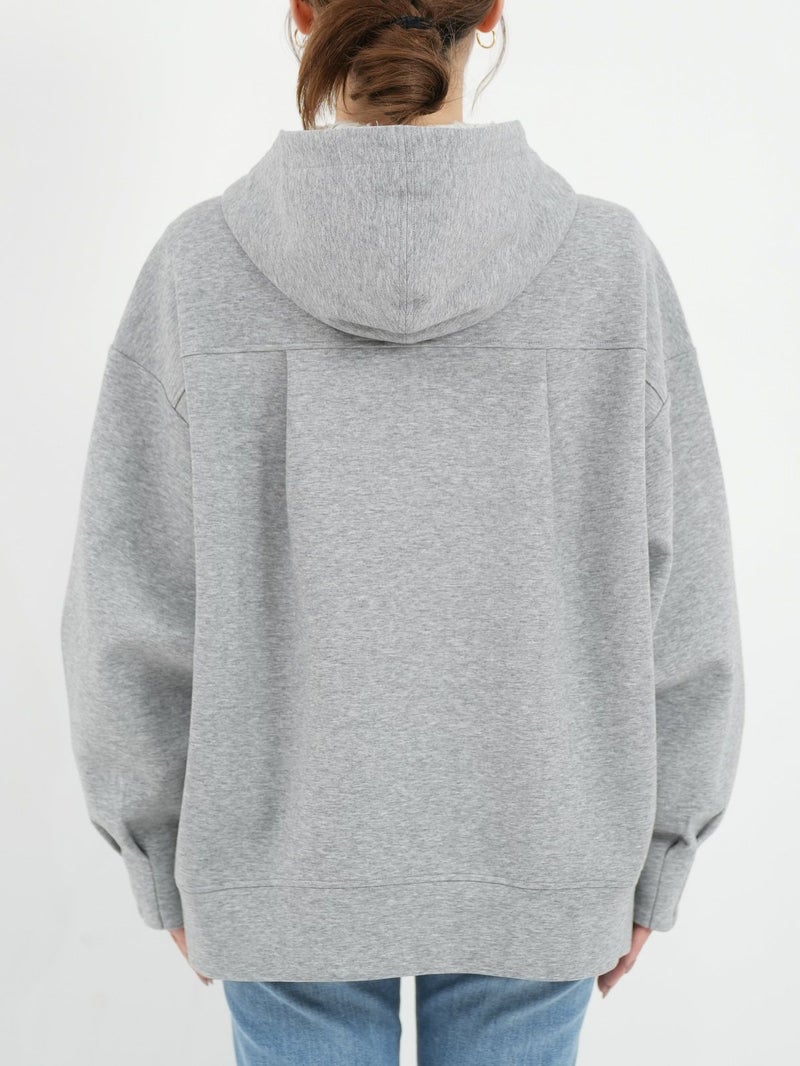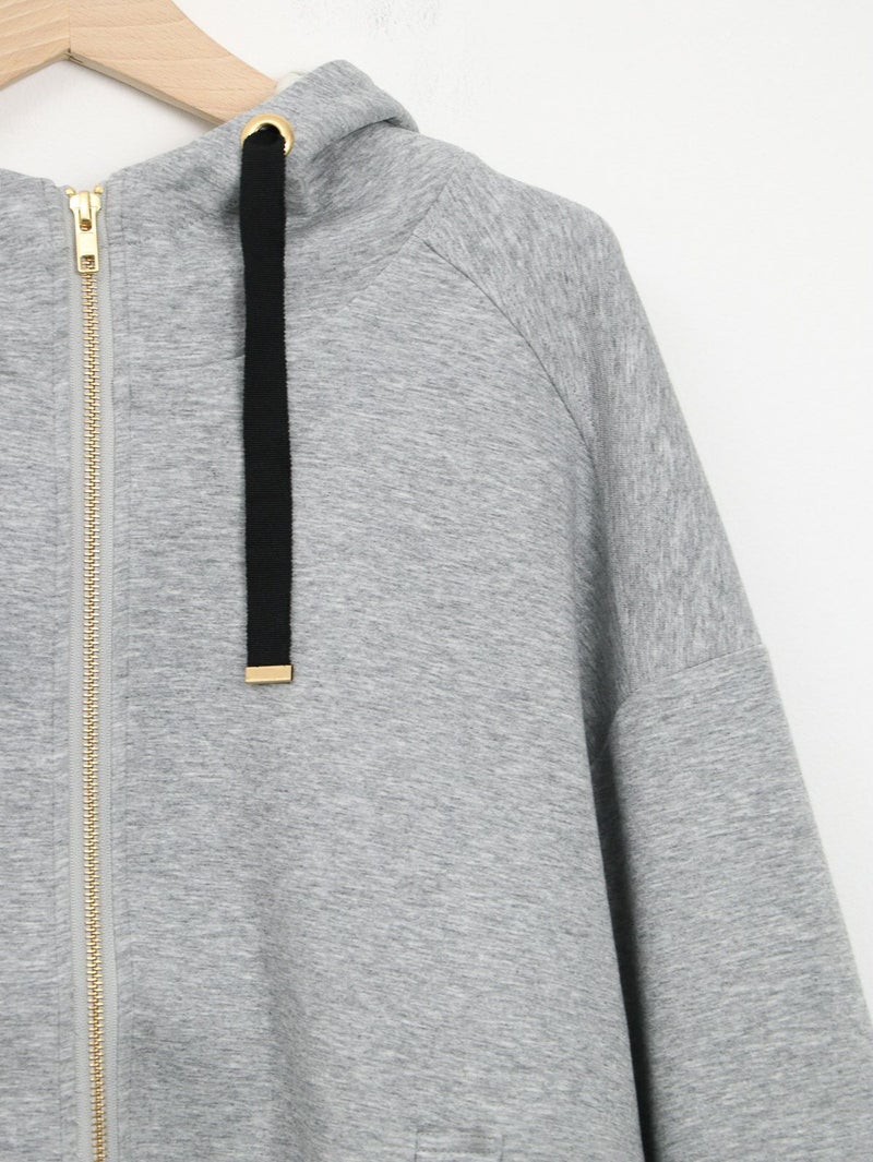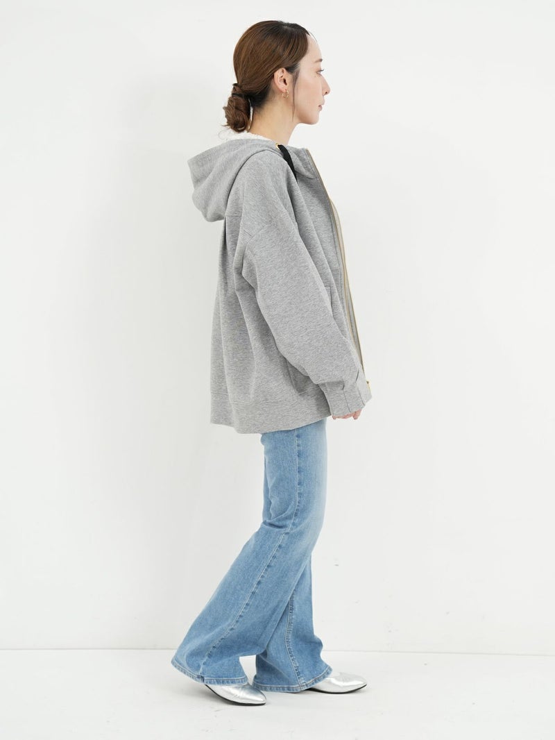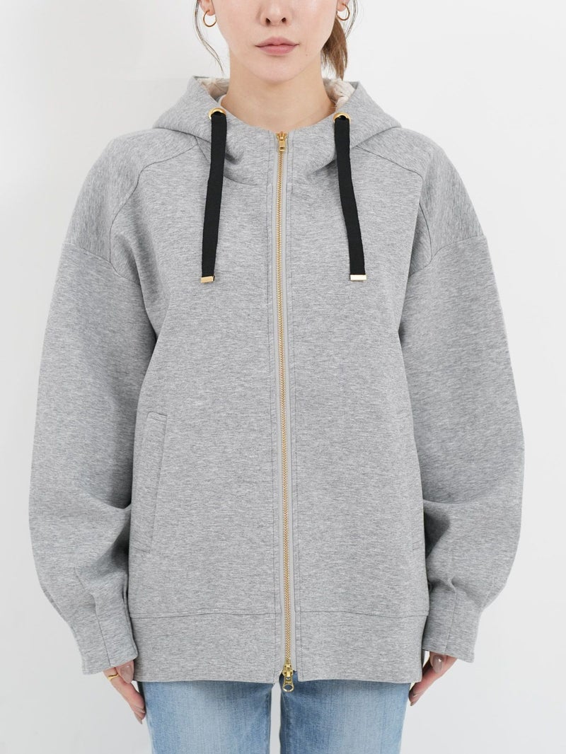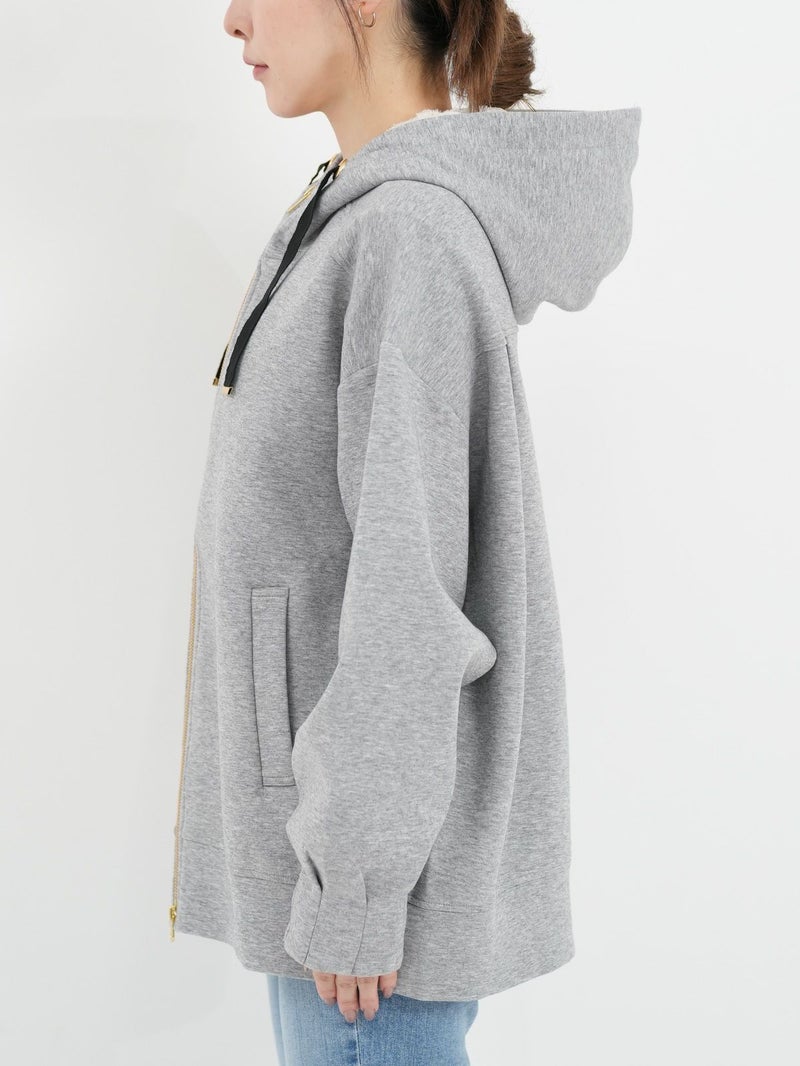 しっかりとした程よい厚みのポンチ素材のパーカーブルゾン。 軽く肌触りの良さが特徴です。フードの内側にフラワーチュールを重ね、さりげなく女性らしさをプラス。ゆったりとしたシルエットで体のラインを拾わず、パンツにもスカートにもバランスよく合わせられる万能ブルゾン。季節の変わり目や、ちょっと羽織りたい日に重宝する一枚です。