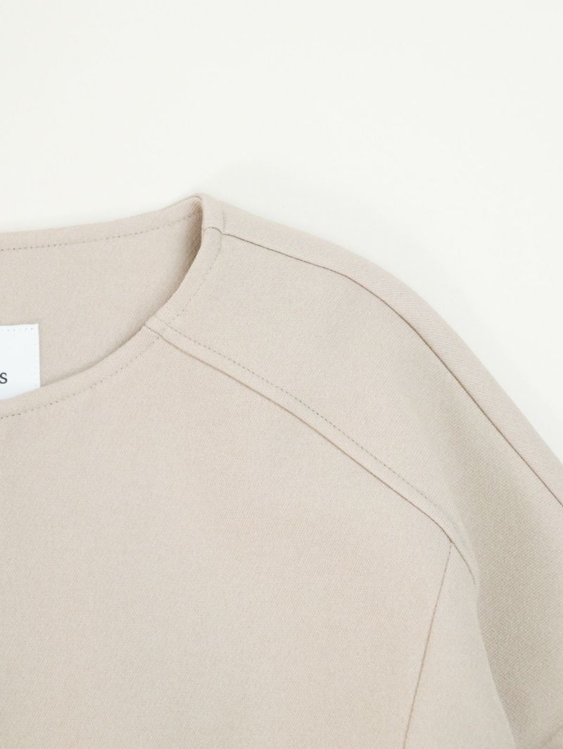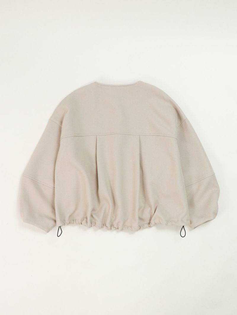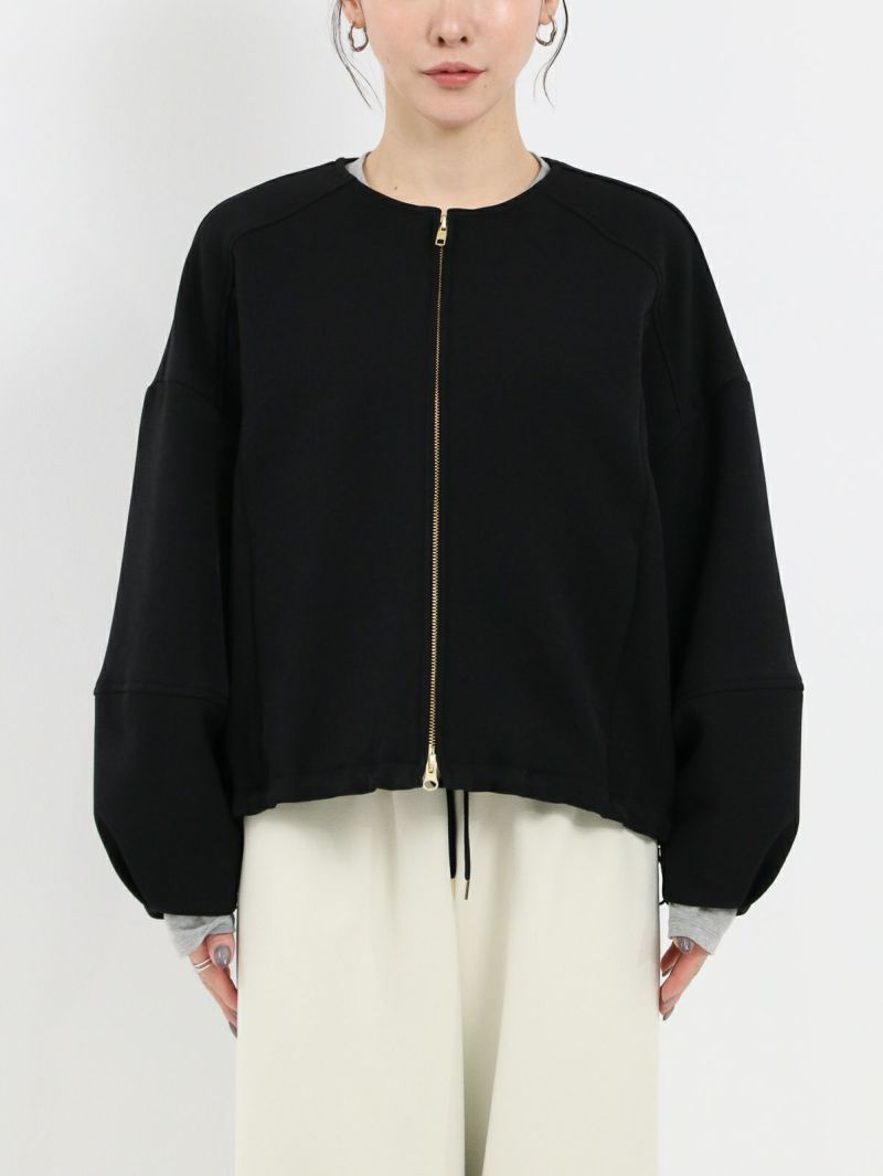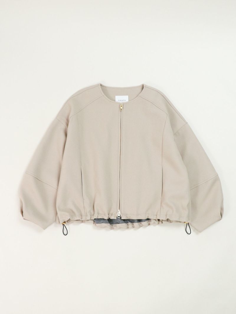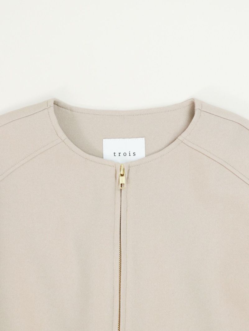 赤外線を効率よく熱に変更することのできるウォーム素材、ナノヒーティングを使用した新素材。ラウンドネックのノーカラーデザインとフロントジップで顔まわりがスッキリ見えます、程良くゆとりのあるボックスシルエットは、ニットやスウェットの上からでも着用しやすいこれからの時期に万能なアウターです。