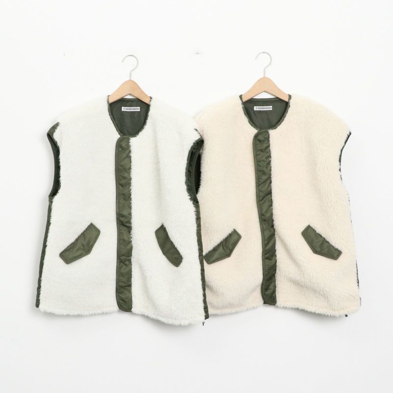 FUKAYA originail のボアドッキングベスト。 今年はより快適に着こなせるベストとして新登場! ボアとナイロンの異素材をドッキングしたデザインです。 トレンド感と機能性を兼ね備えたベストは、 防寒にも優れているため長くご着用いただけます! ノーカラーデザインのため、ストールやインナー選びも楽しめます♩ 裾のドローコードで、シルエットを変化させることも可能です◎
