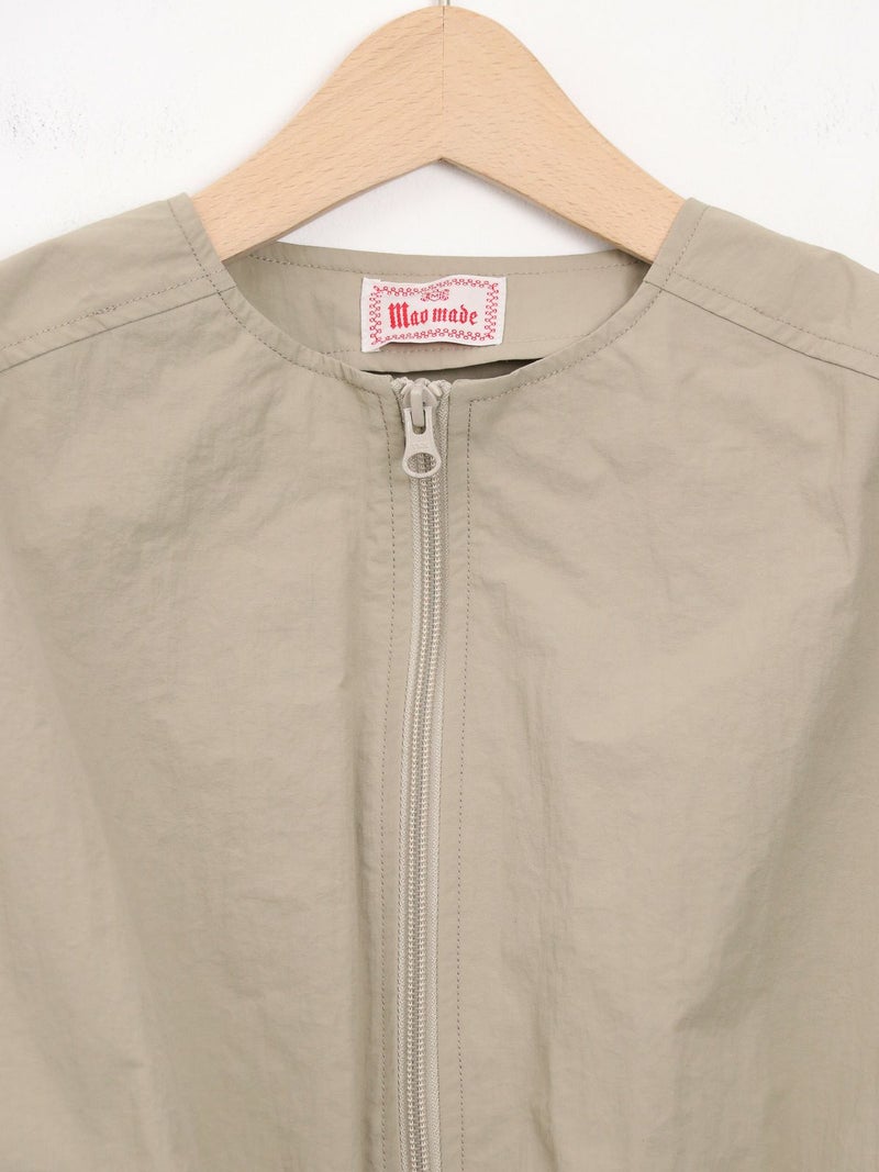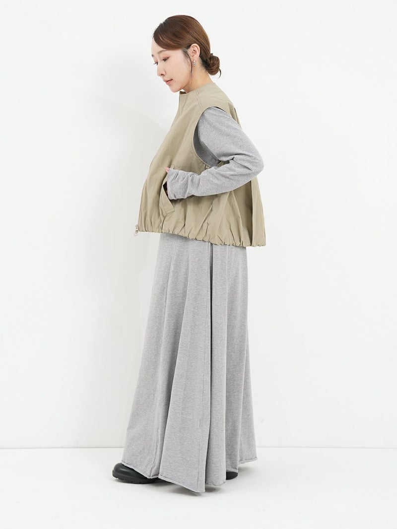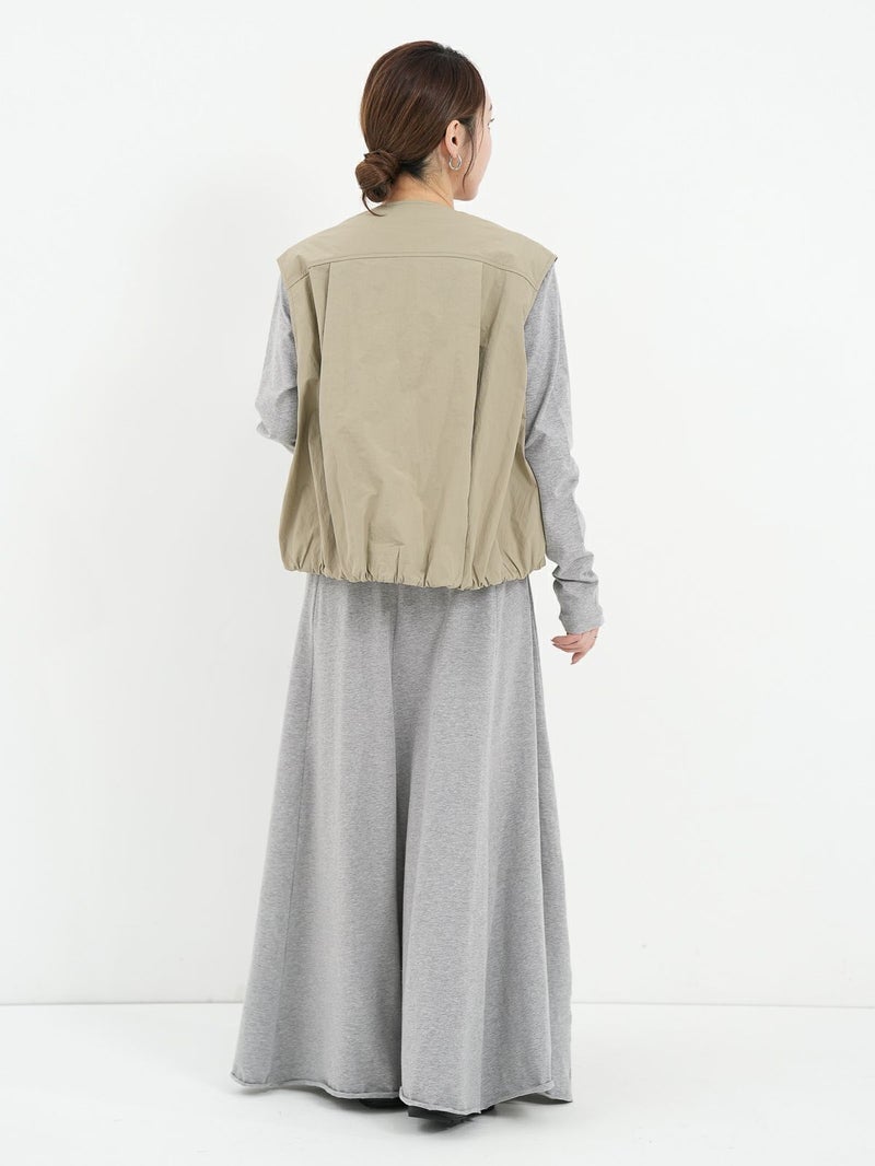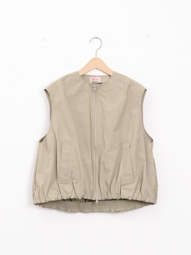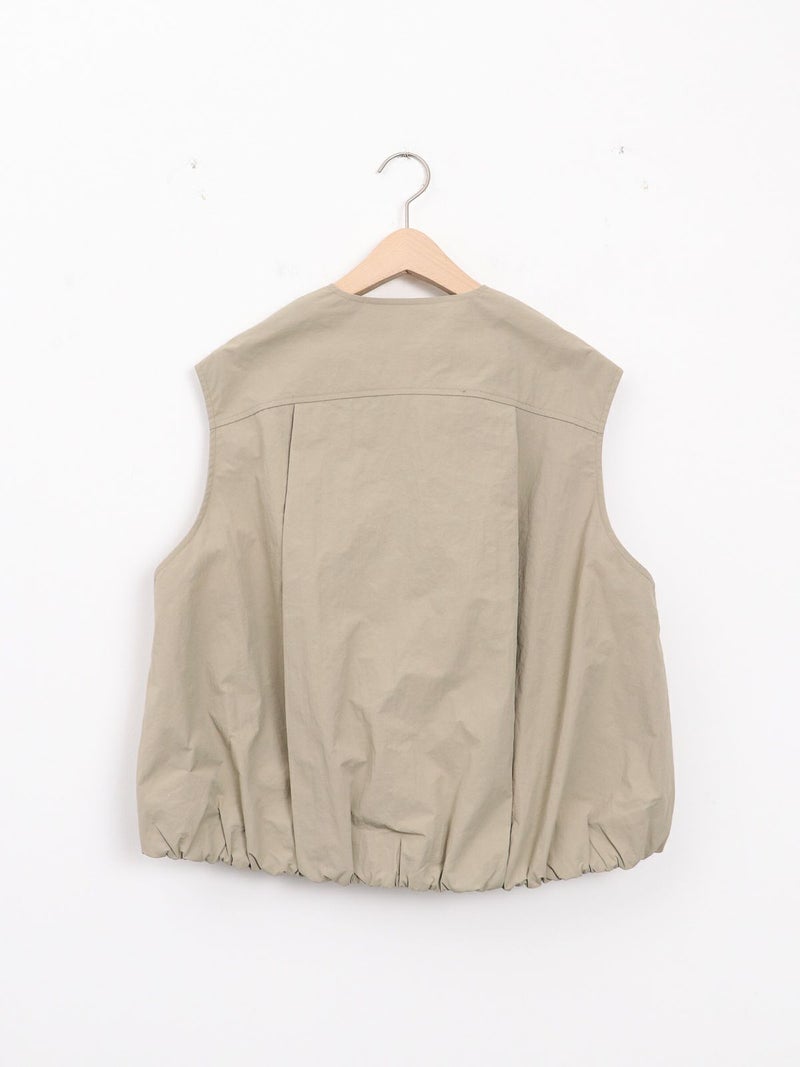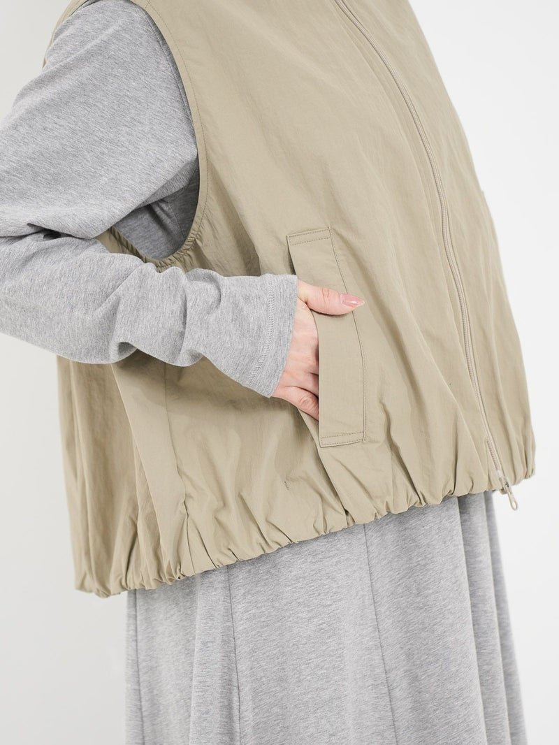 撥水加工を施したバルーンシルエットのベスト。 軽やかな着心地で、春のコーディネートにさっと取り入れたい一枚です。裾は絞りのあるデザインで、スカートにもデニムにも好相性。ナイロン100%のしっかりとした生地感で、デイリー使いはもちろん、シーズンレスに着回しを楽しめます◎
