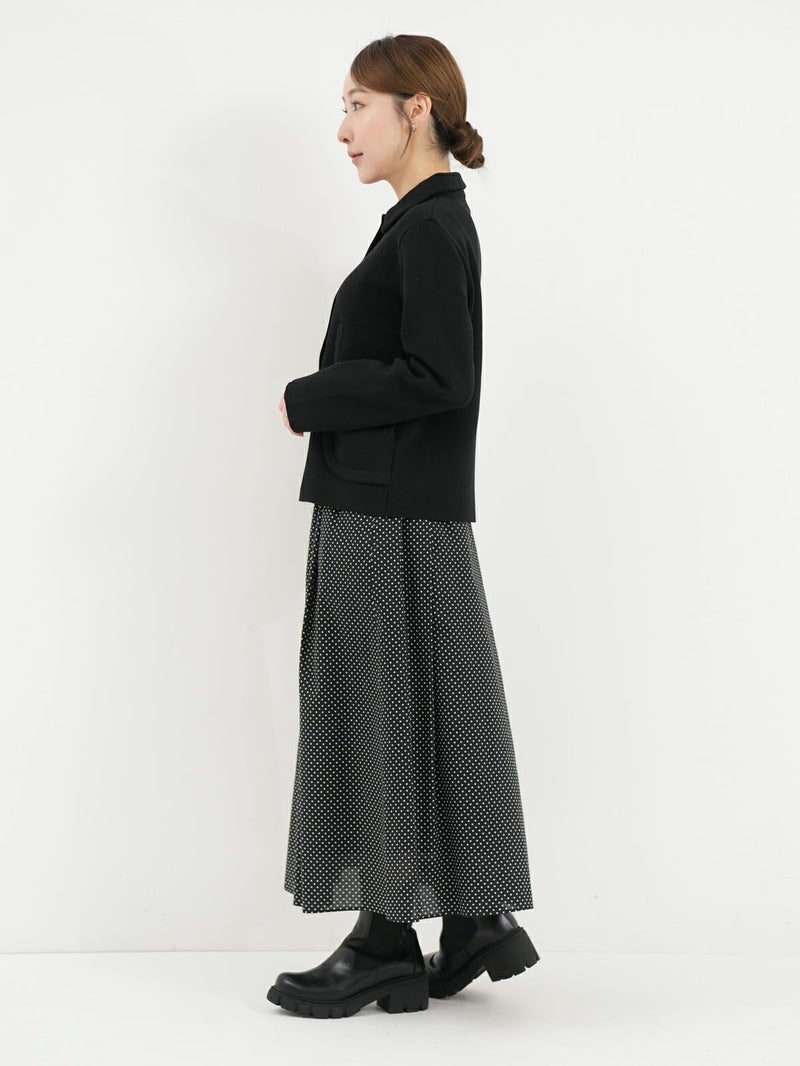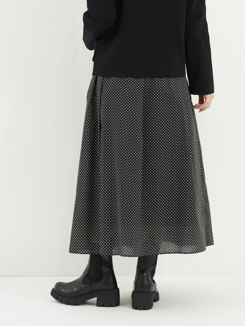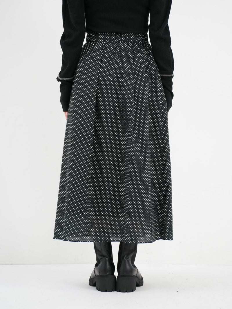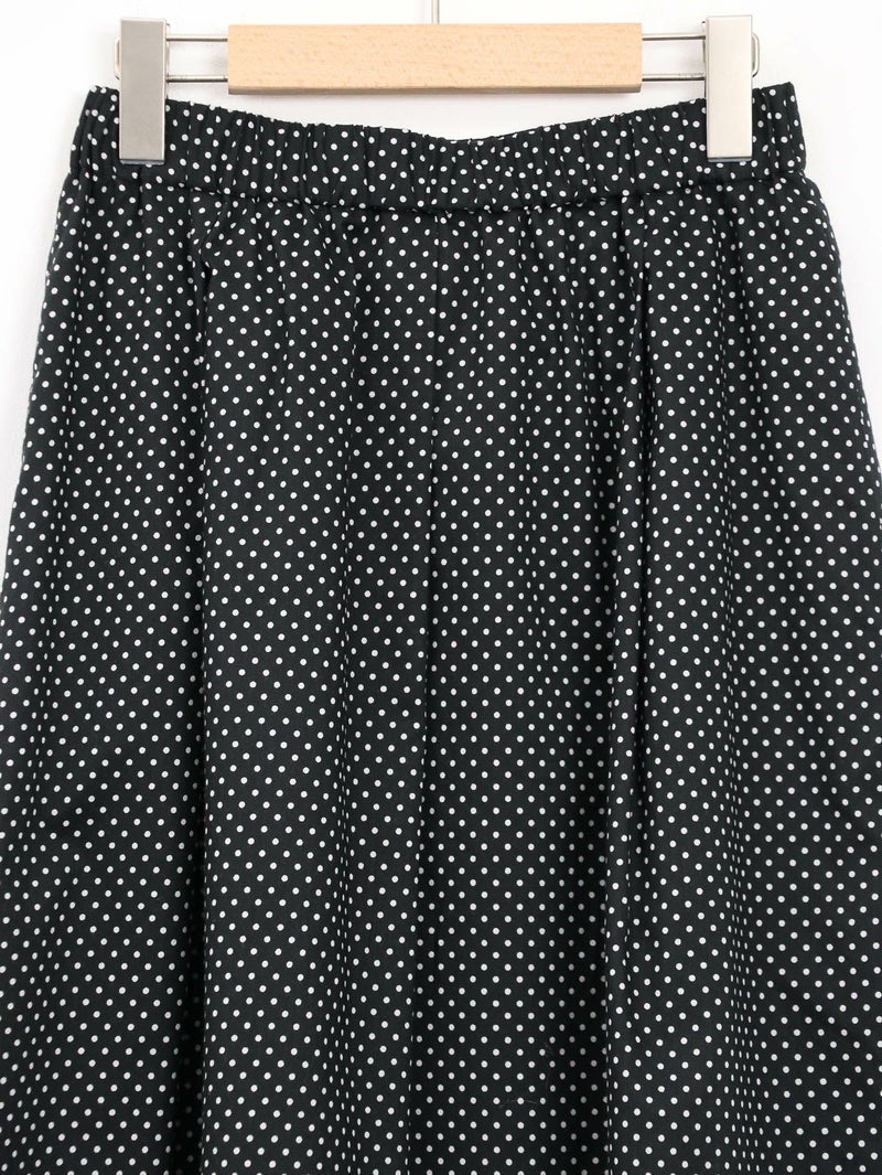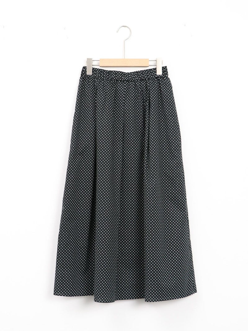 ドット柄が目を惹く、ギャザースカート。 少しツヤ感のある薄手のコットン100%素材。ウエストのタックギャザーが程よく広がり、ふんわりとした女性らしいシルエット。今の時期はスウェットやニットと合わせて、春先はブラウスなどとの合わせもおすすめです。