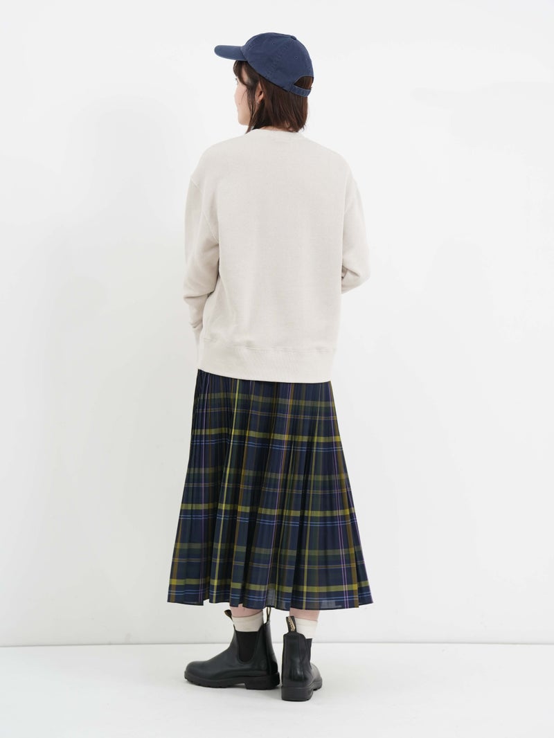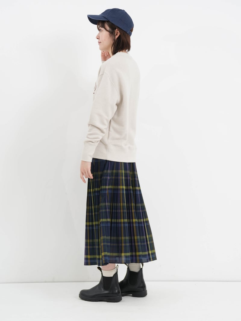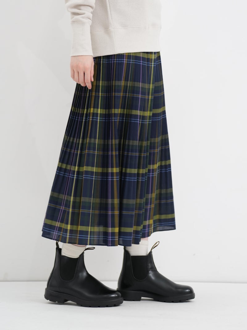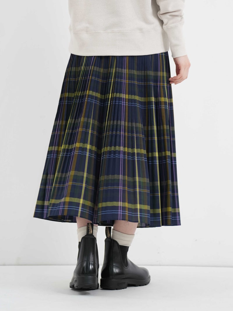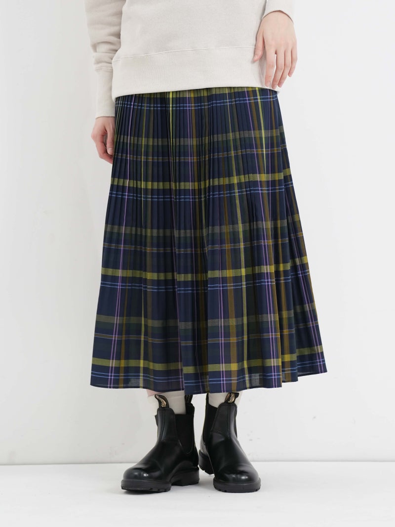 細かなプリーツが印象的なビックチェックプリーツスカート。 程よくハリのある生地感、トラッド感のあるビックチェックのデザインがコーディネートに華やかな印象を与えてくてます。軽やかな着心地で、ウエストは総ゴムの施しとなっており内紐で調節も可能です。