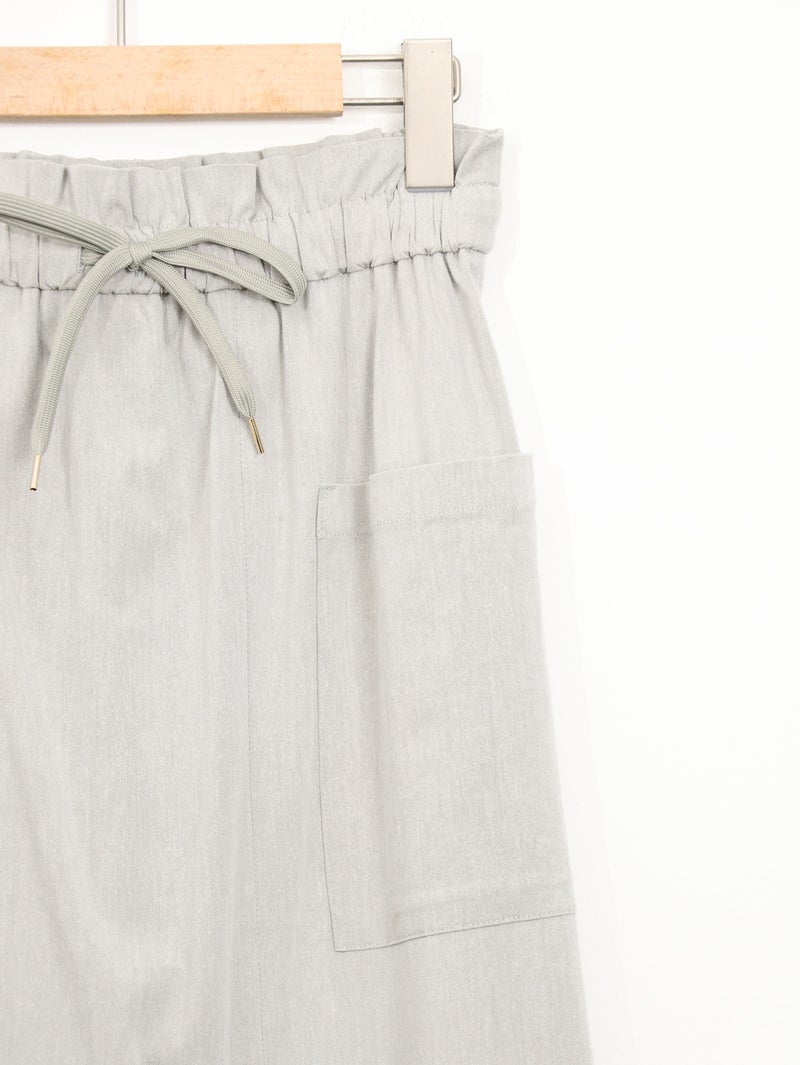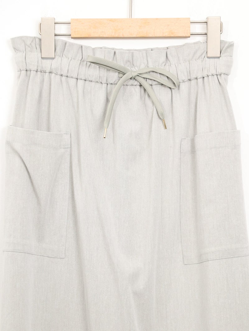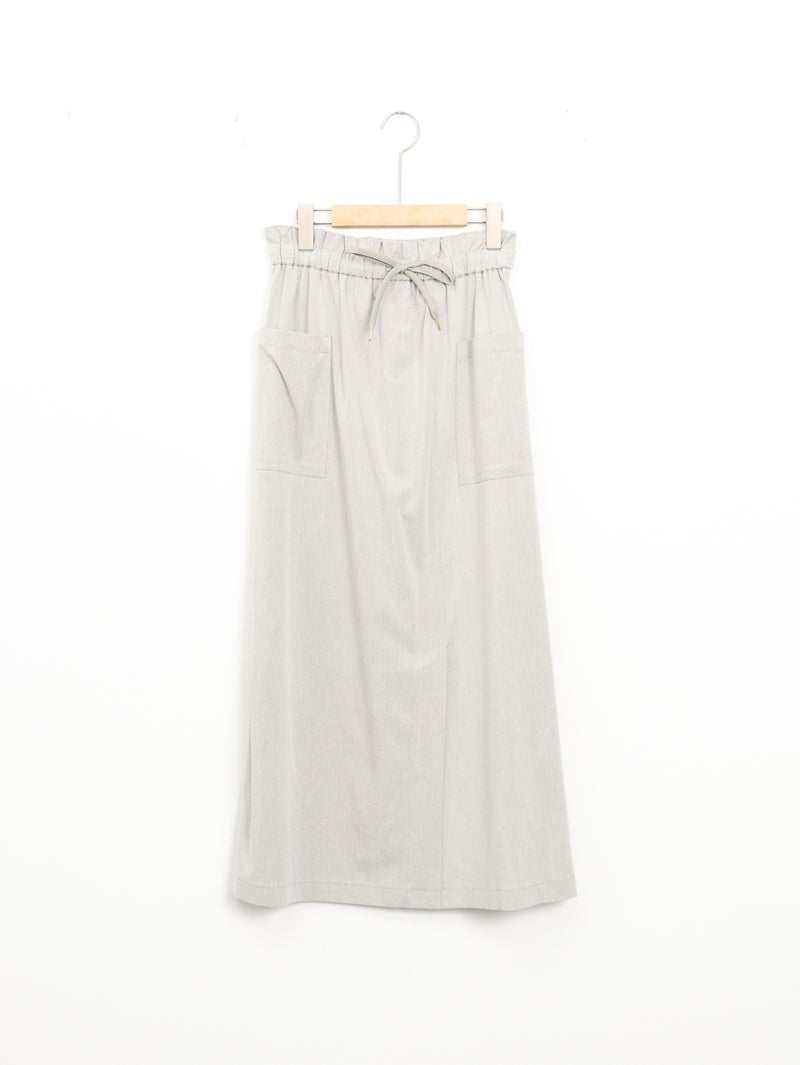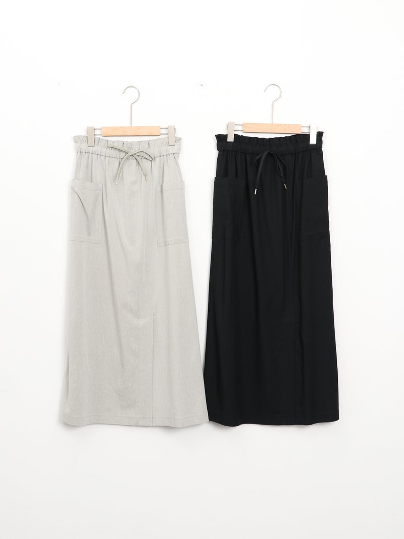 スッキリ見えする程よいシルエットで、体のラインを気にせず着用できるスカート。 ストレッチ生地を使用し、動きやすくノンストレスな着用感。 ウエストはゴム+紐のイージー仕様で、フロントのやや左寄りに入ったスリットが程よくアクセントになり、足さばきもスムーズです。