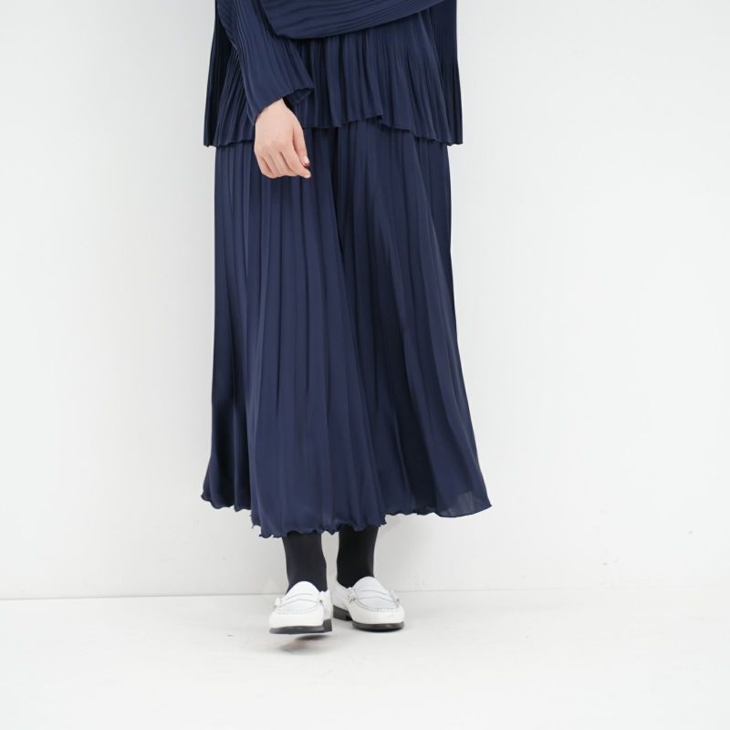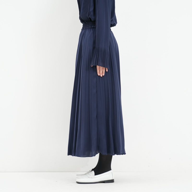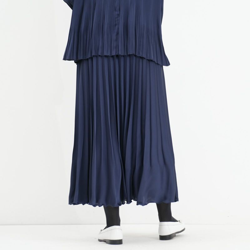 国内外の有名ブランドなどで活躍されているデザイナーからも支持されている福岡のプリーツ専門メーカーオザキプリーツで生産したアイテム。 華やかな光沢感とソフトな風合いが上品なプリーツのトップスとロングスカート。ロングスカートは裾消しプリーツで軽やかな表情があります。プリーツブラウス(BD_FK24S-019) と同素材で作っているため、セットアップでの着用がオススメです。オケージョンシーンでもお召いただけます。