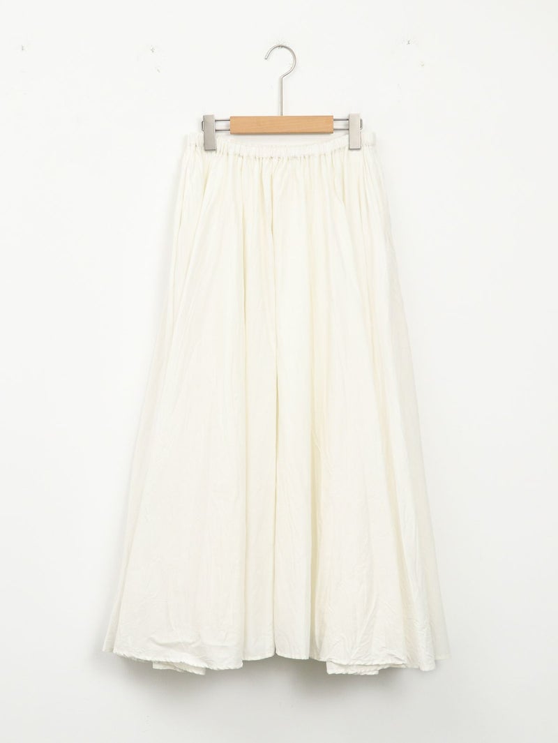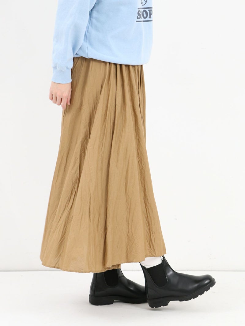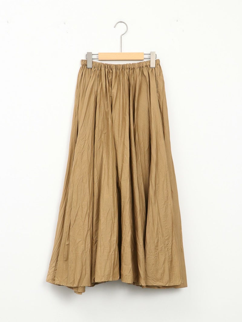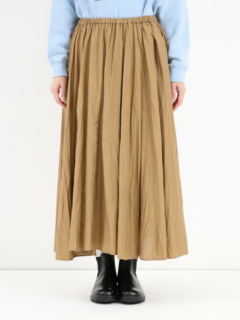 目の細かい薄手の生地にキャンブリック仕上げ(艶を出したあとに糊付けし、自然な艶をだす方法)を施したギャザースカート。 たっぷりと入ったギャザーは、ボリューム感がありながらも、縦に絞りをいれることでボリューム感がおさえられます。今回は秋らしいカラーをご用意。残暑でも涼しく先取りできます。