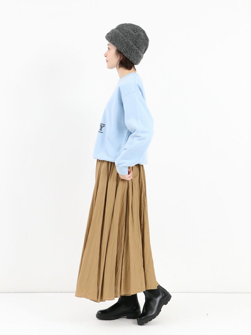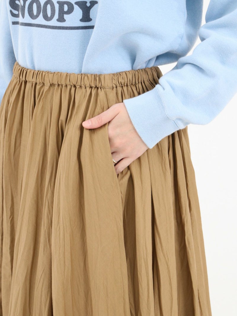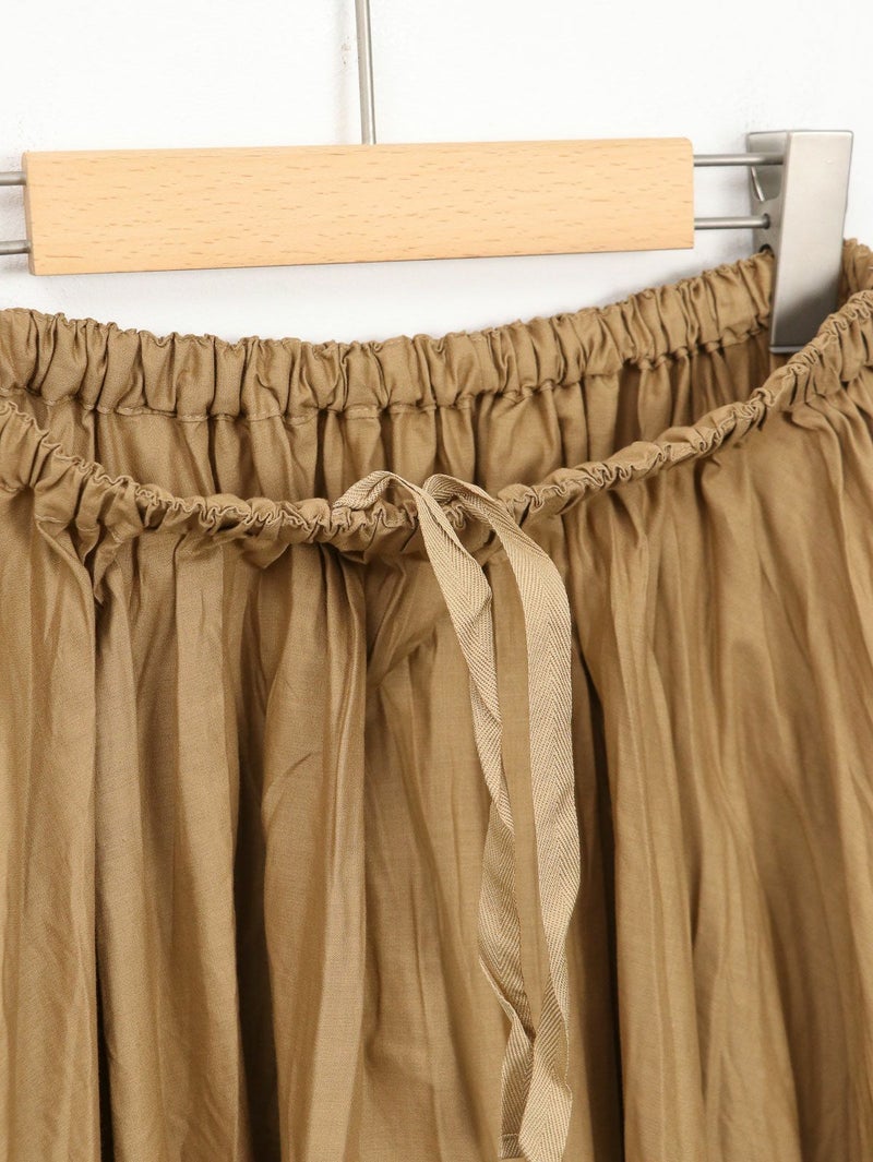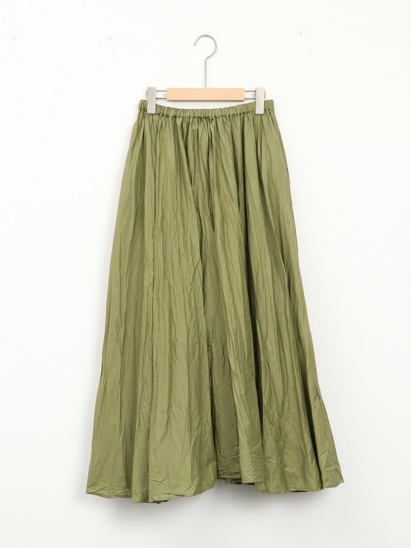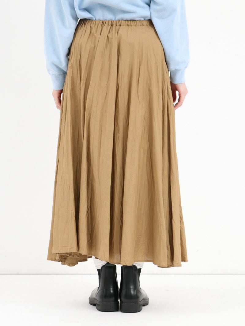 目の細かい薄手の生地にキャンブリック仕上げ(艶を出したあとに糊付けし、自然な艶をだす方法)を施したギャザースカート。 たっぷりと入ったギャザーは、ボリューム感がありながらも、縦に絞りをいれることでボリューム感がおさえられます。今回は秋らしいカラーをご用意。残暑でも涼しく先取りできます。