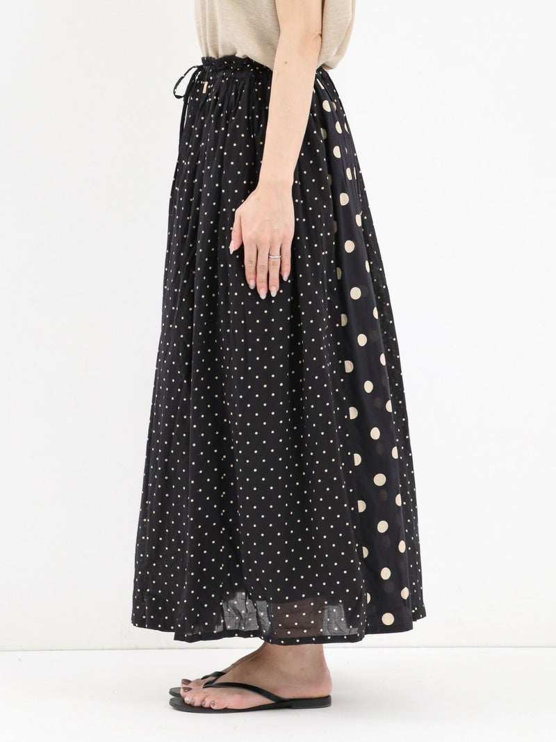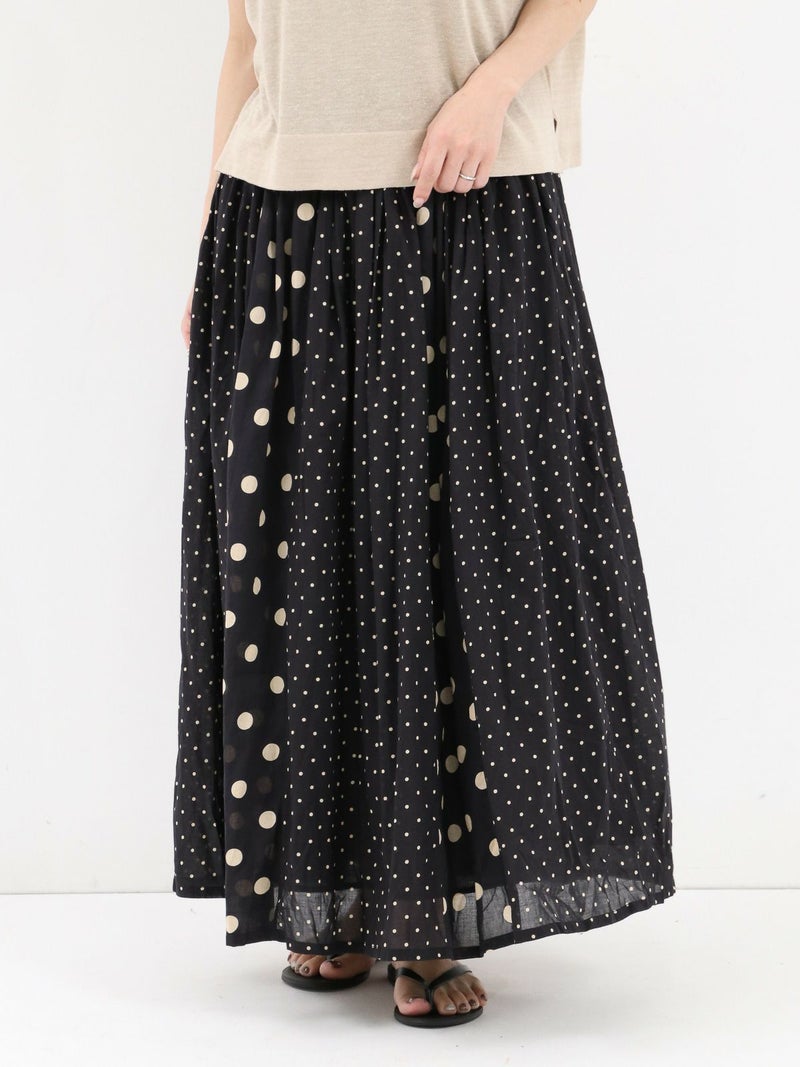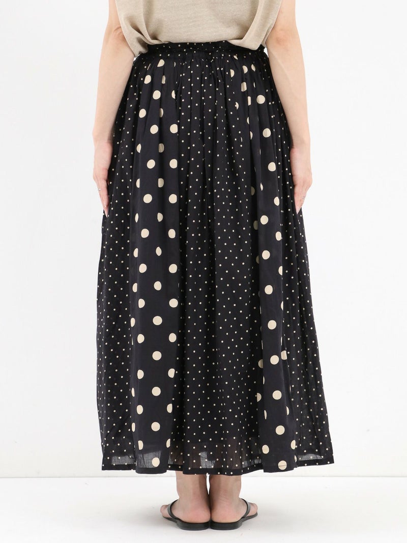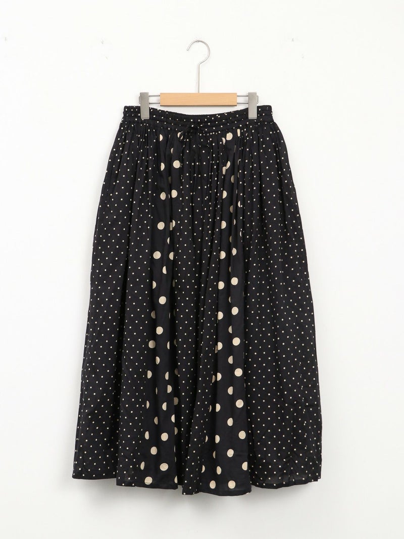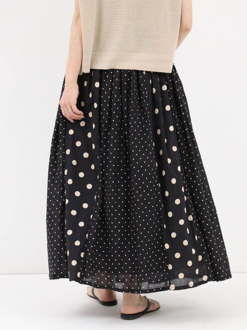 SOILのコットンボイルドットプリントギャザースカート。 大小のドットを組み合わせてあり、歩いている時の揺れ感が魅力。コットンの裏地付きで素肌に触れても心地よい涼やかに着用できる1枚です。