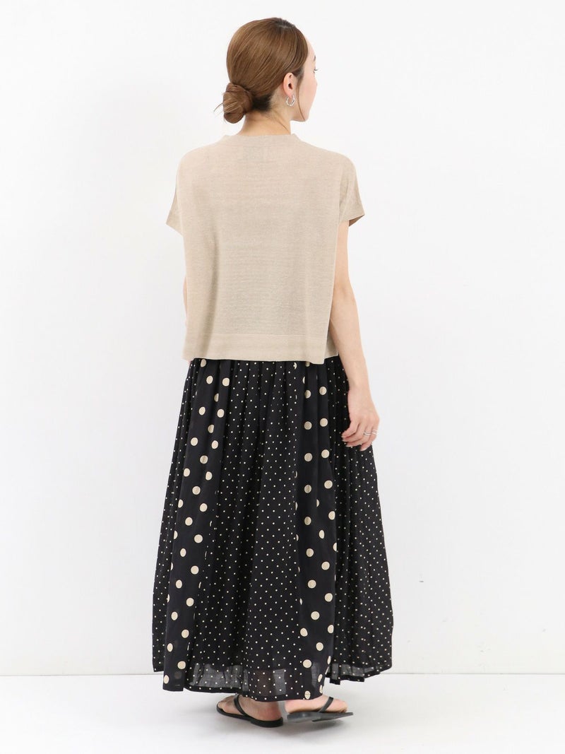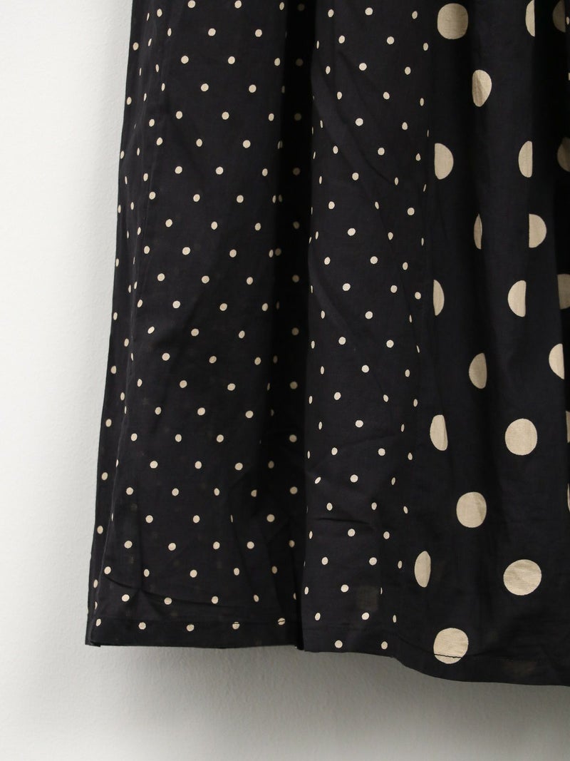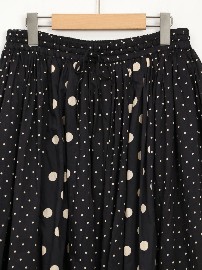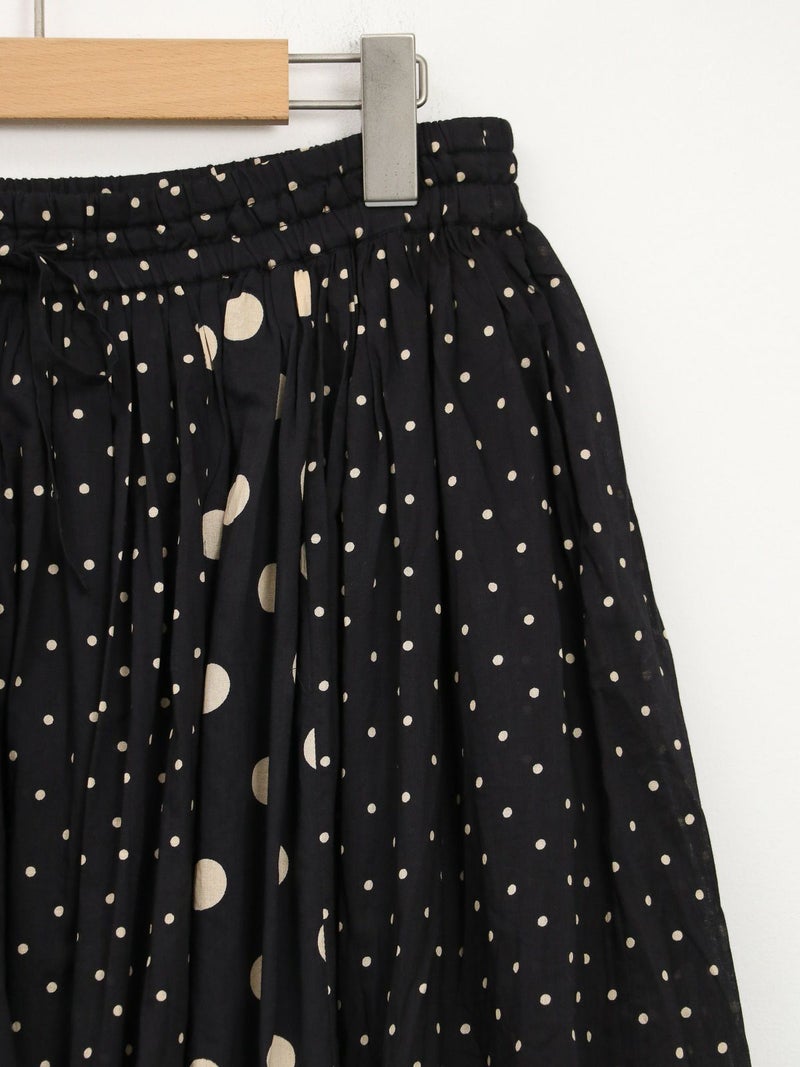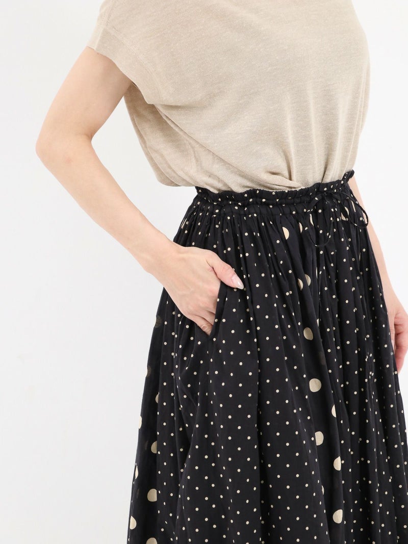SOILのコットンボイルドットプリントギャザースカート。 大小のドットを組み合わせてあり、歩いている時の揺れ感が魅力。コットンの裏地付きで素肌に触れても心地よい涼やかに着用できる1枚です。