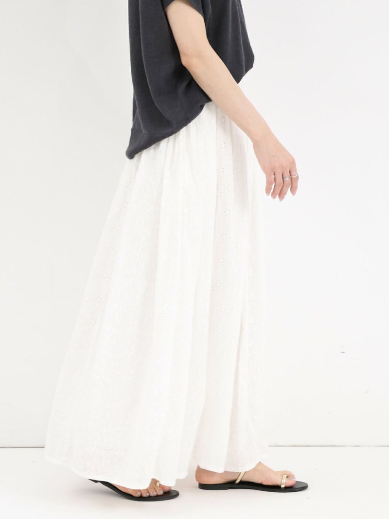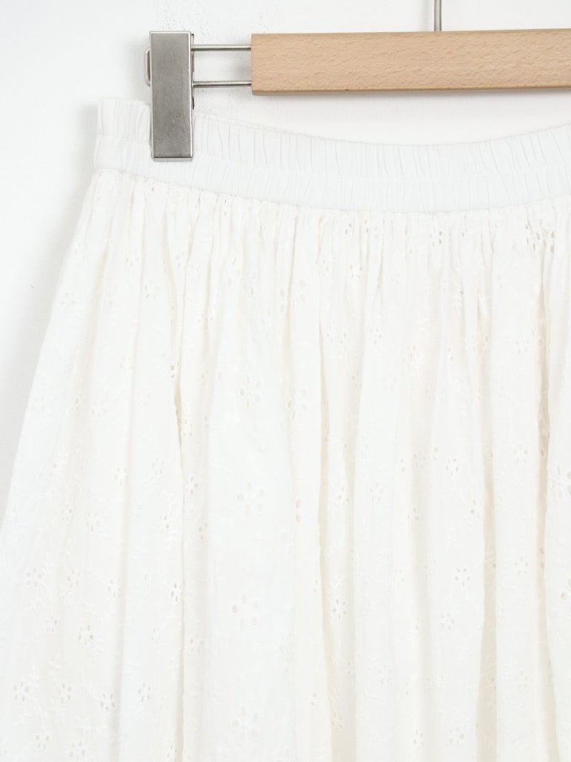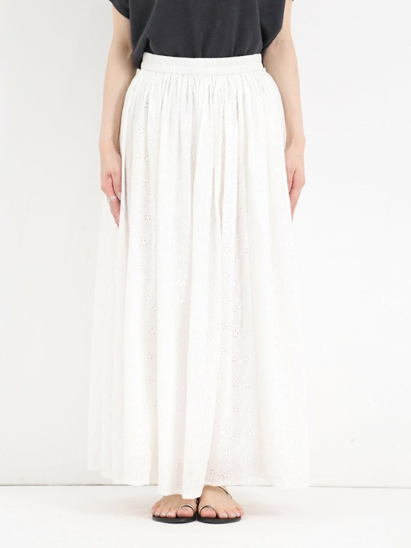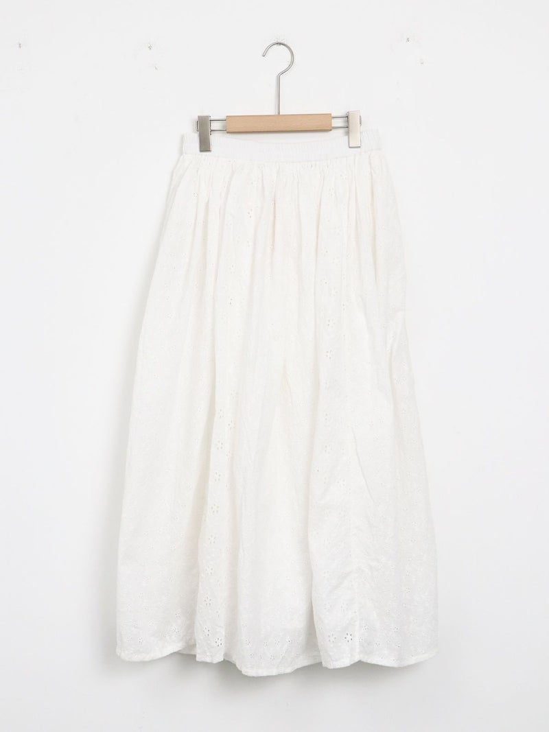 大小異なる2種類のヘムラ刺繍の生地を、パッチワークで仕立てたギャザースカート。 カラーを統一させた刺繍は華やかさがあり、裏地付きで透け感を気にせず着ていただけます。両サイドにはポケット付き。