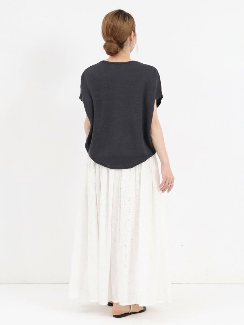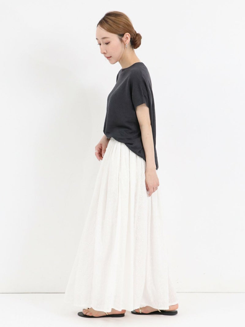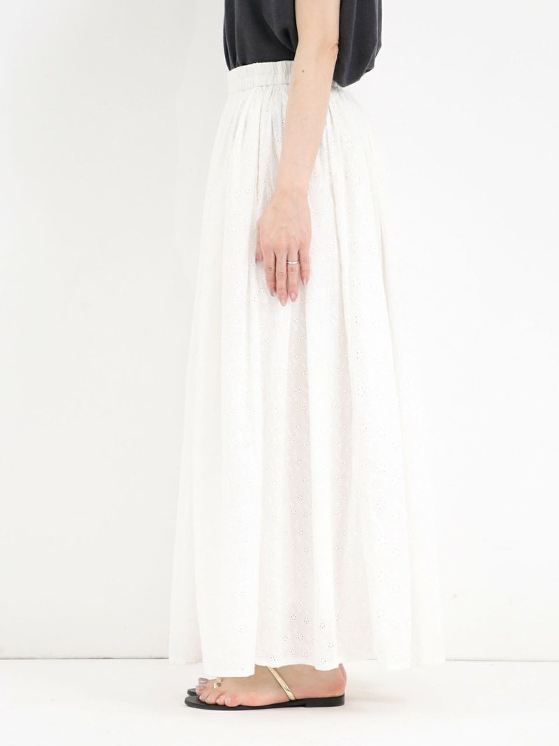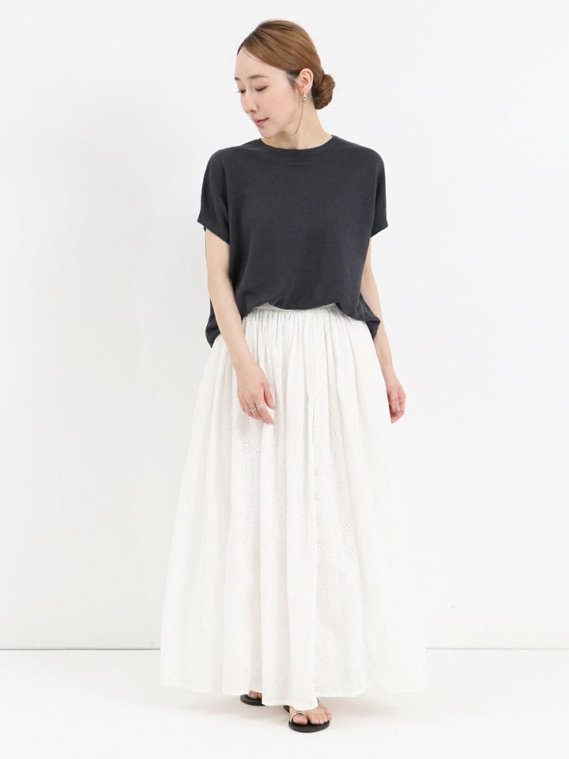 大小異なる2種類のヘムラ刺繍の生地を、パッチワークで仕立てたギャザースカート。 カラーを統一させた刺繍は華やかさがあり、裏地付きで透け感を気にせず着ていただけます。両サイドにはポケット付き。