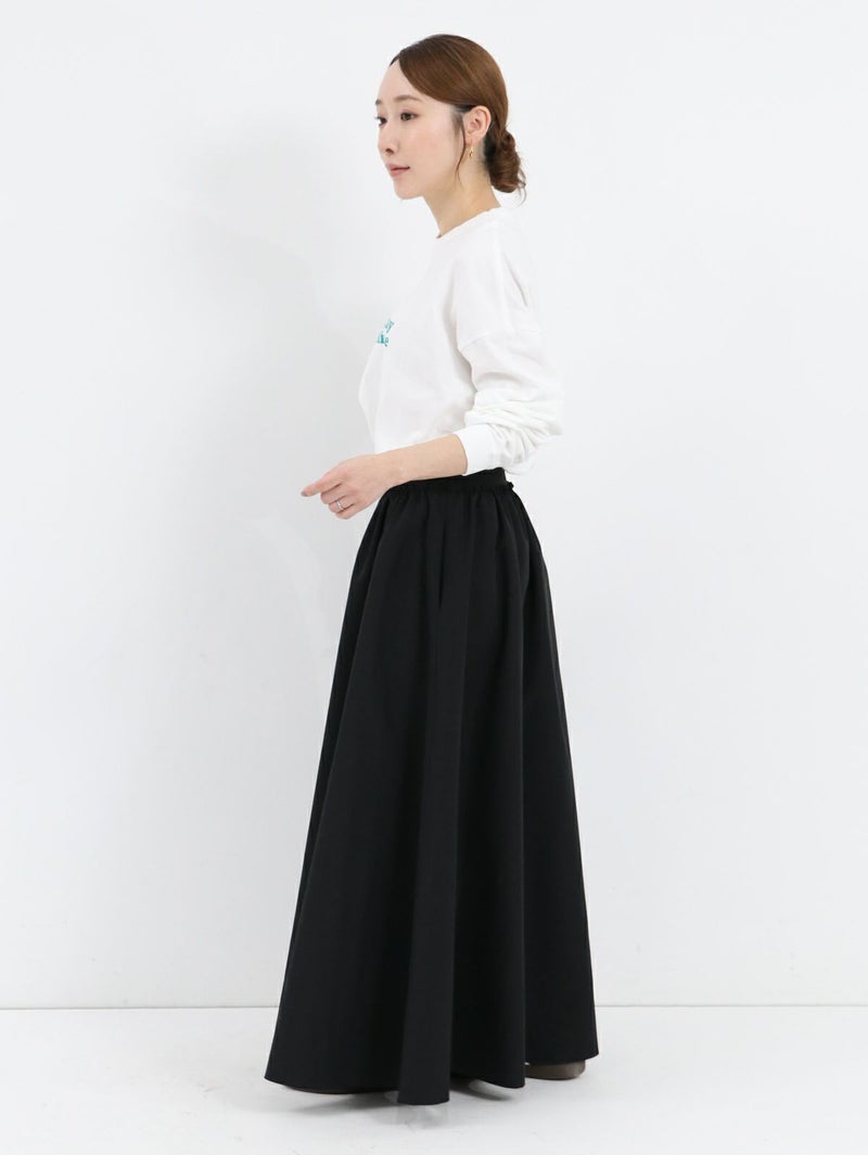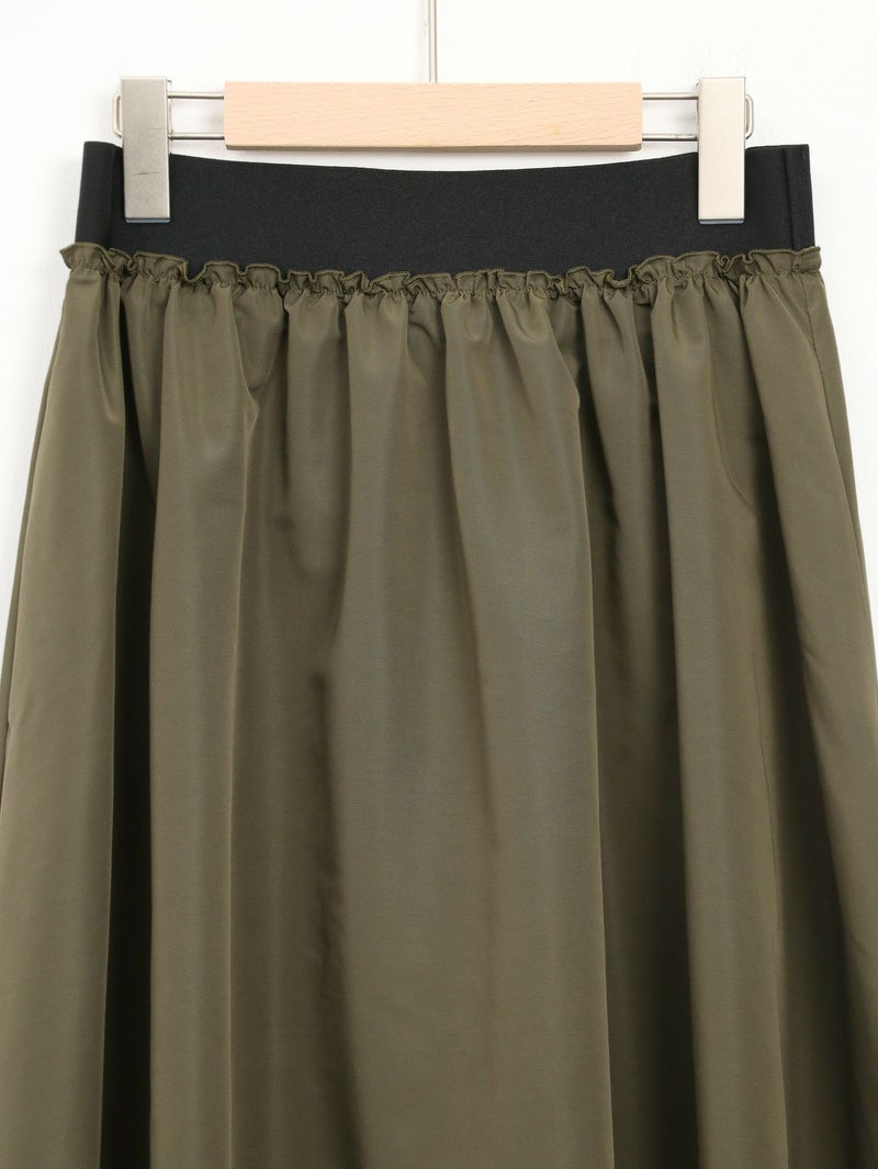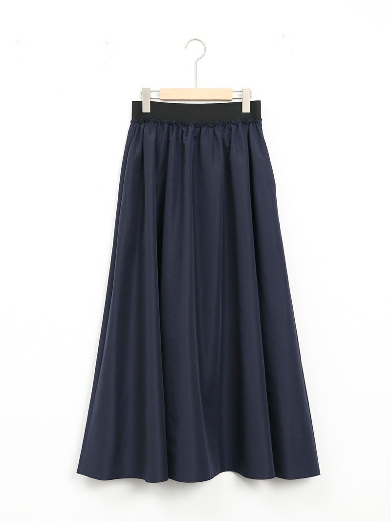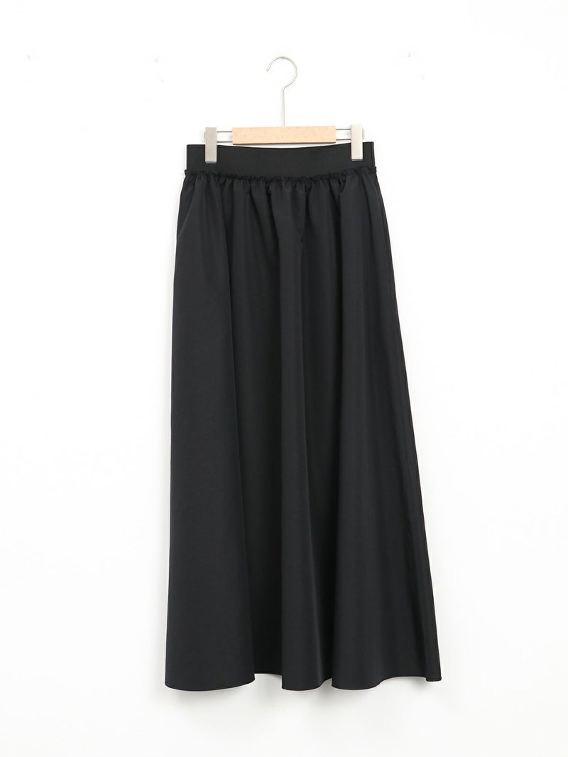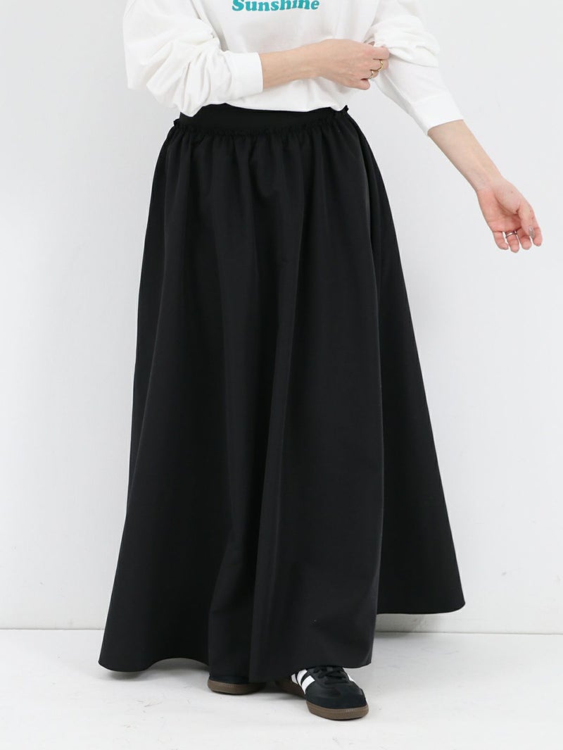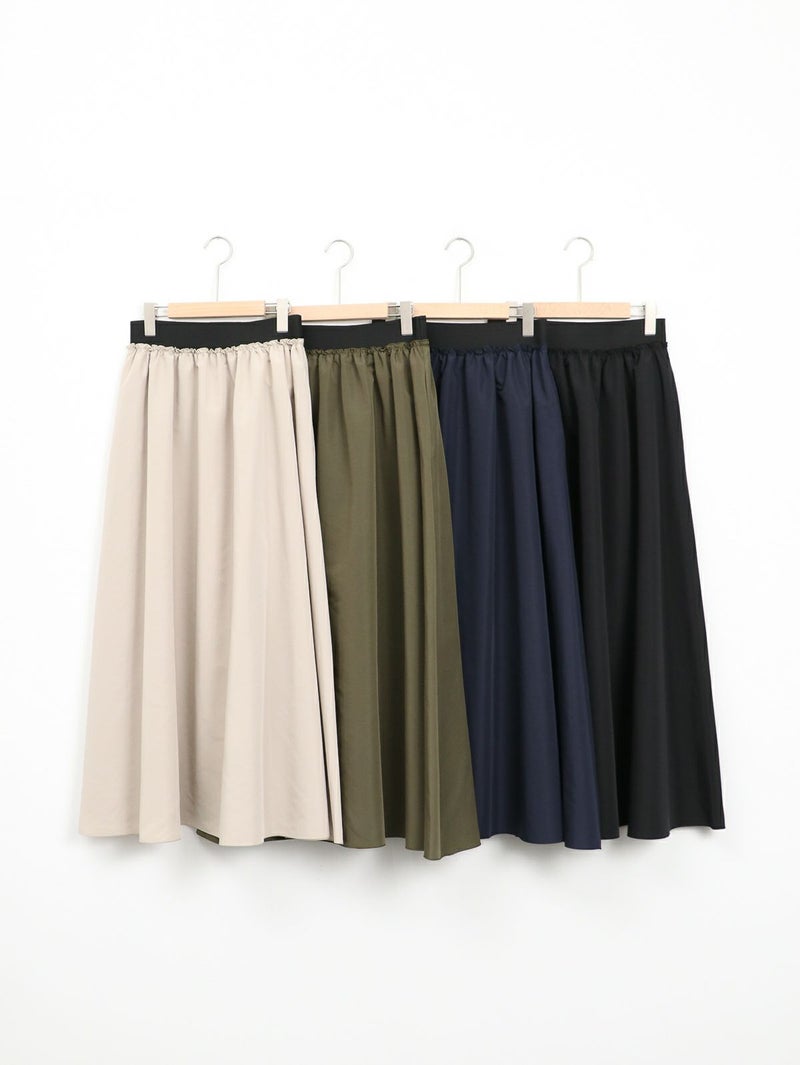 ウエストゴムのギャザースカートで素材はポリエステル。合繊素材ながら天然素材のようなマットなルックスがポイントです。軽やかでしなやかなハリコシ感のある生地が特徴でウエストが平ゴムなので腰回りはスッキリ見えるアイテムです。
