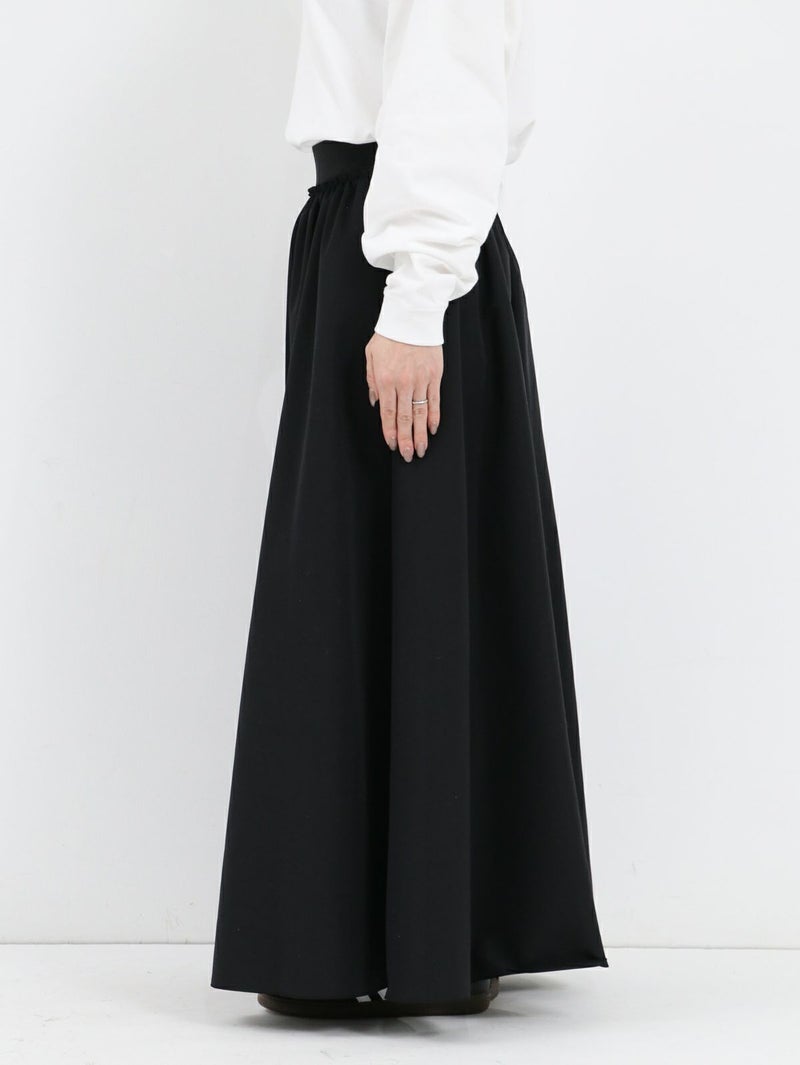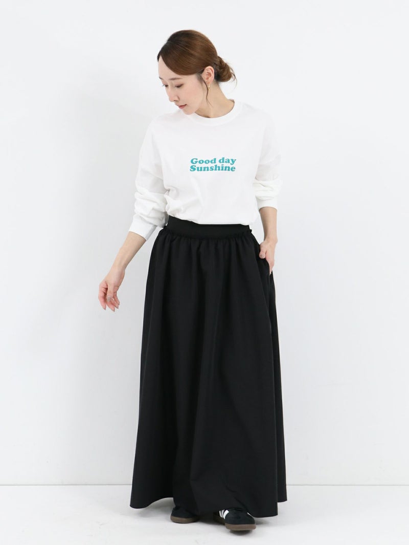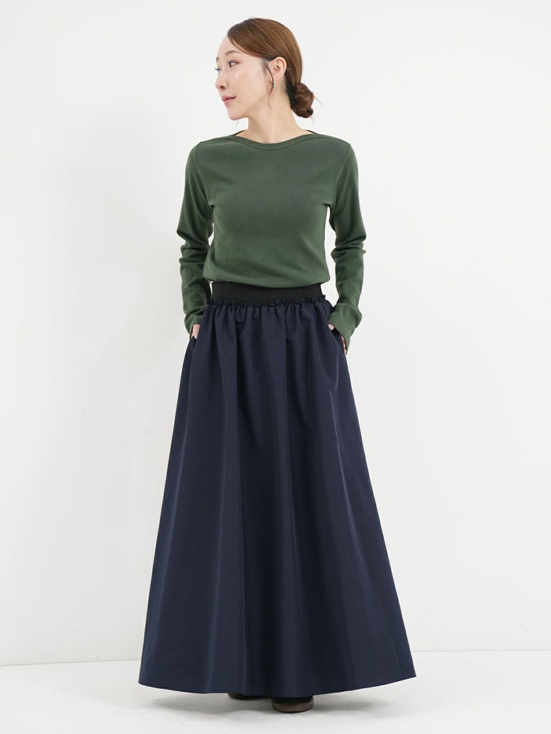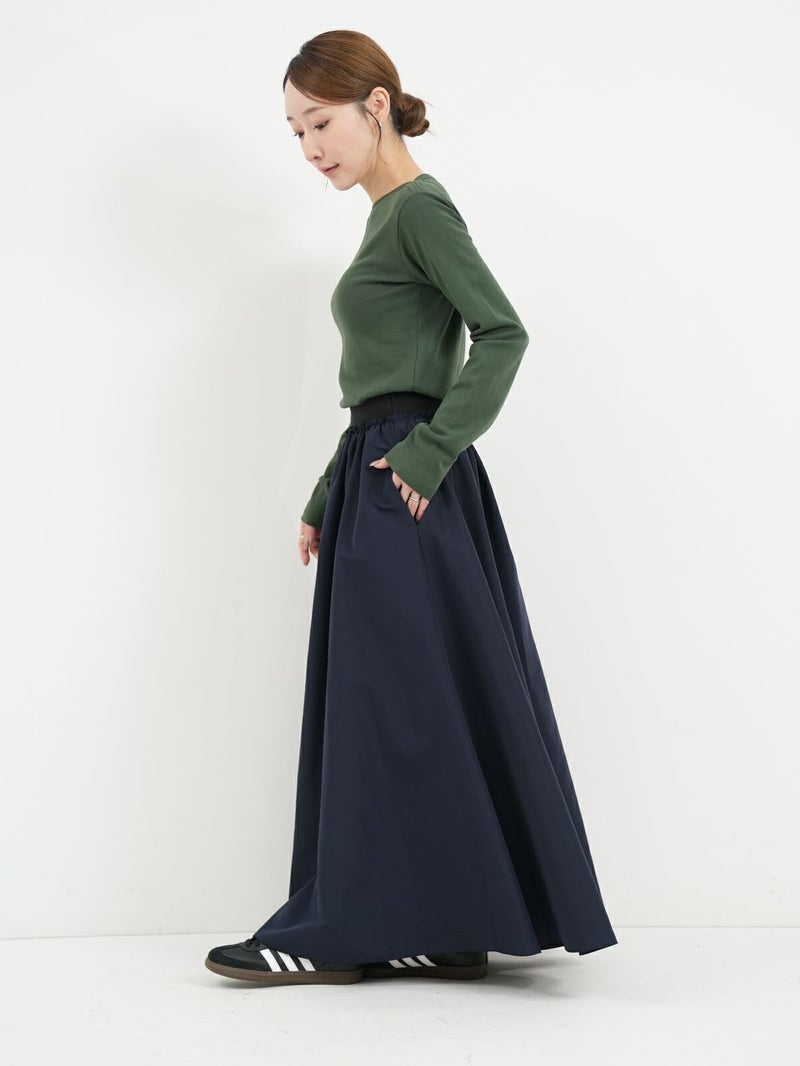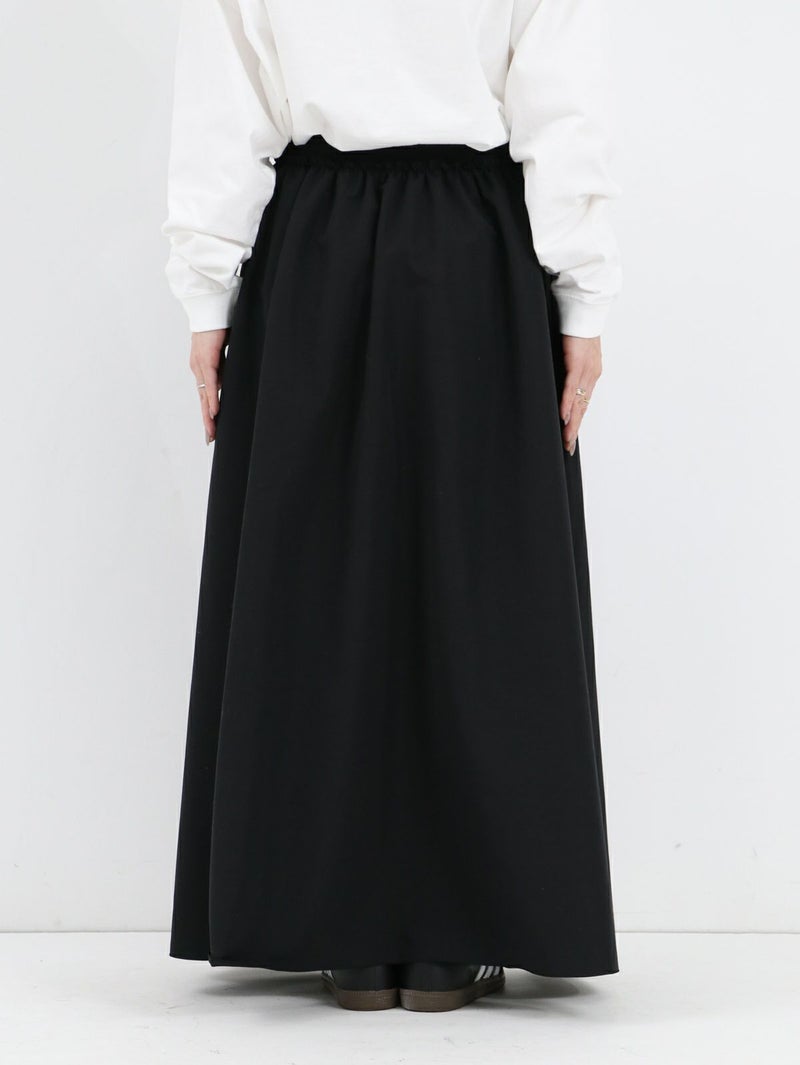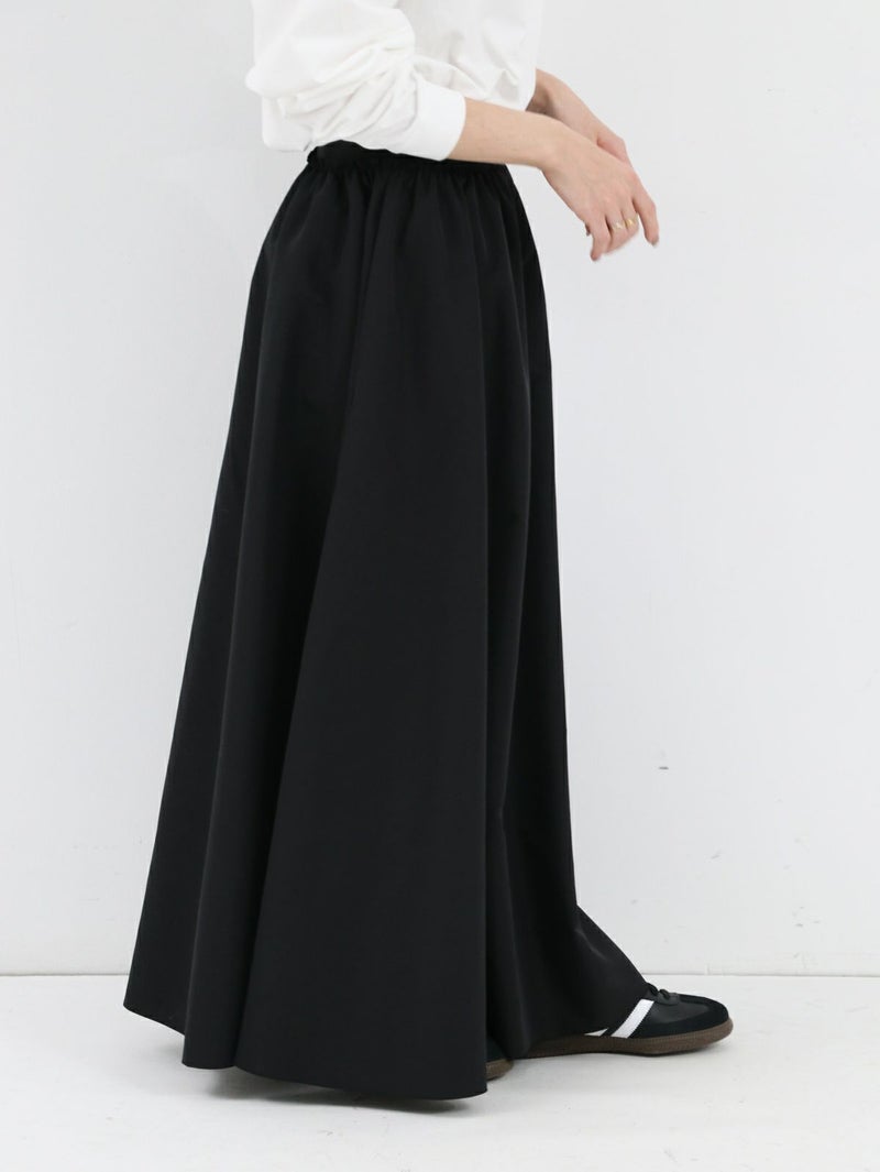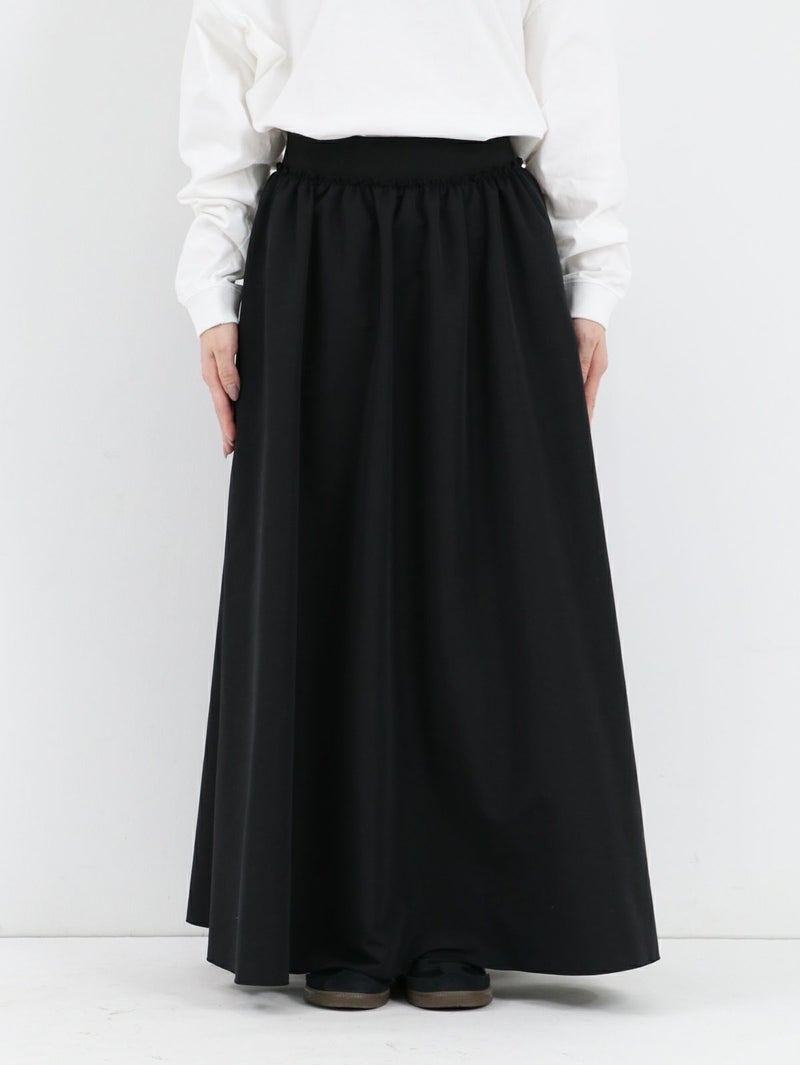 ウエストゴムのギャザースカートで素材はポリエステル。合繊素材ながら天然素材のようなマットなルックスがポイントです。軽やかでしなやかなハリコシ感のある生地が特徴でウエストが平ゴムなので腰回りはスッキリ見えるアイテムです。