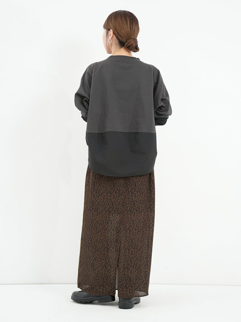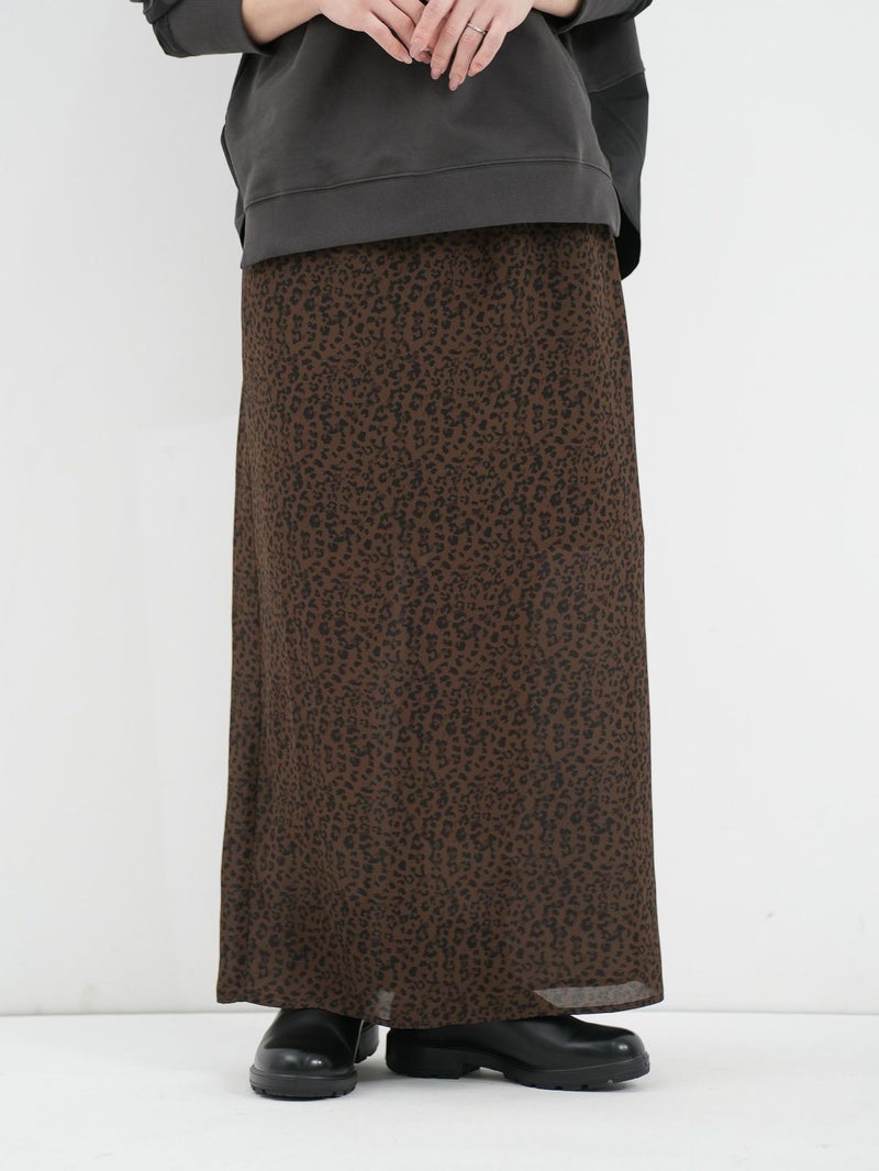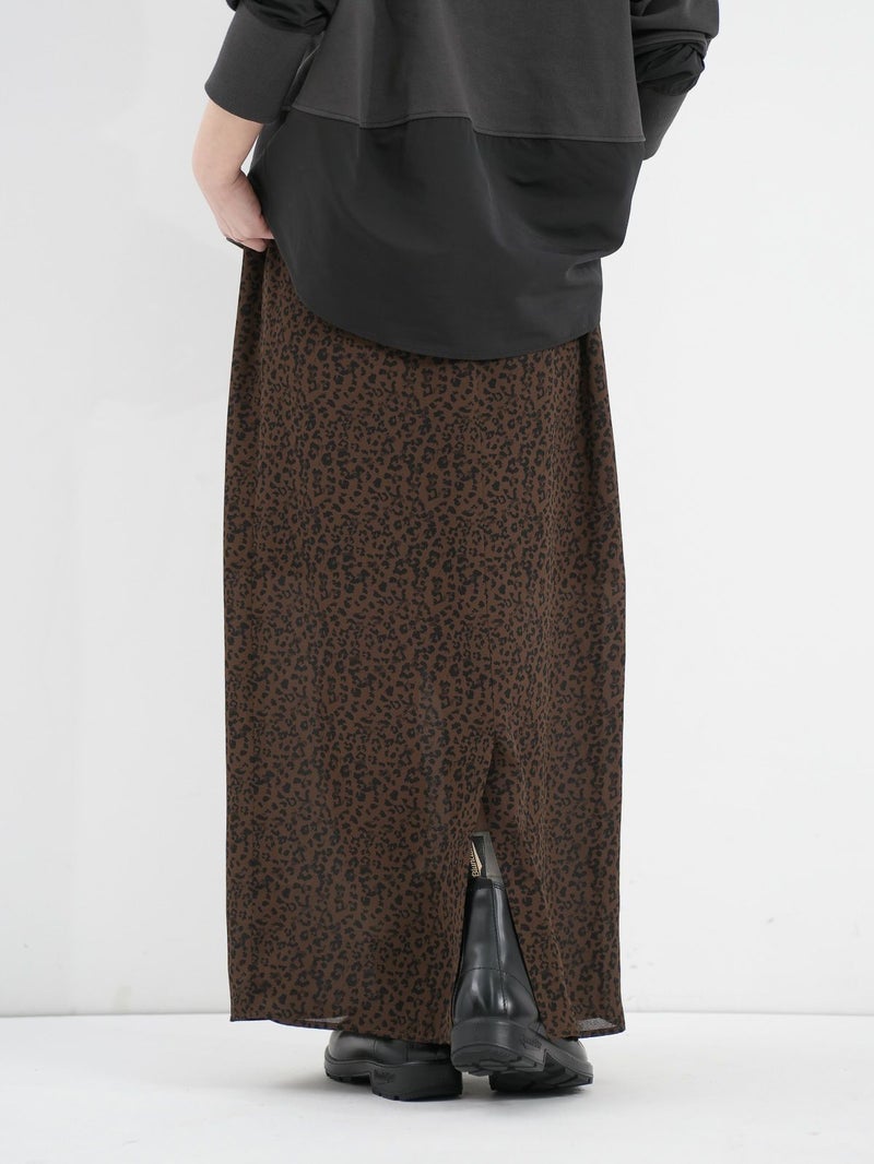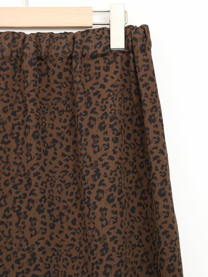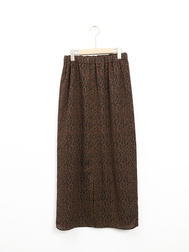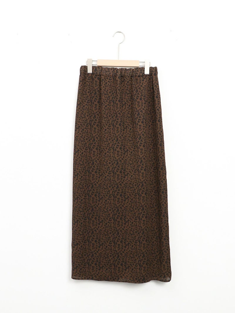 レオパード柄が華やかな印象のナロースカート。 広がりすぎないシルエットで品よく決まります。膝丈までは裏地がついており、透け感も気にならず、ウエストゴムで快適な着心地なのもポイントです。スウェットやスニーカーなどカジュアルスタイルに外しで使うとこなれ感もアップします。