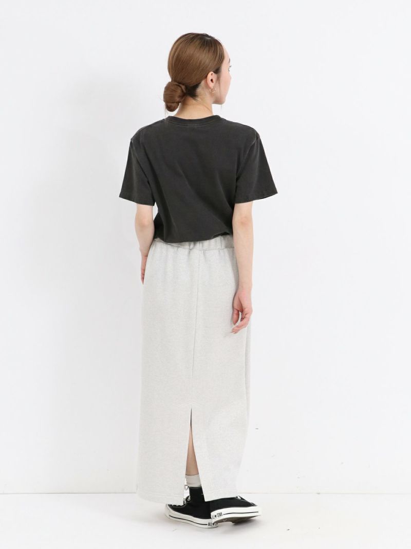 キラキラと優しいラメ裏毛のスカート。 広がりすぎないストレートシルエットで、サイドに入ったリブと大きなポケットがアクセントになります。デザイントップスやシャツとのコーディネートにオススメです。