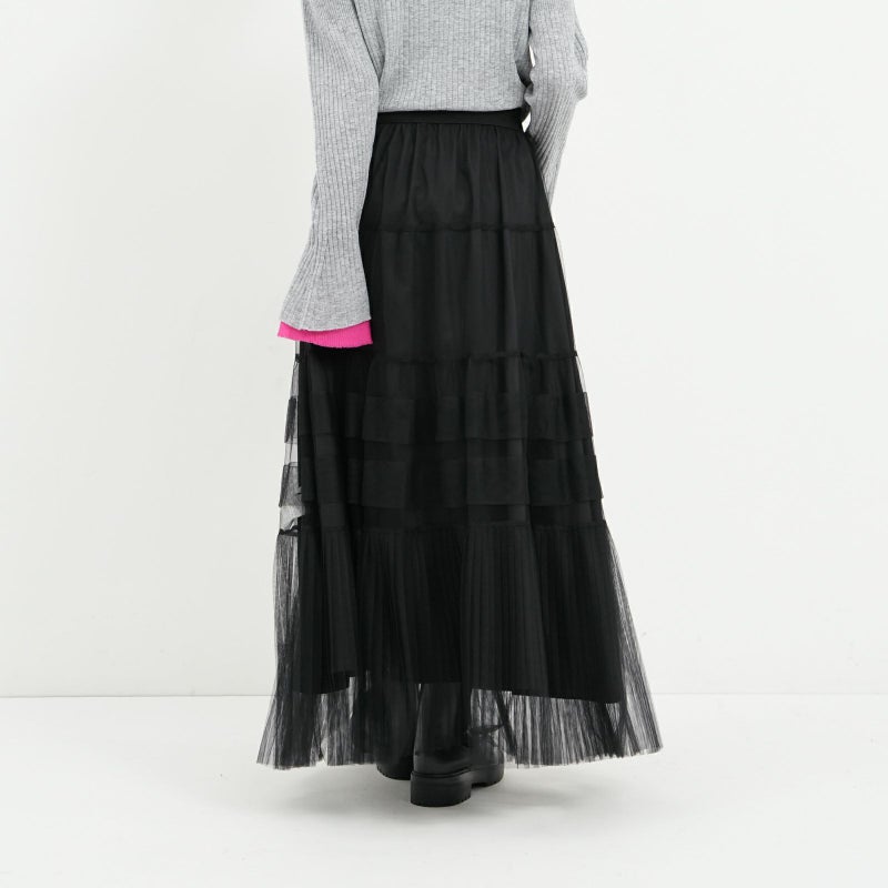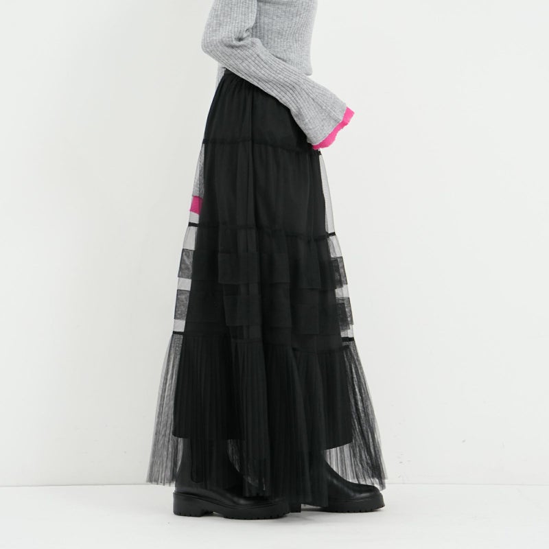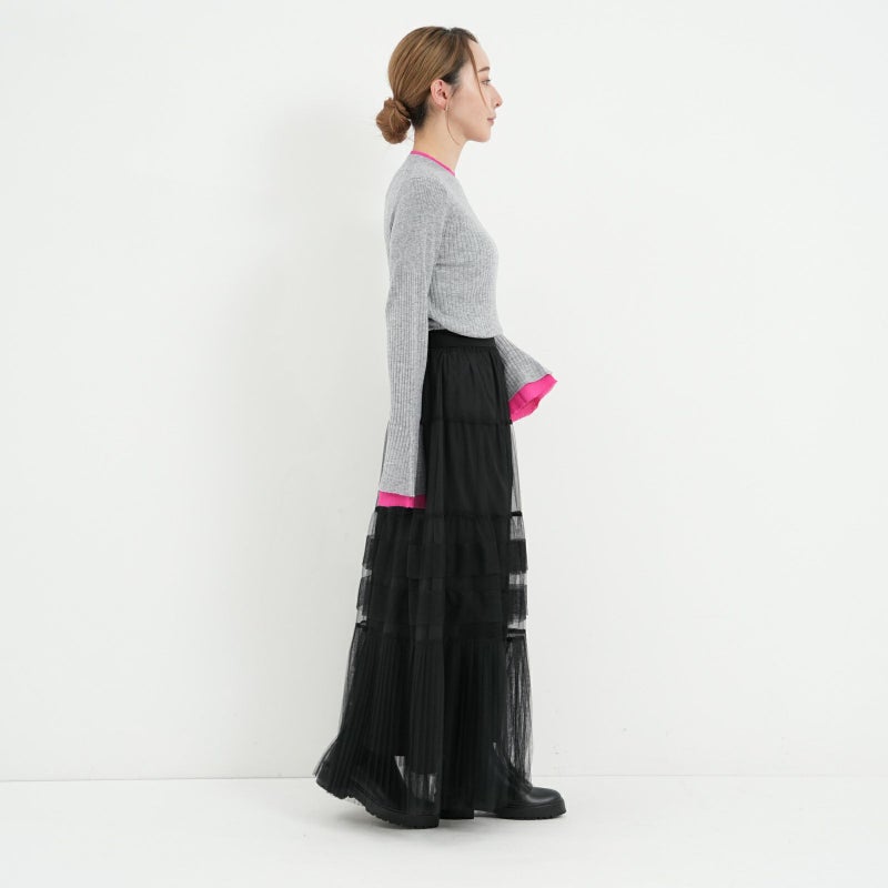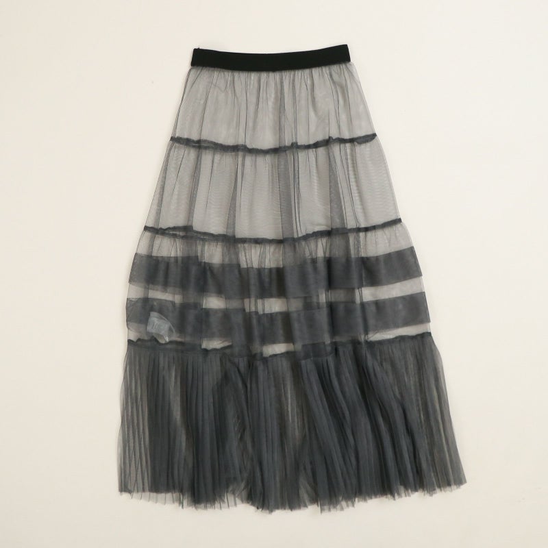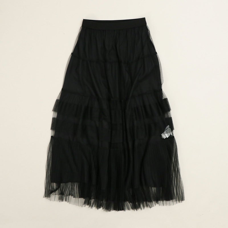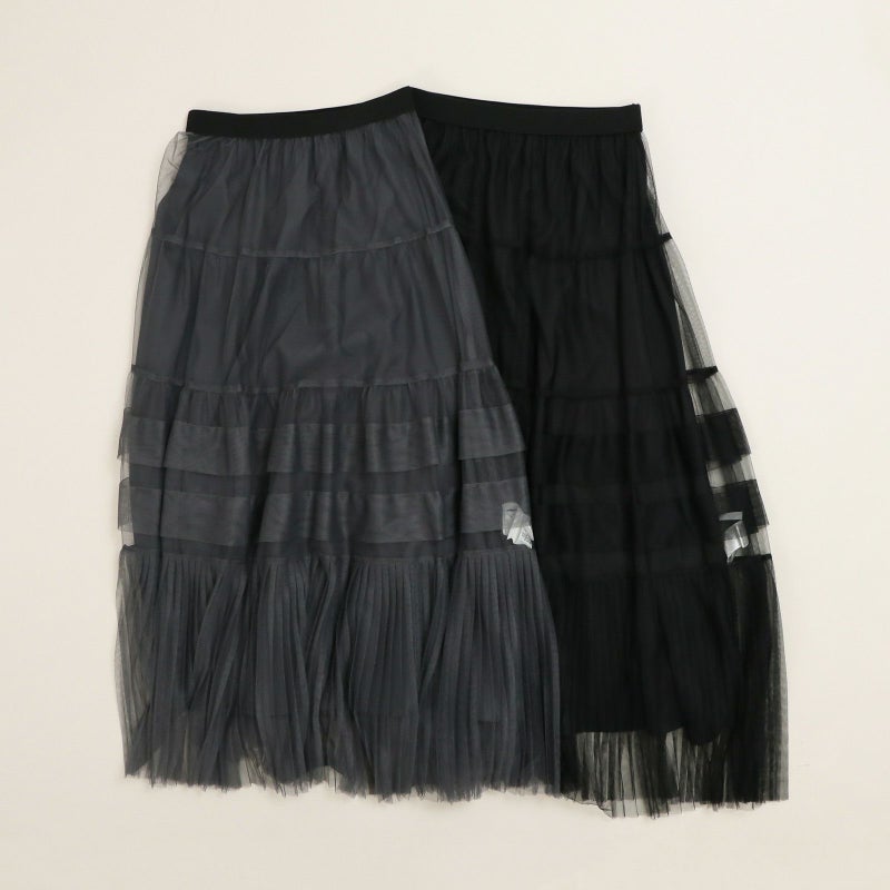 変化をつけたティアードデザインがポイントのチュールスカート。 ペチコートは、ウエストの両サイドのボタンで取り外しが可能。チュールのみをデニムやパンツに合わせたりと、旬なレイヤードスタイルも楽しめます。