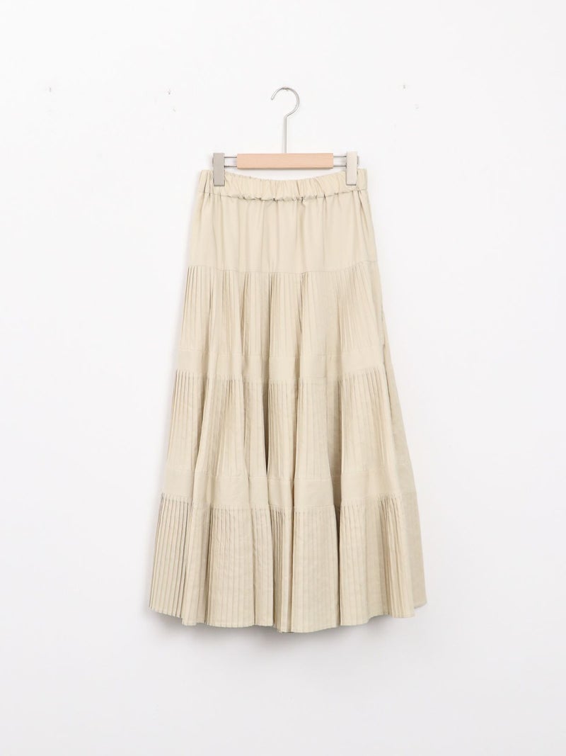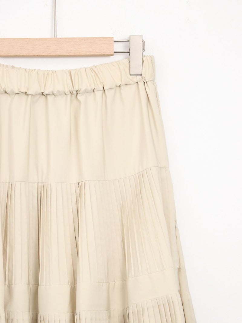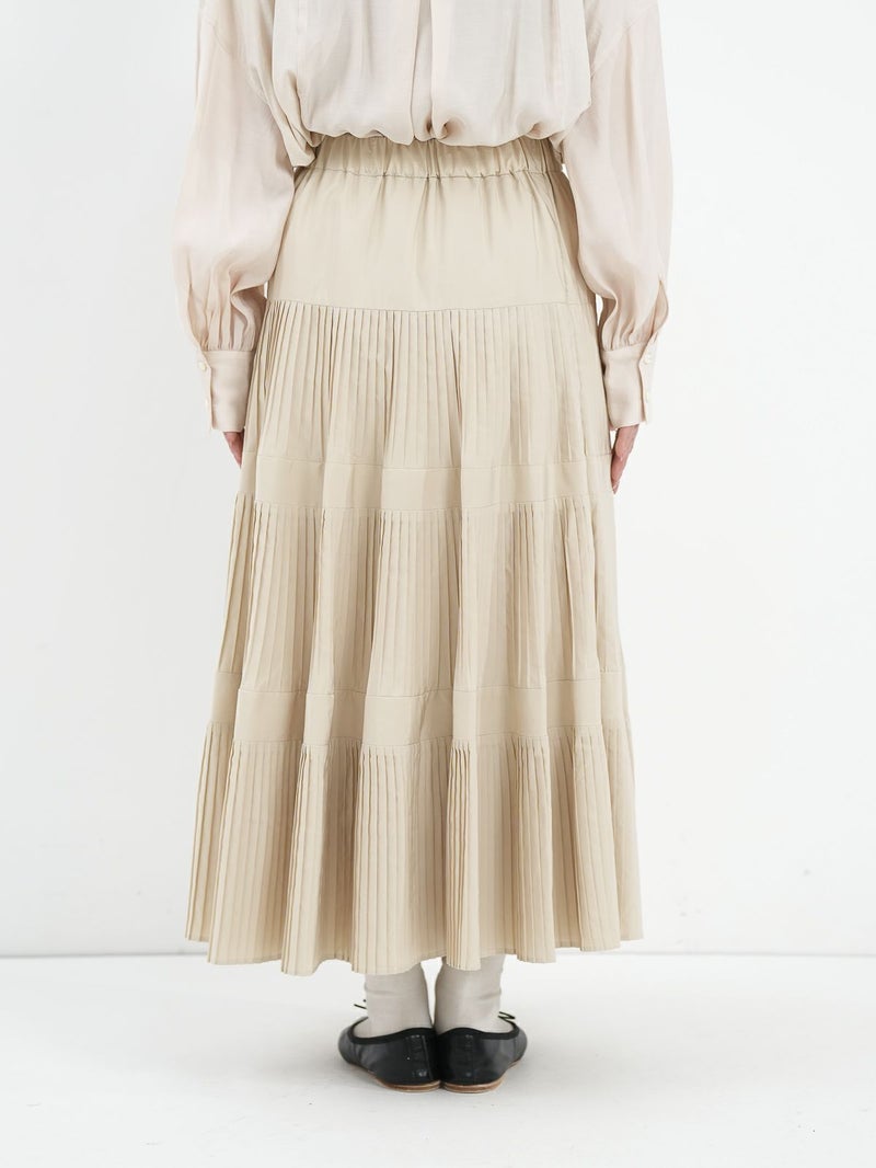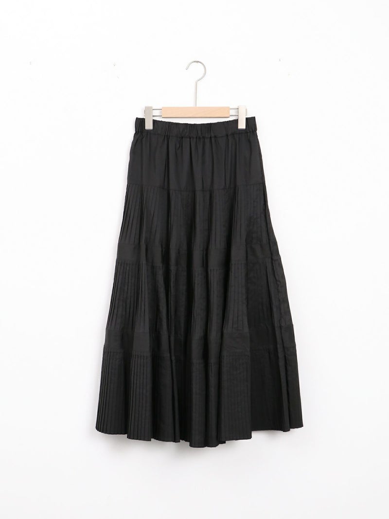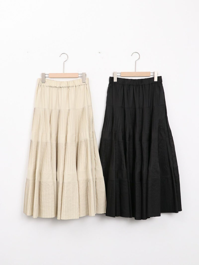 適度なハリと上品な光沢感のある生地を使用したスカート。 3段に切り替えたプリーツが動く度に揺れ、女性らしく穿きこなせます。 ウエストは総ゴム仕様で穿き心地が良く、シワになりにくいのも嬉しいポイント。 合わせるトップス次第でオンオフ問わず幅広いシーンで活躍するアイテムです。