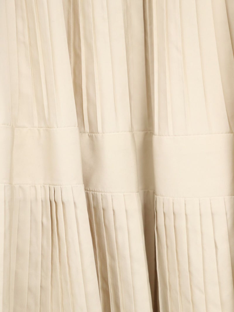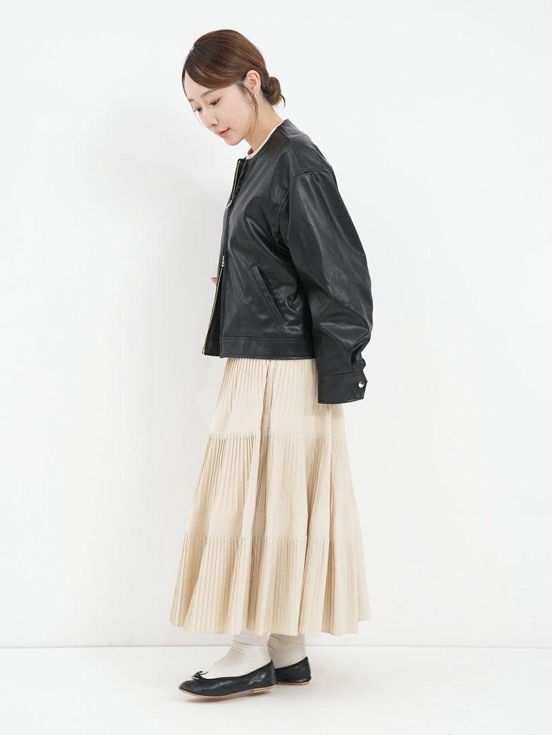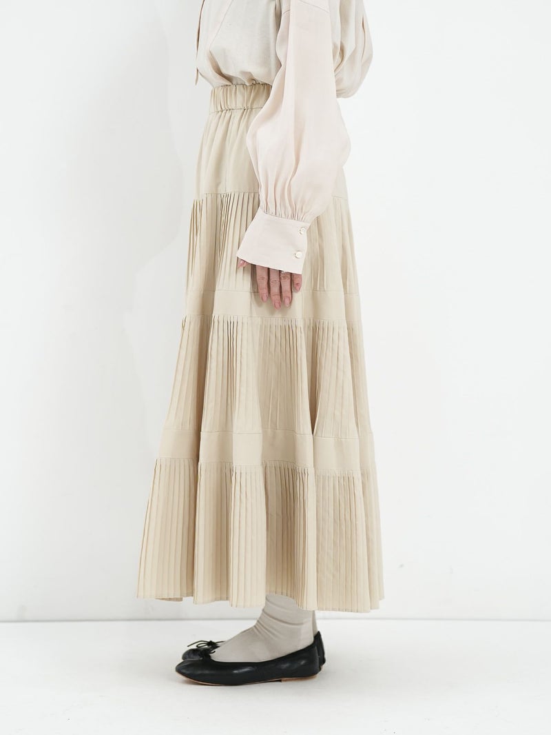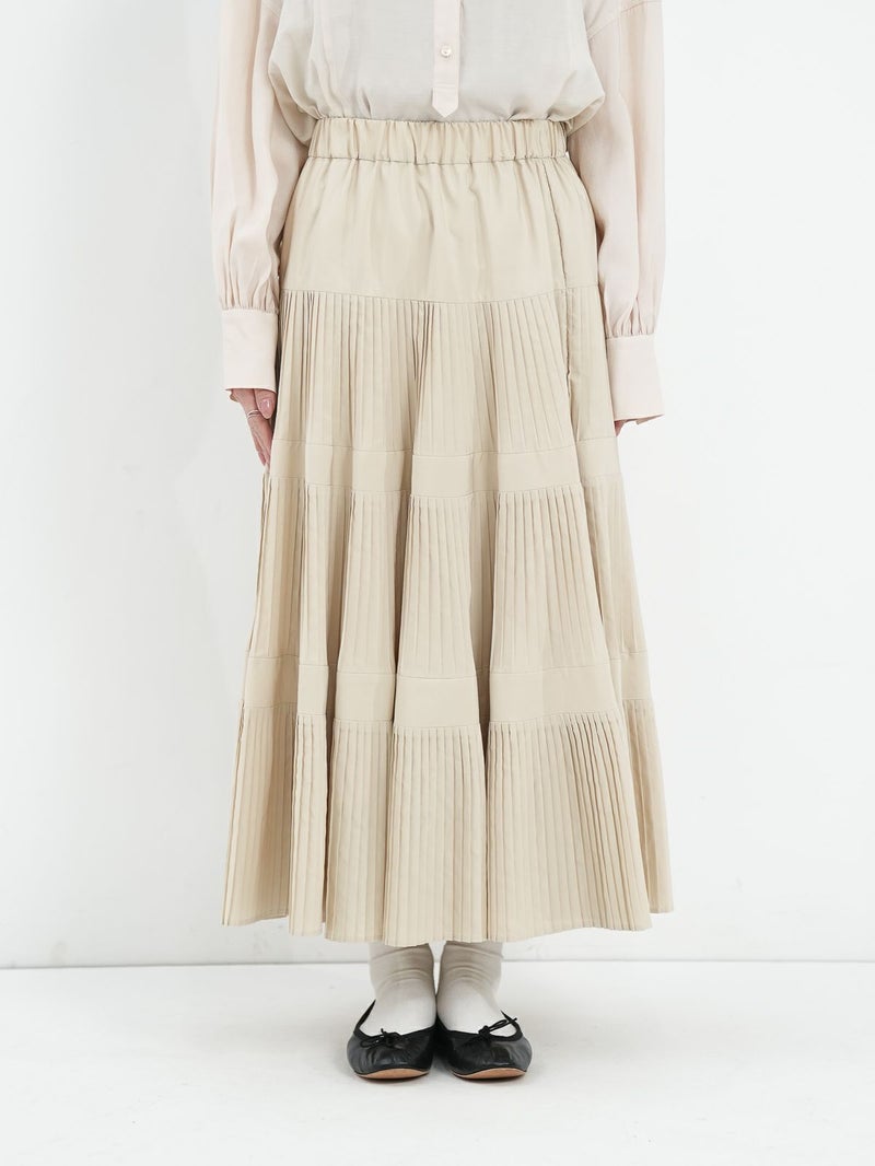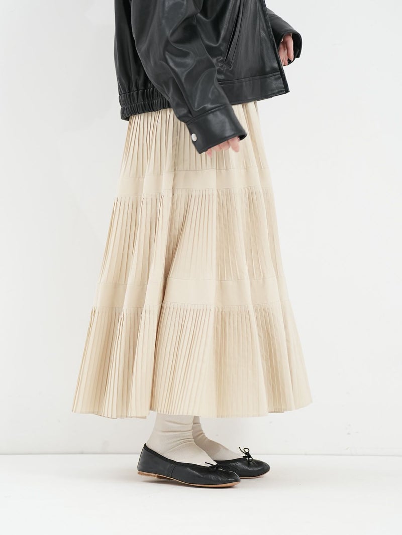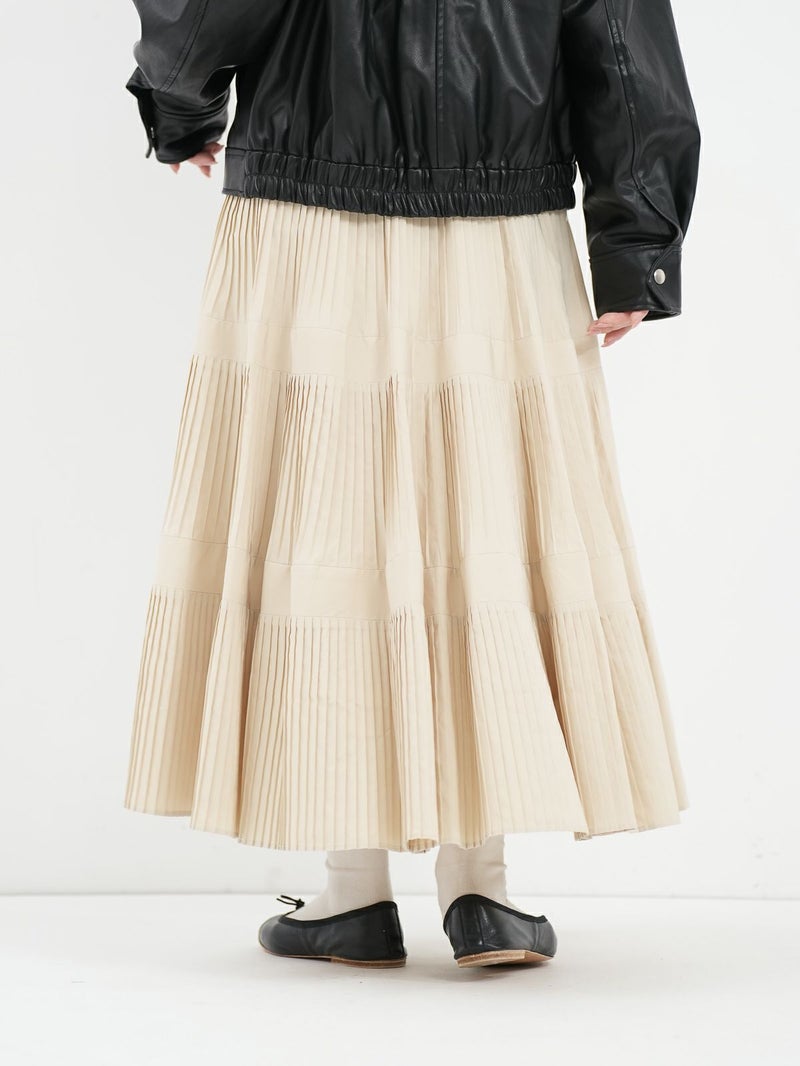 適度なハリと上品な光沢感のある生地を使用したスカート。 3段に切り替えたプリーツが動く度に揺れ、女性らしく穿きこなせます。 ウエストは総ゴム仕様で穿き心地が良く、シワになりにくいのも嬉しいポイント。 合わせるトップス次第でオンオフ問わず幅広いシーンで活躍するアイテムです。