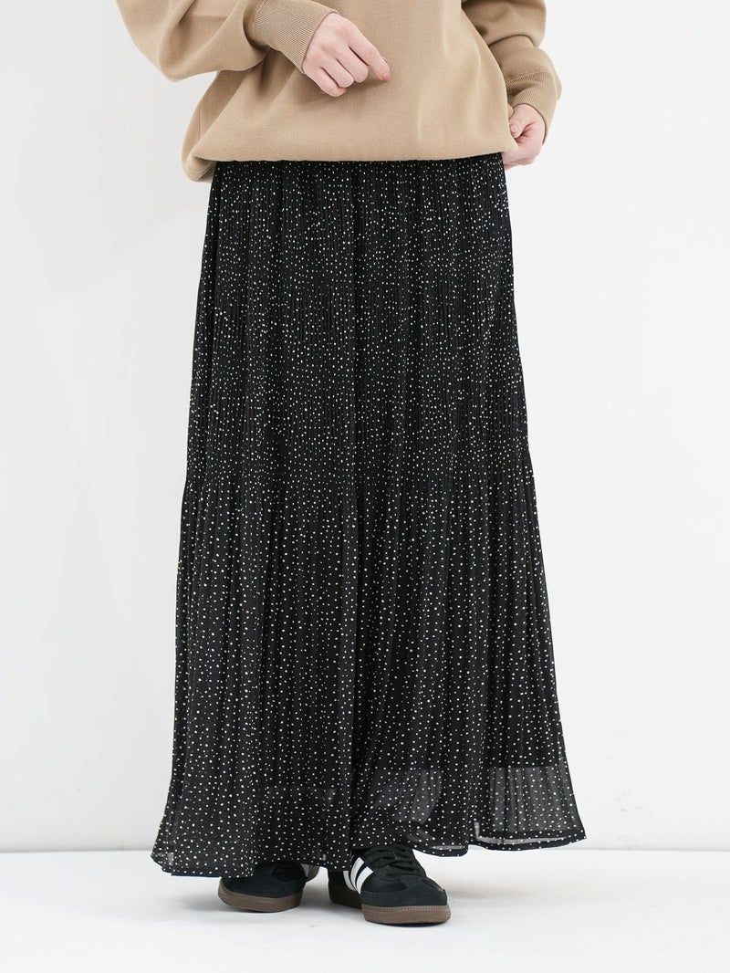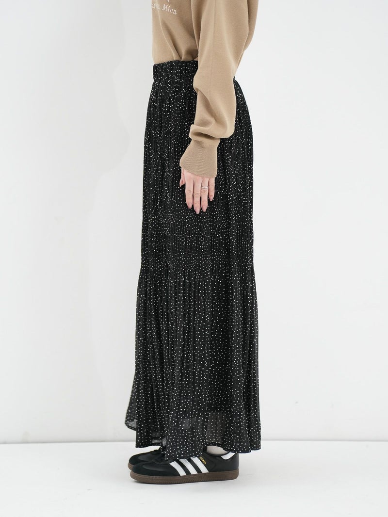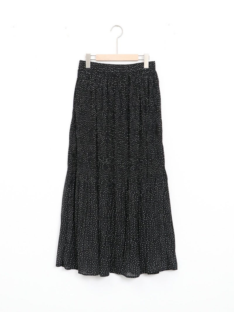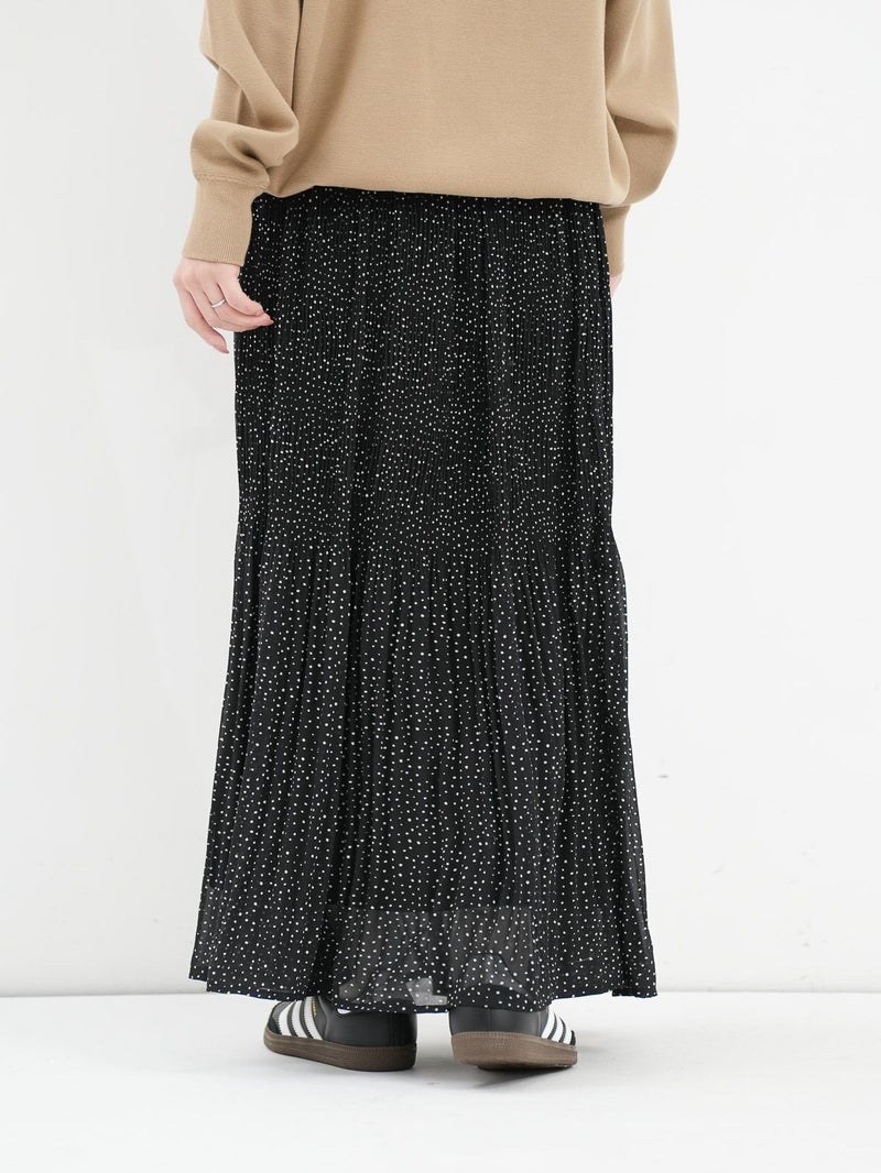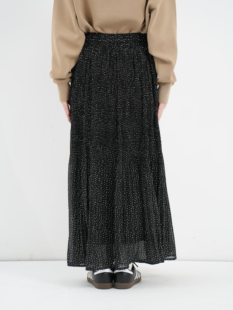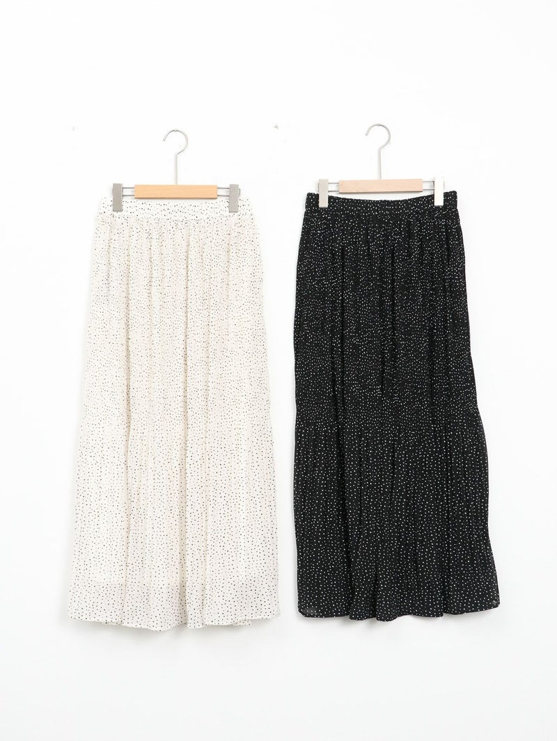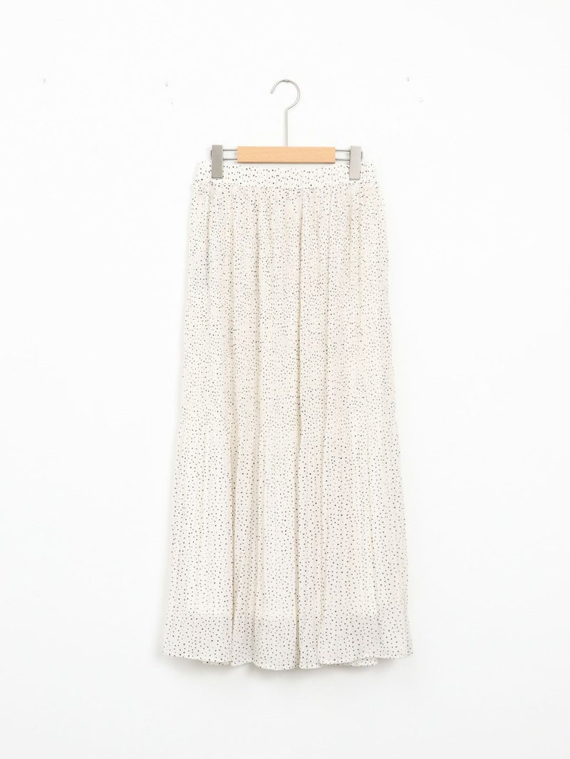 ランダムなピッチのマジョリカプリーツスカート。 ヒップ周りは適度にボリュームを抑え、横はたっぷりとフレアを出しています。小柄ドット柄がさりげなくスタイルのポイントになります。