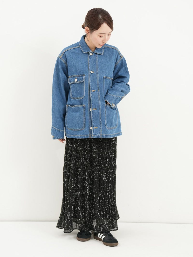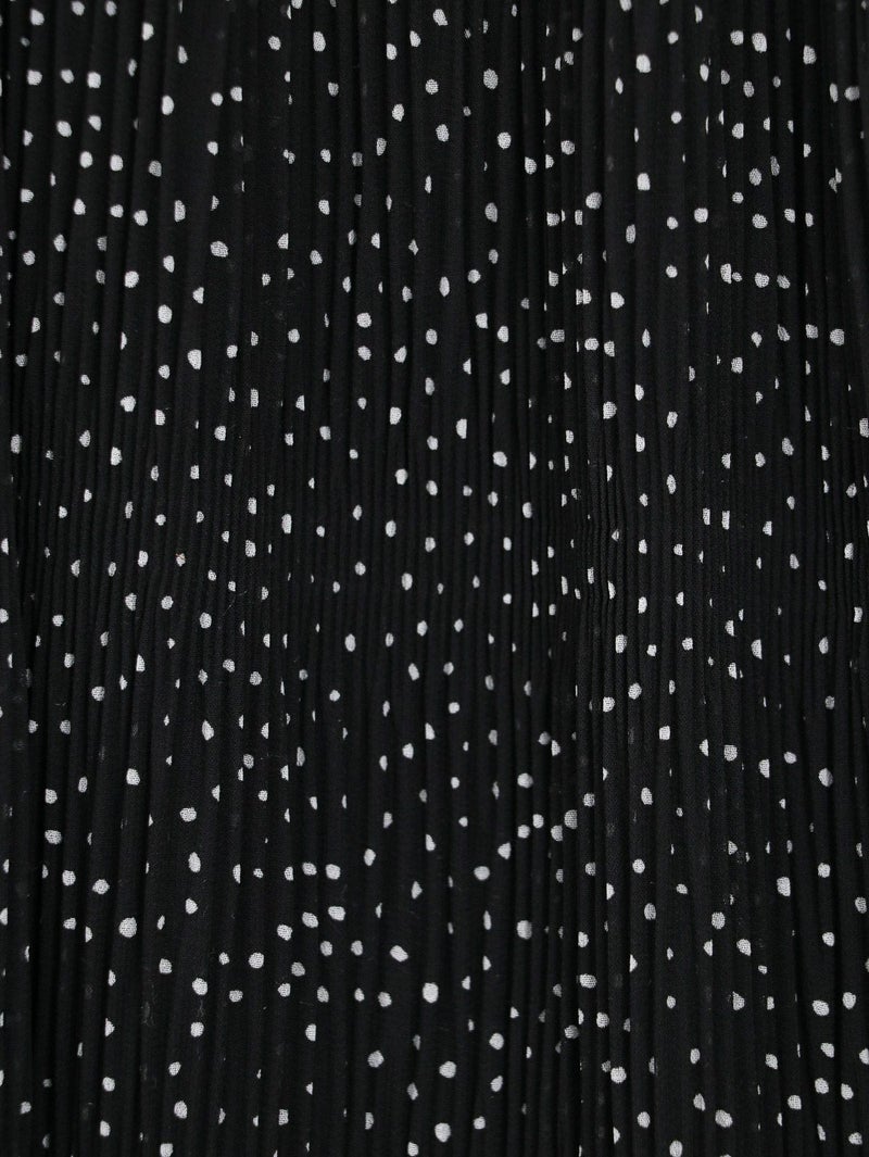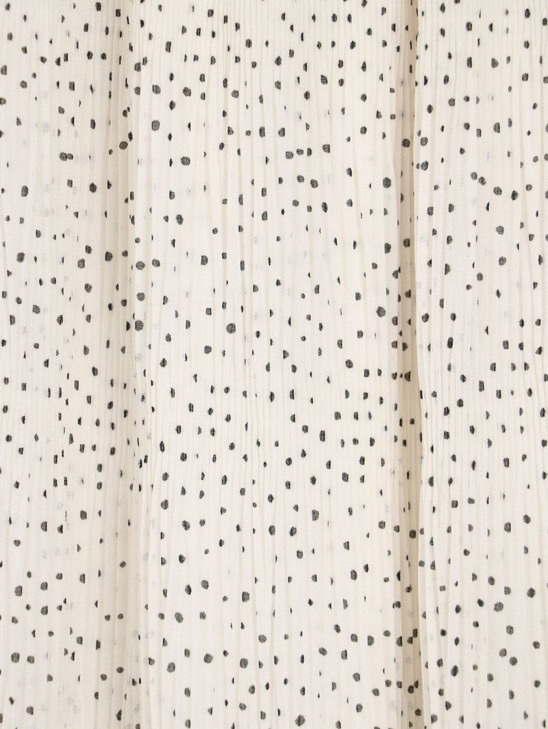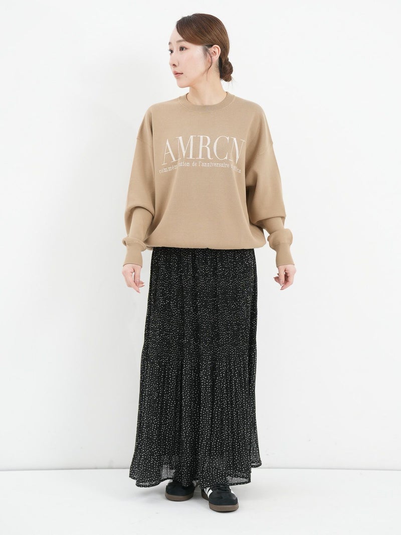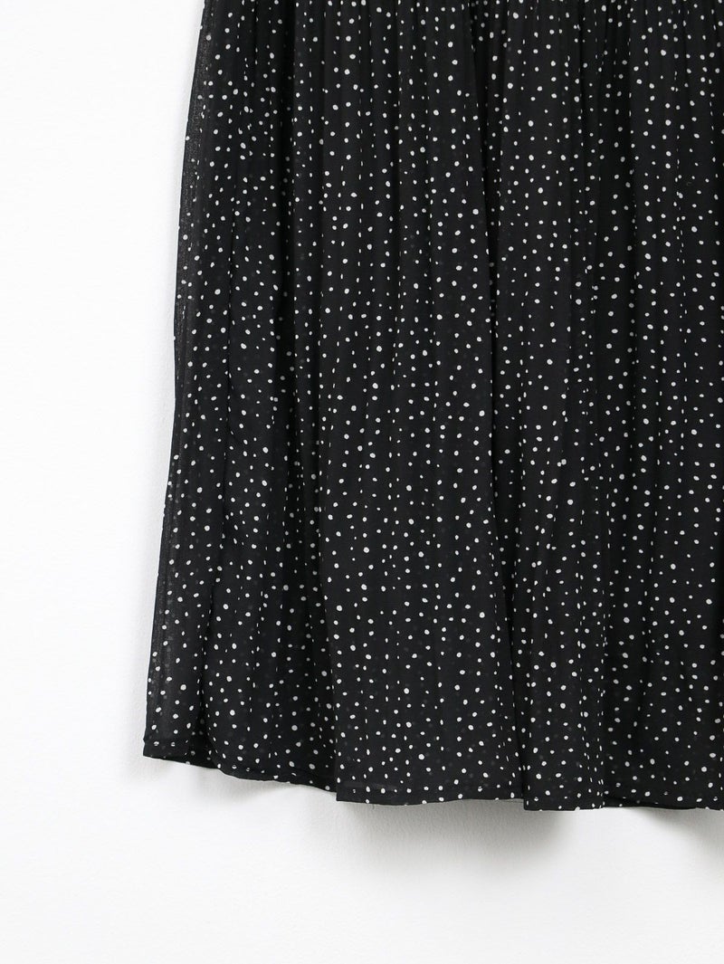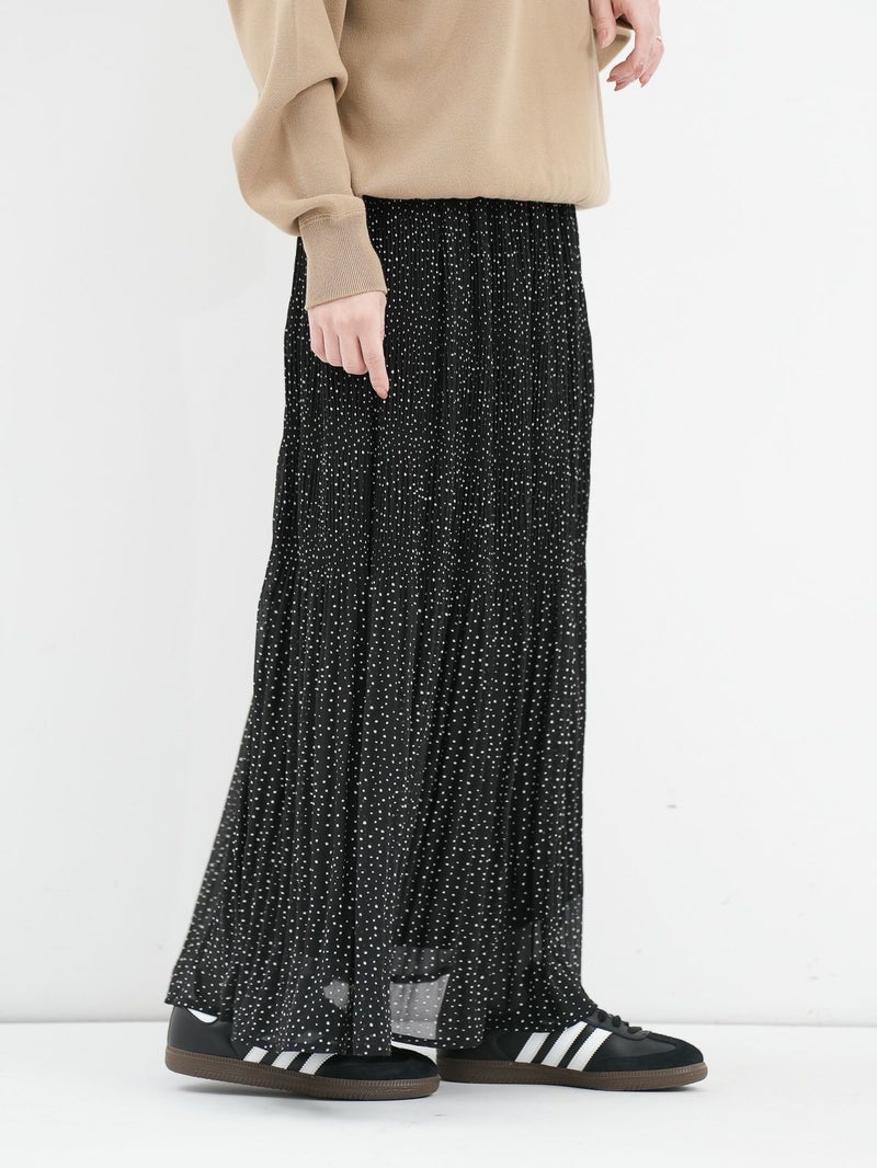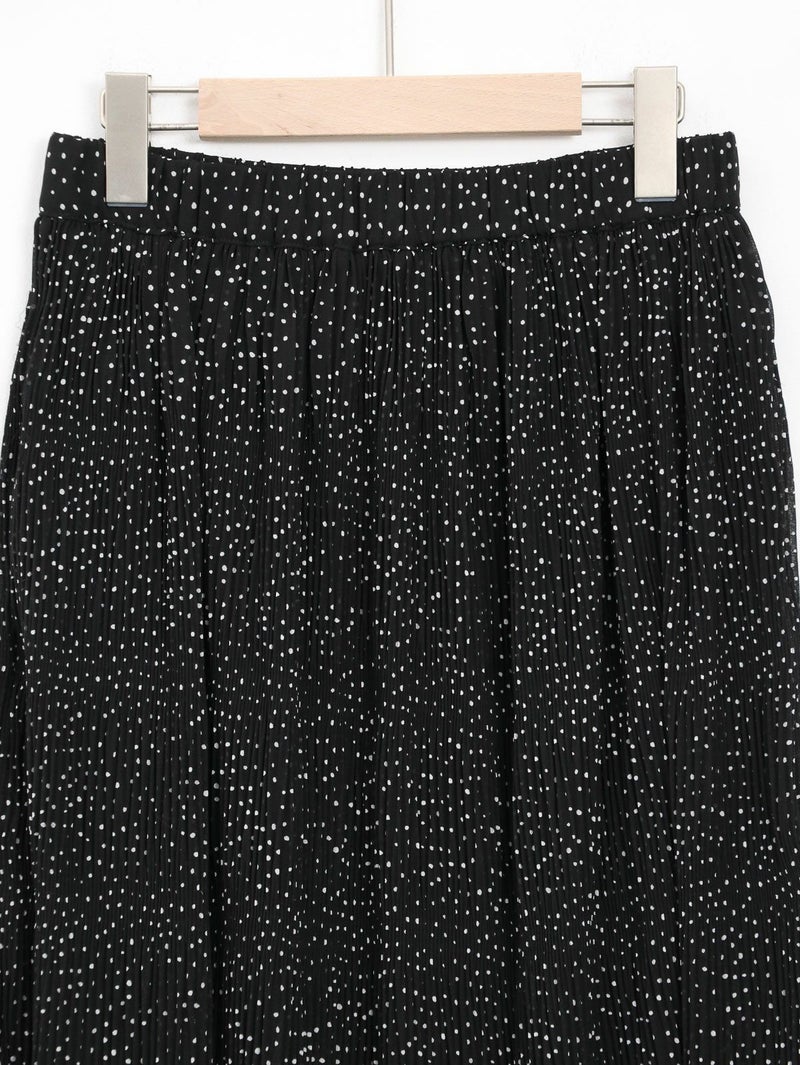 ランダムなピッチのマジョリカプリーツスカート。 ヒップ周りは適度にボリュームを抑え、横はたっぷりとフレアを出しています。小柄ドット柄がさりげなくスタイルのポイントになります。