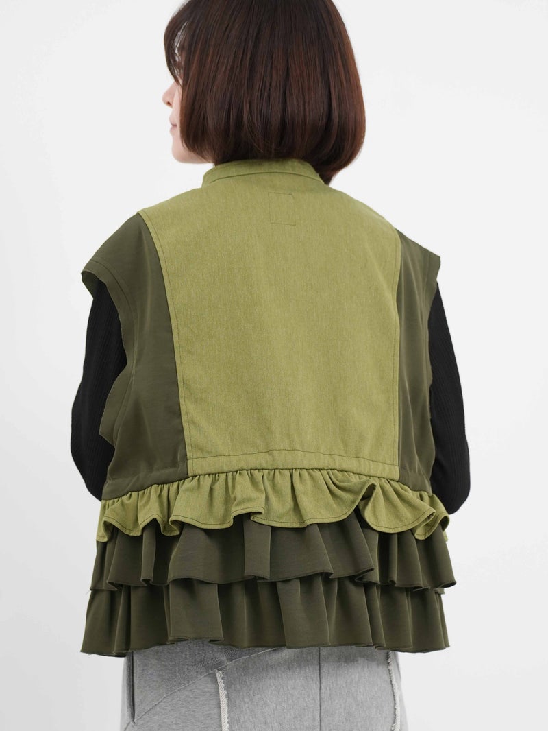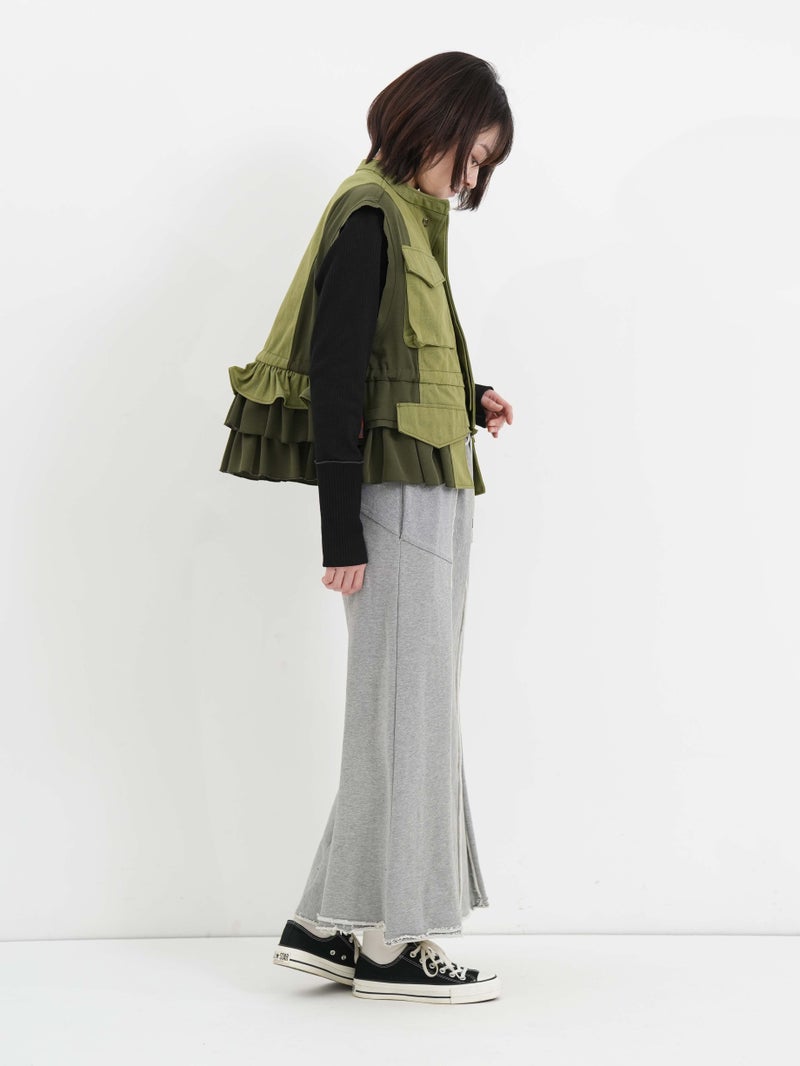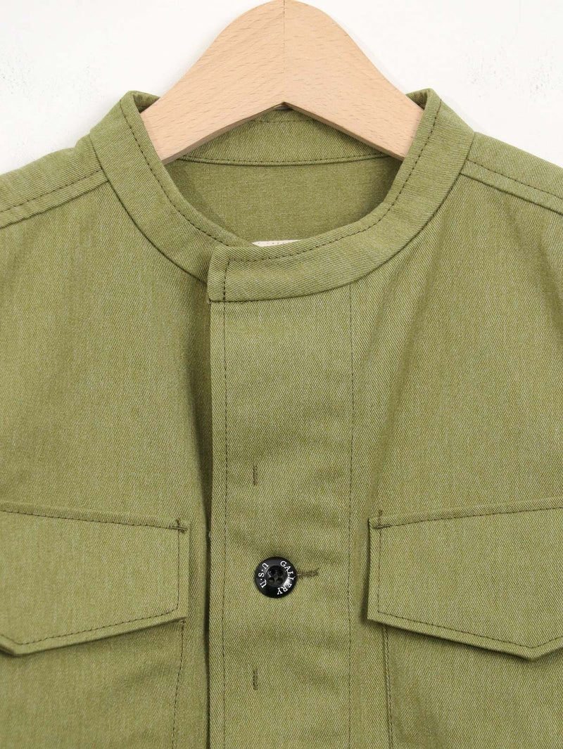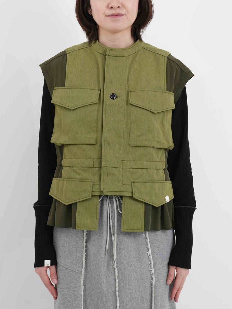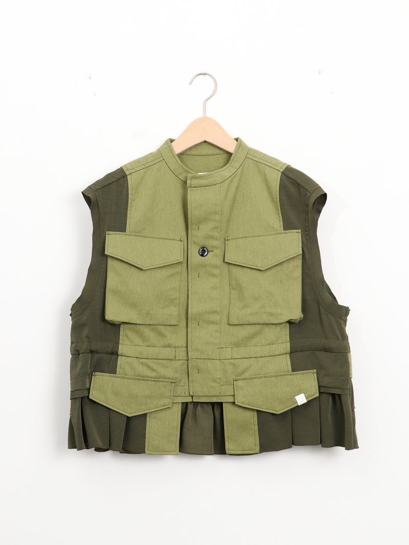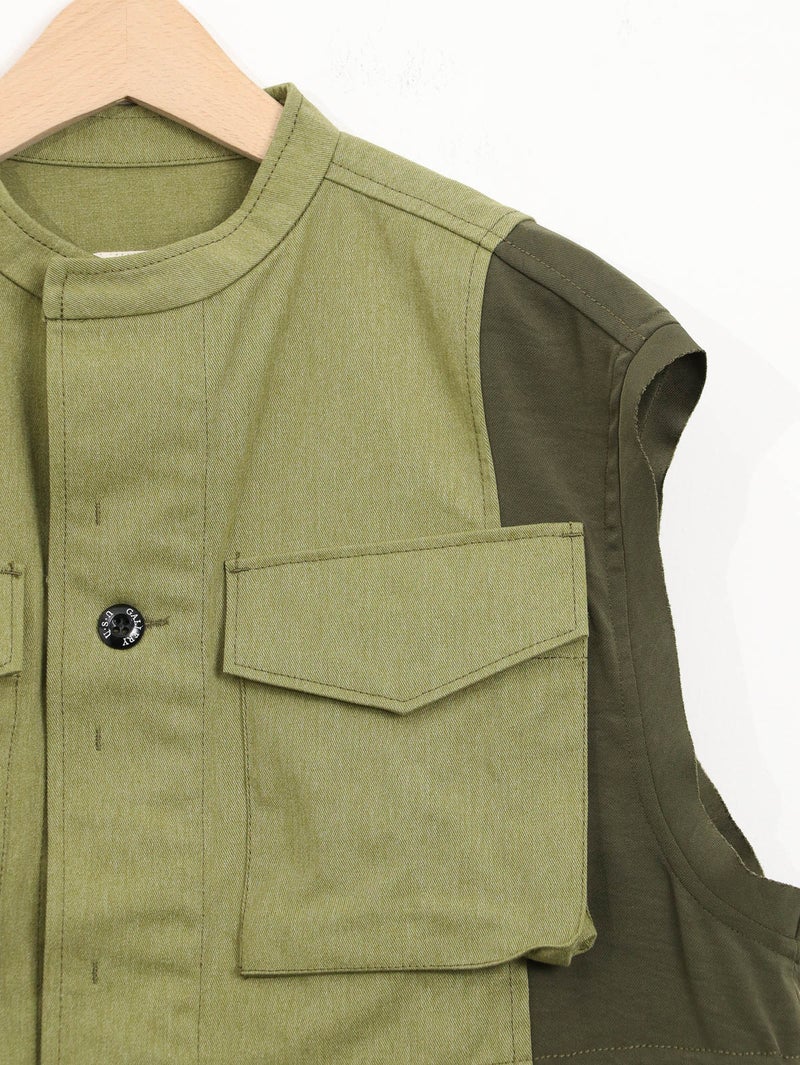ベトナム戦争時に採用されたM-65フィールドジャケットの袖をカットし、別素材と組み合わせたようなイメージで仕上げました。無骨なミリタリーのエッセンスに、エレガントな要素を掛け合わせたデザインです。相反するテイストが調和し洗練された印象になります。