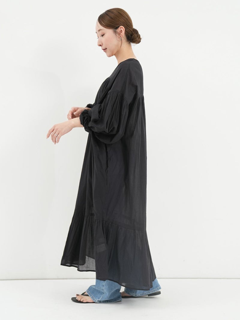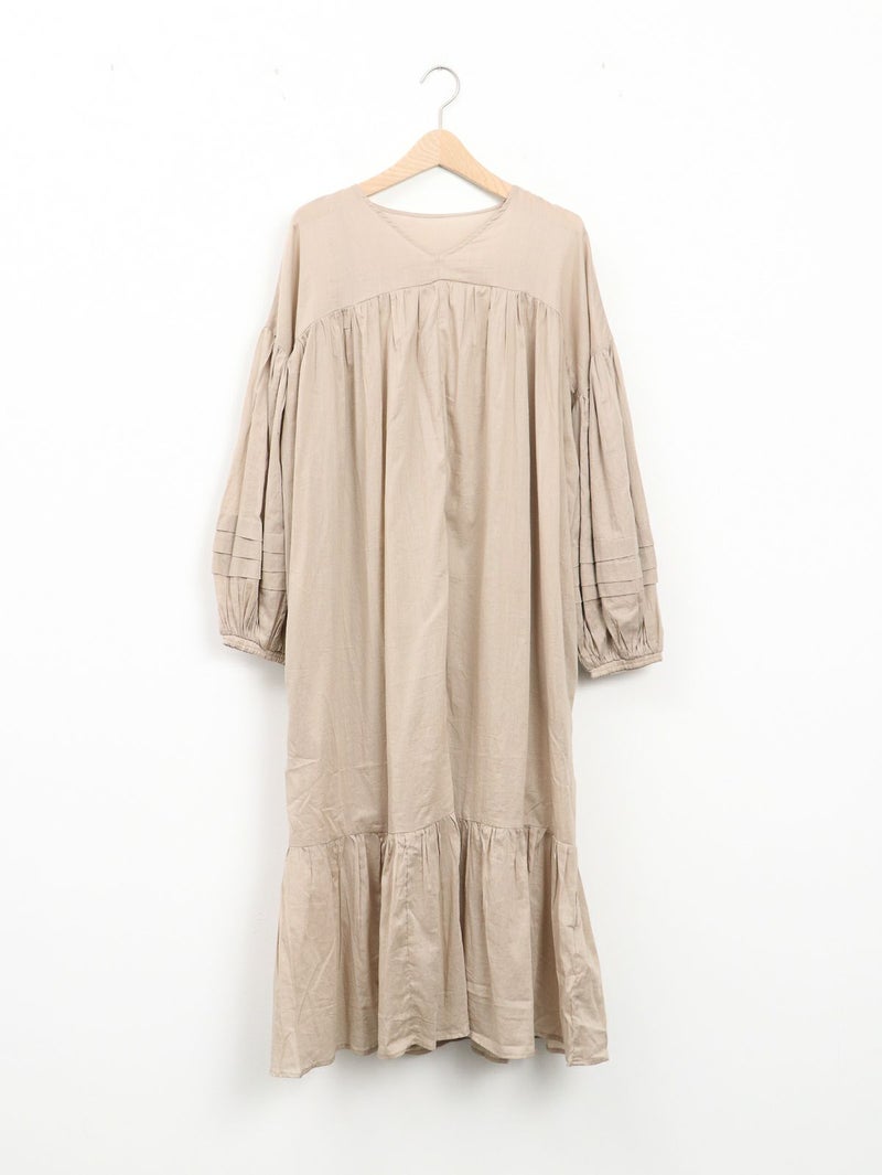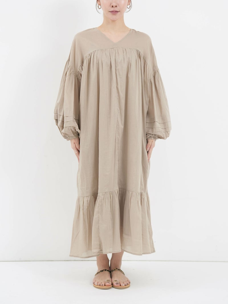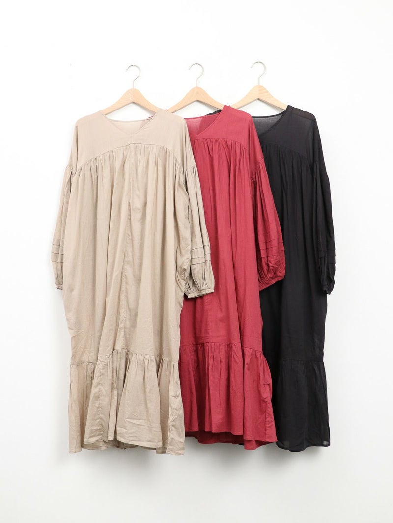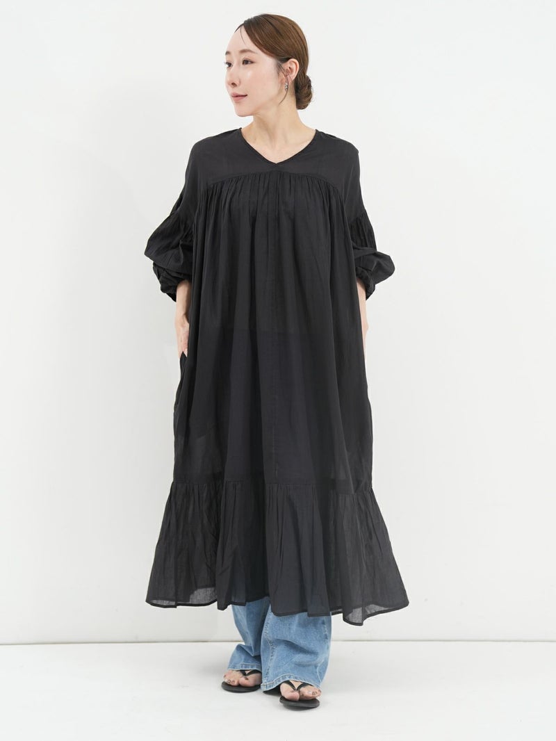 ギャザーが胸元と裾に贅沢に入り、ふんわり広がる女性らしいワンピース。 袖口がゴム仕様なので袖をたくし上げることができ、華やかな印象なバルーンスリーブ。生地は薄くて軽く、肌触りの良いインド綿のコットンボイルを使用。夏から秋にかけて涼しく快適に着ていただけます。 ※インナーワンピース付き。