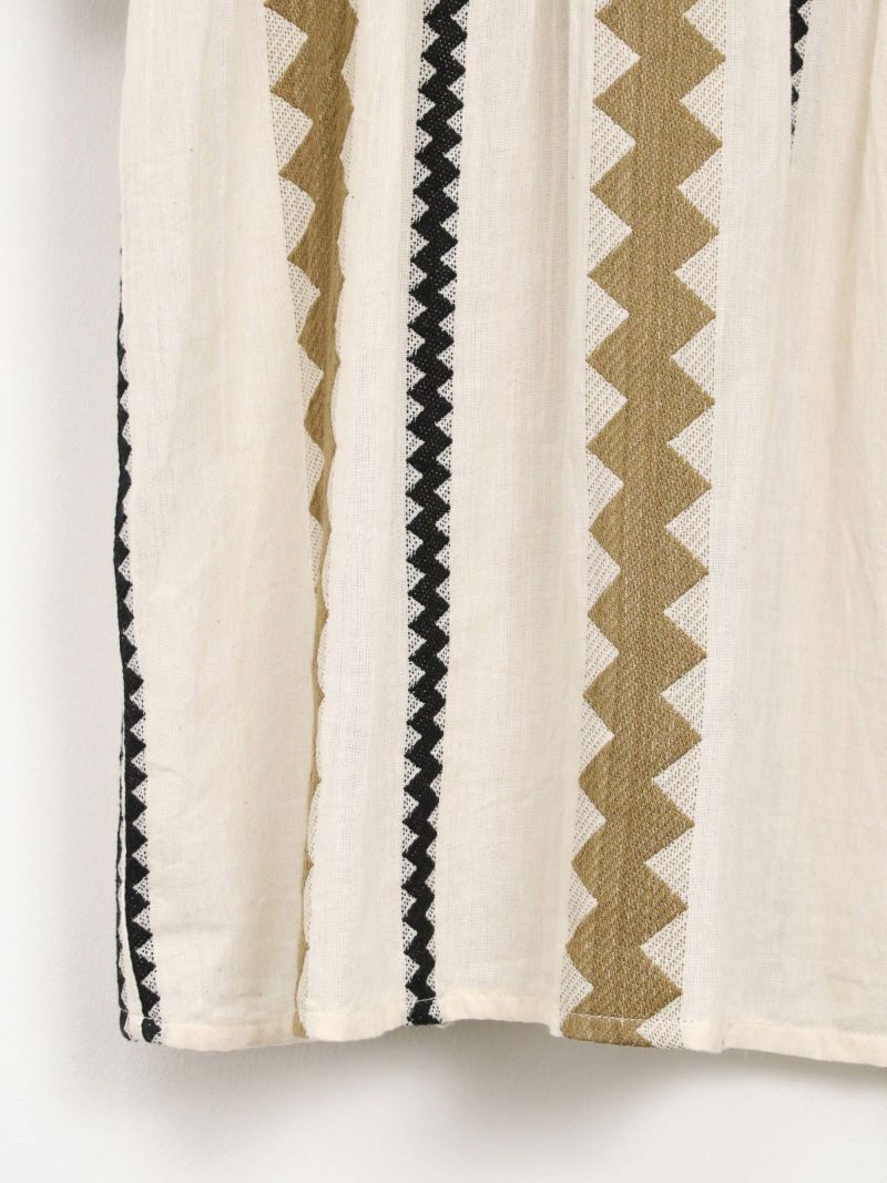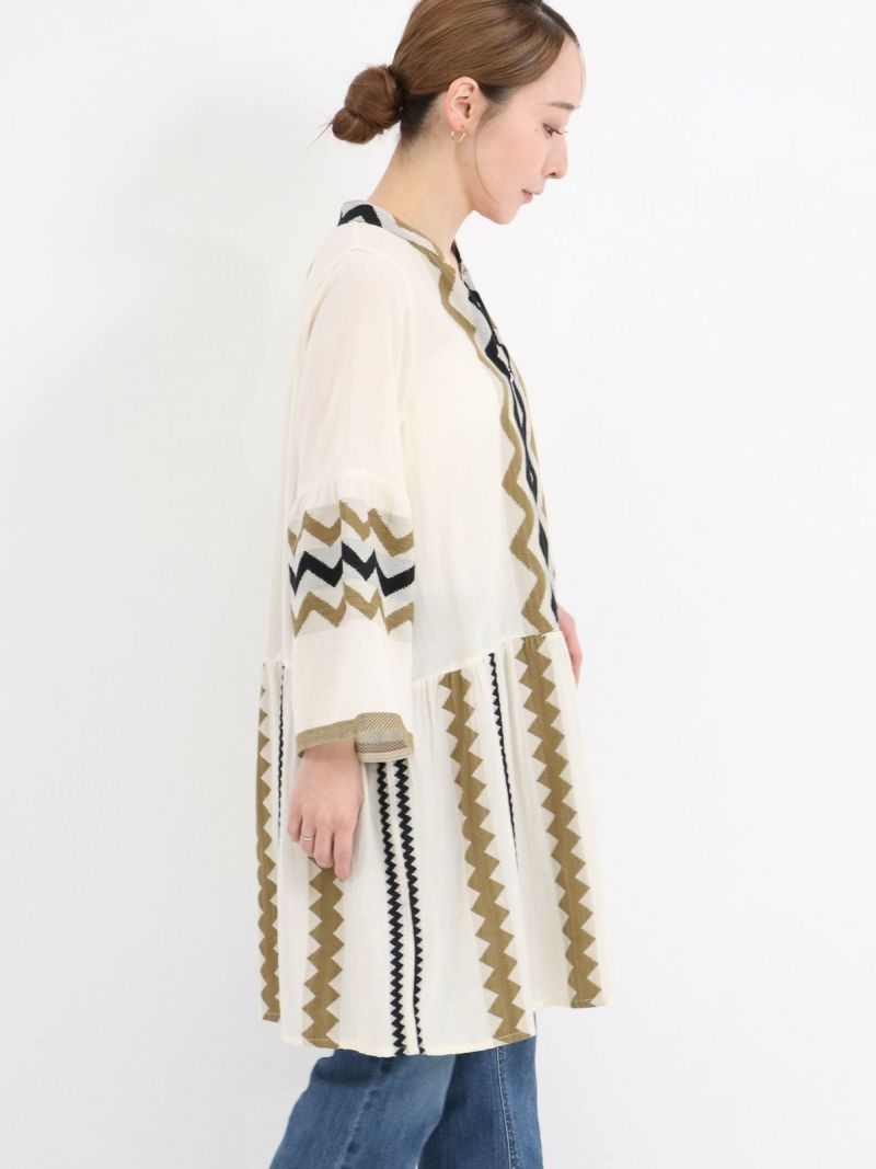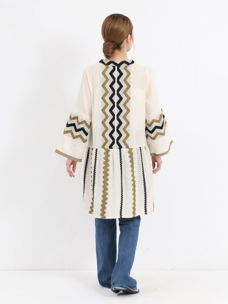 インド綿の風合いが魅力のチュニック丈ワンピース。 1枚で着ても、デニムなどをレイヤードするのもオススメな、この夏により一層映えるアイテム。 ナチュラルな配色と波線のデザインがエスニックな雰囲気のある1枚です。 ひざ上ほどの丈で、袖のフレアデザインもポイント。
