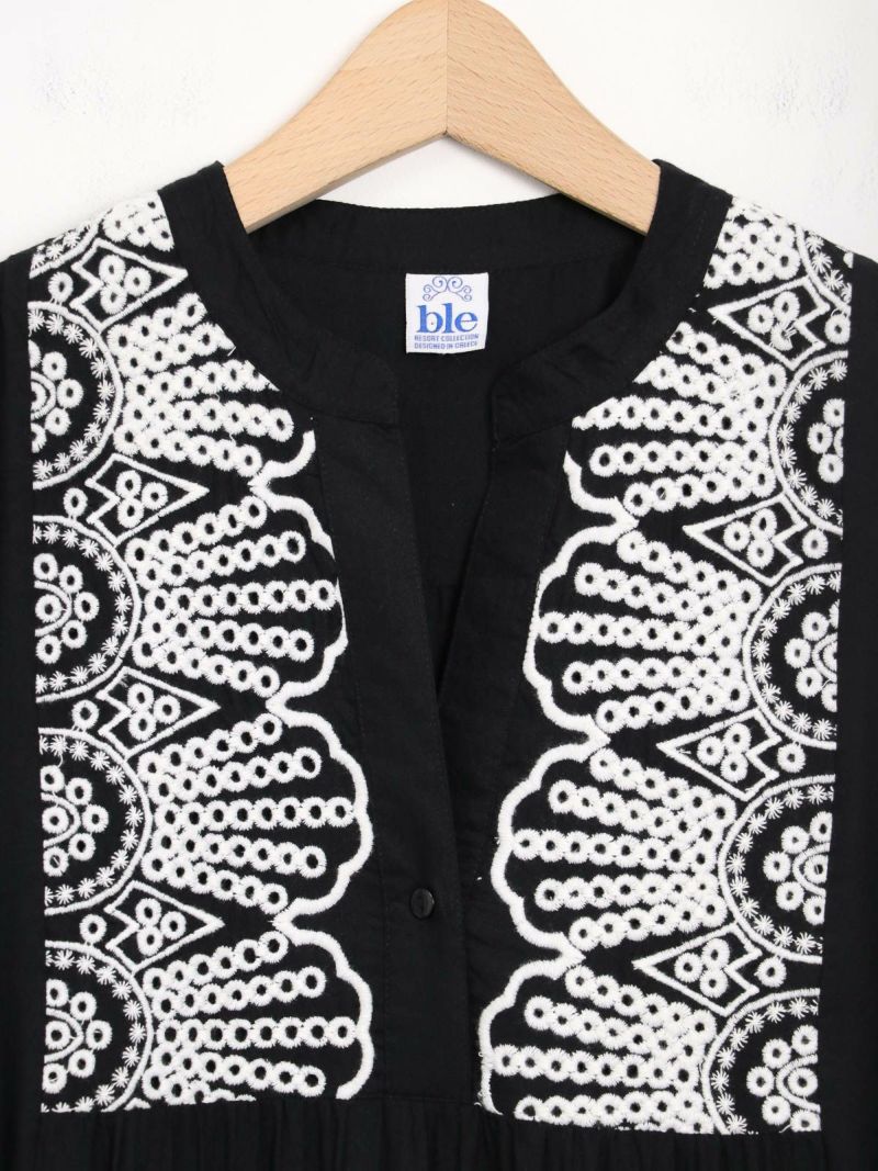インド綿の風合いが魅力のチュニック丈ワンピース。 1枚で着ても、デニムなどをレイヤードするのもオススメな、この夏により一層映えるアイテム。 前面に施された白の刺繍が華やかな1枚です。 ひざ上ほどの丈で、裾のスカラップカットもポイント。