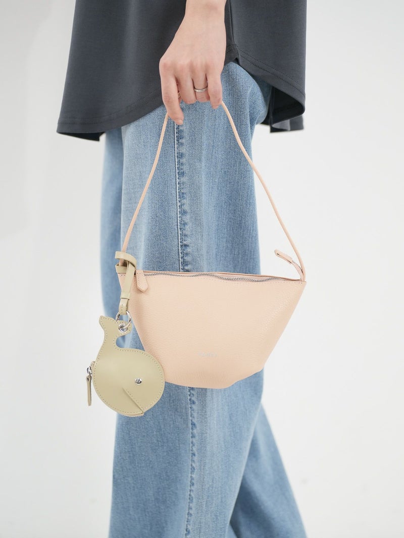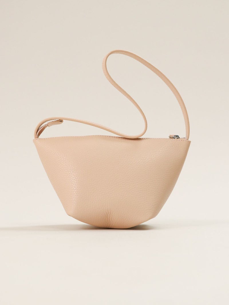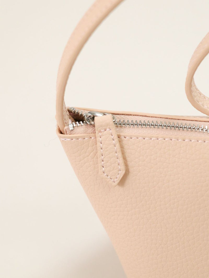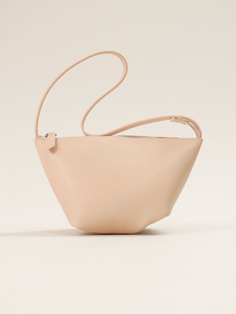 W FACE レザーのハンドバッグ。 やわらかな手触りと自然なシボ感が魅力の床革を使用。 底で絞ったような立体的なフォルムが特徴で、ふんわりとしたシルエットを生み出します。小ぶりながらも存在感があり、軽やかに手元を彩るデザインです。 ファスナー開閉で中身をしっかりとカバーし、スマートフォンや小物類をすっきり収納可能。ハンドルは肩掛けもできる長さで、デイリーにもお出かけにも活躍します。