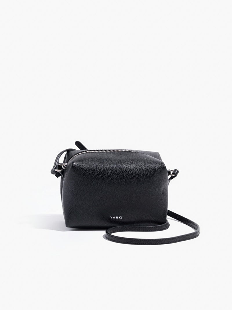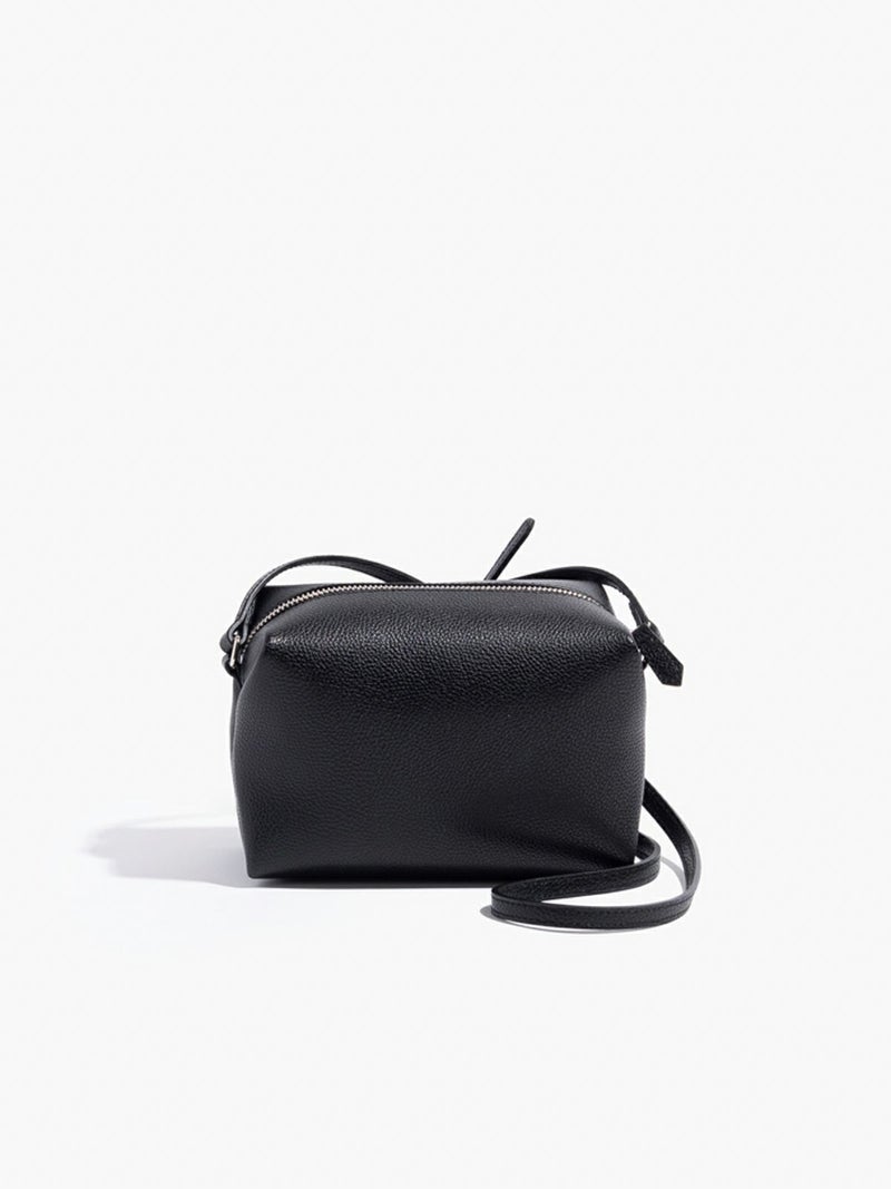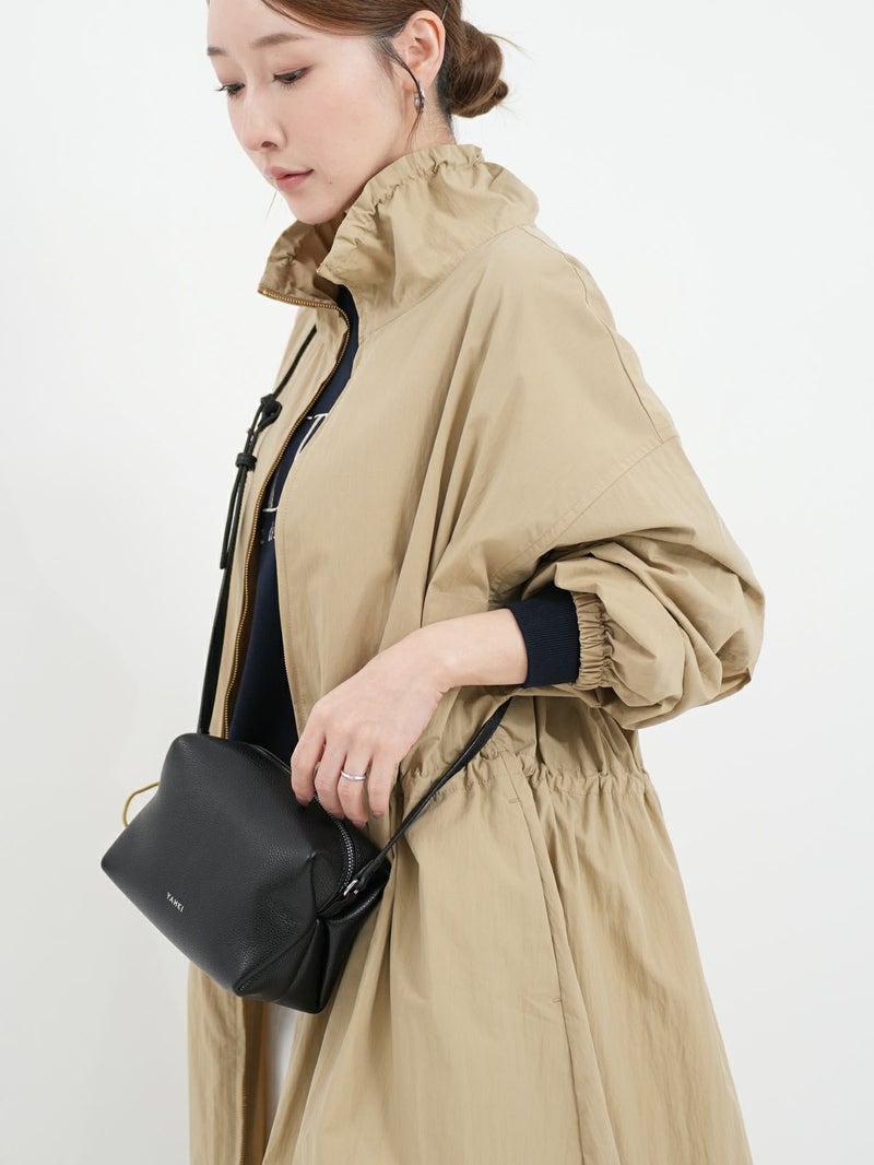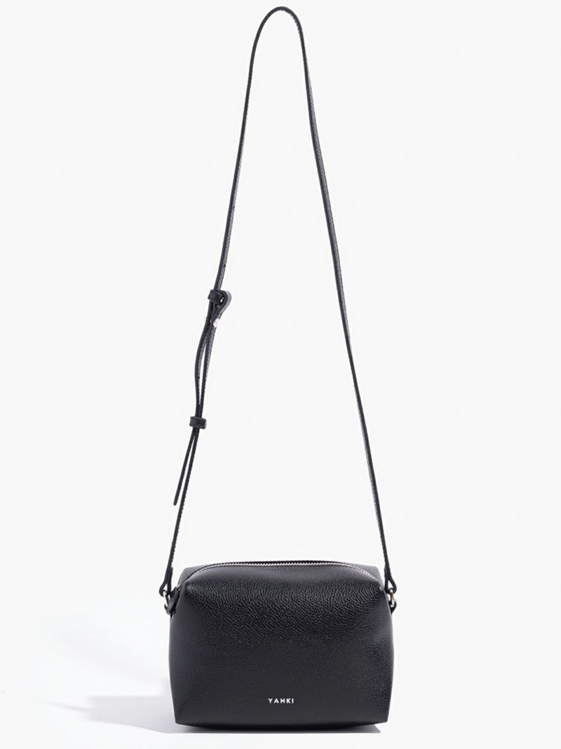 SOFT SHRINK レザーのクロスボディバッグ。 すっきりとしたフォルムに、両サイドの縫製がさりげないアクセントになったミニショルダーです。 一見シンプルながら、立体感のあるシルエットがどの角度から見ても美しく、ミニマルな中に個性が宿るデザインです。 本体にはシボ感のある床革を使用。軽量で肩掛けしやすく、コンパクトながらスマートフォンやミニ財布、鍵などの必需品がしっかり収まります。 ストラップは長さ調節が可能で、斜めがけにも対応。毎日のスタイルに寄り添う、飽きのこないベーシックアイテムです。