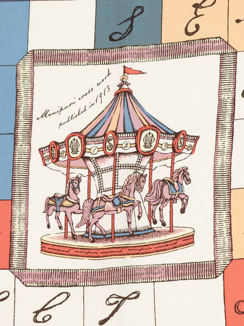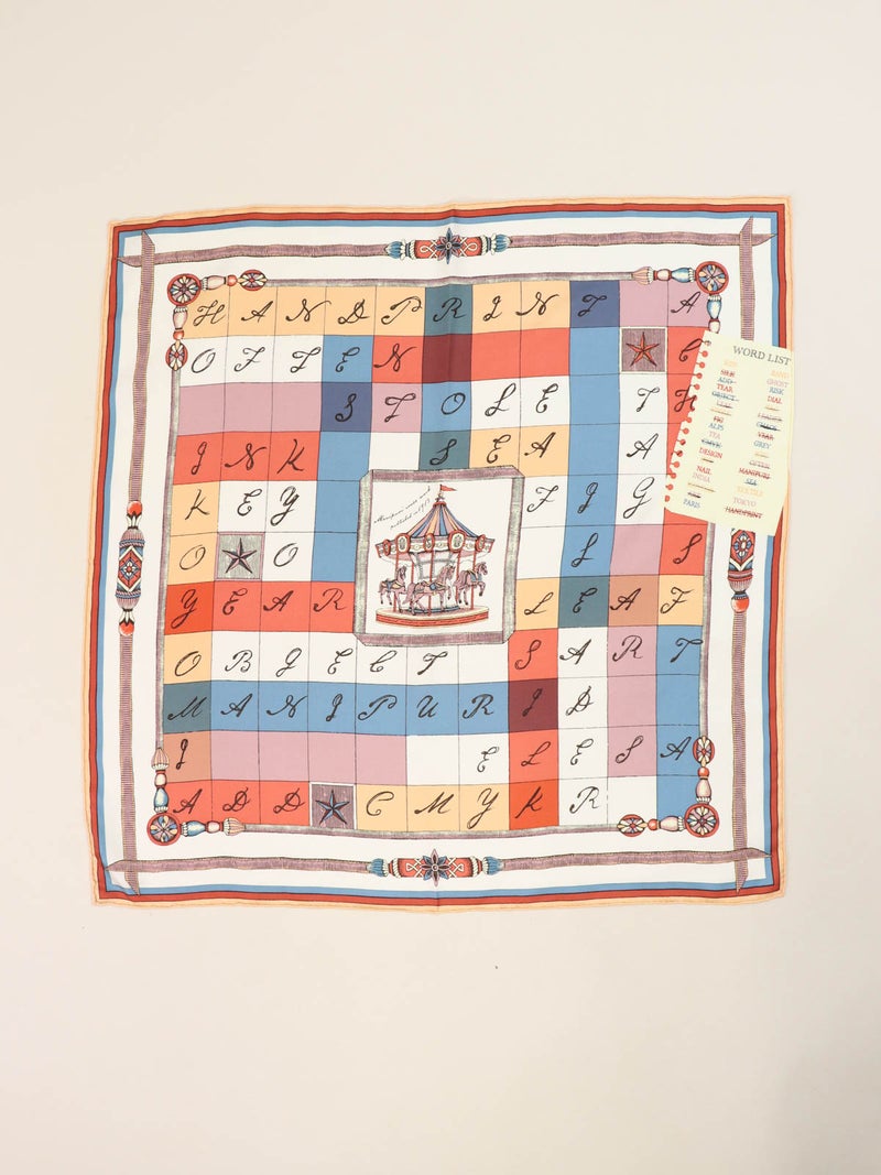 パリのお土産の包み紙として使われていた現地の新聞に載っていたクロスワードからインスパイアされた一枚。パリの蚤の市のエッセンスと遊び心を加えて描きました。空欄の部分に何が入るかワードリストを元に考えてみて下さい。 manipuriのスカーフは、日本の職人が1枚ずつ手捺染し、端を手巻きで仕上げております。生地は12匁綾織りシルクを使用。薄すぎず厚すぎず、とても滑らかです。シルクの艶やかな光沢感がカラーリングに更に明るさをプラスしてくれるので、コーディネートがぐっと華やかになります。