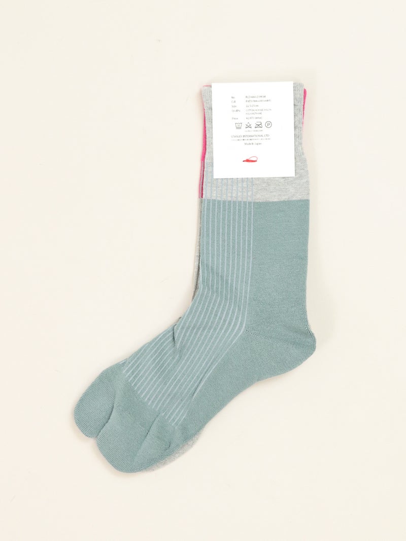 サイドから踵にかけてのラインが印象的なPIGGY SOCKS。 抗菌防臭加工を施した糸を使用し編み上げたカジュアルながらもドレッシーなハイゲージソックス。つま先と本体のつなぎ目をリンキング製法で仕上げているため、ゴロつかずスムーズな履き心地です。アシンメトリーな配色がスタイリングのアクセントにも最適な一足です。