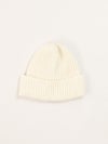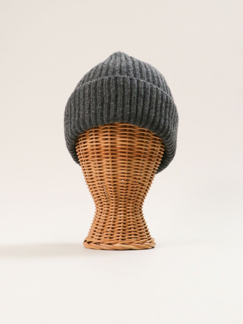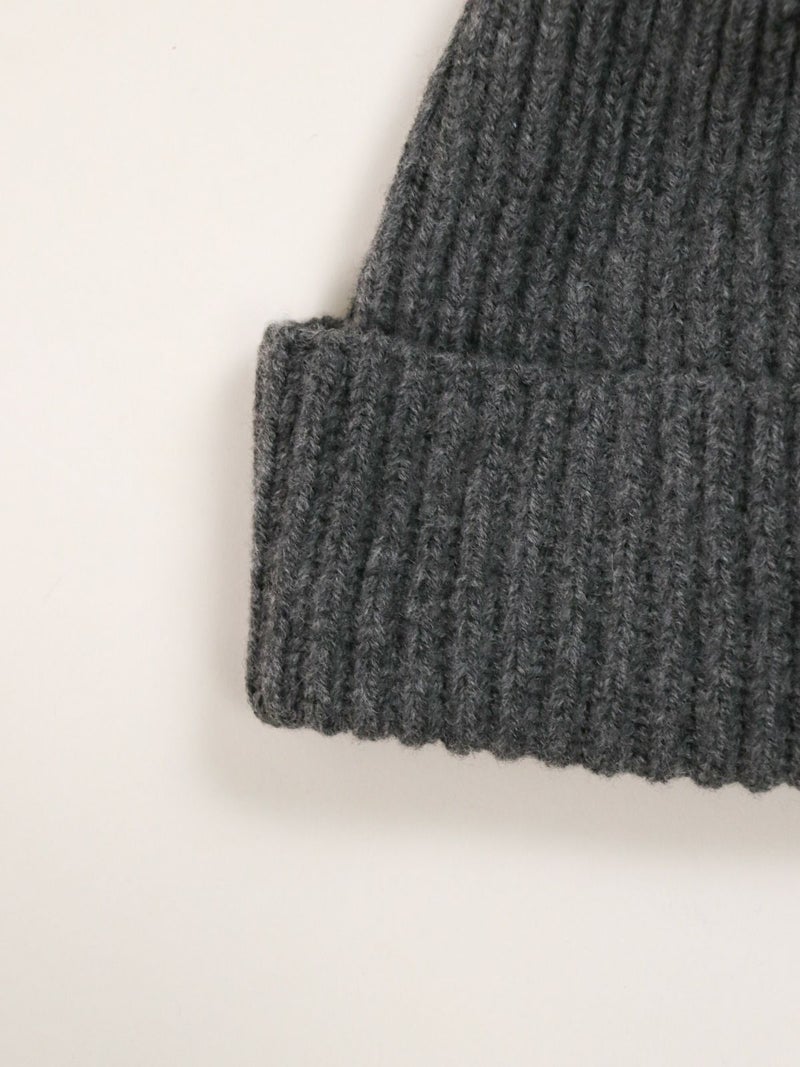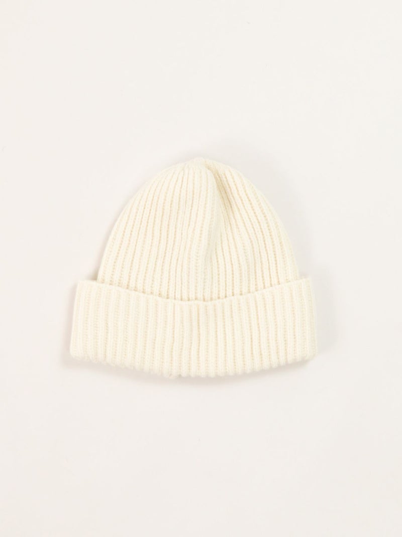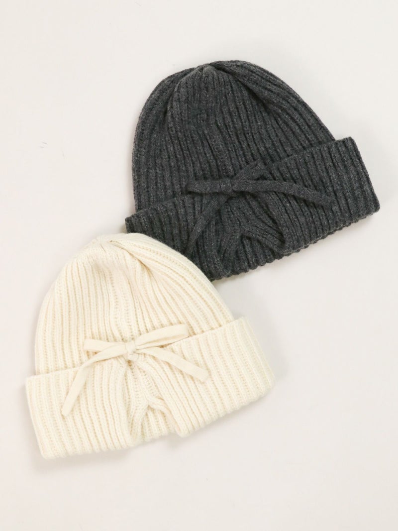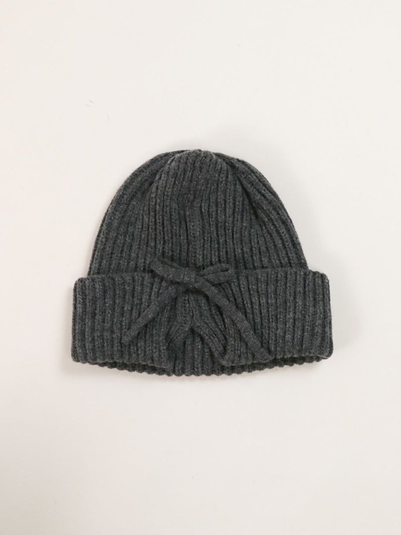 バックの折り返し部分にリボンをあしらったニットキャップ。 フロントから見るとシンプルなニット帽に見えるので、甘くなりすぎないのがポイントです。ソフトなリブ編みで被り心地も抜群。コーディネートのプラスワンとして、顔周りにさりげないアクセントを添えてくれます。