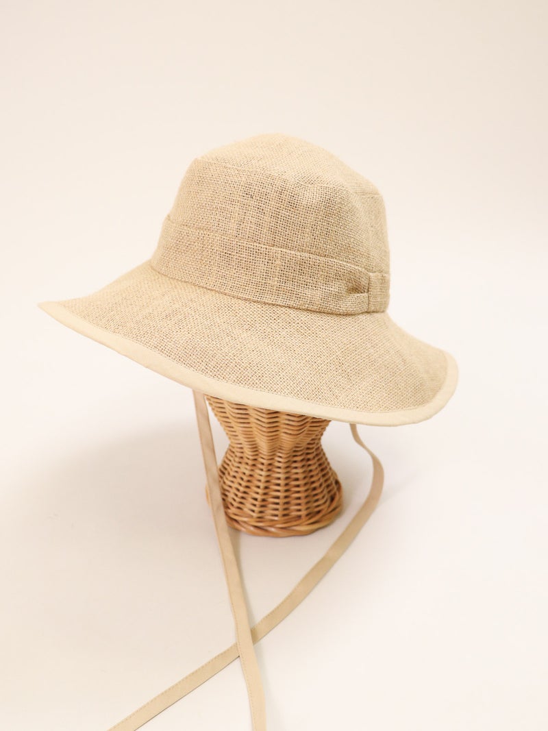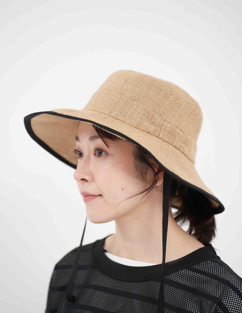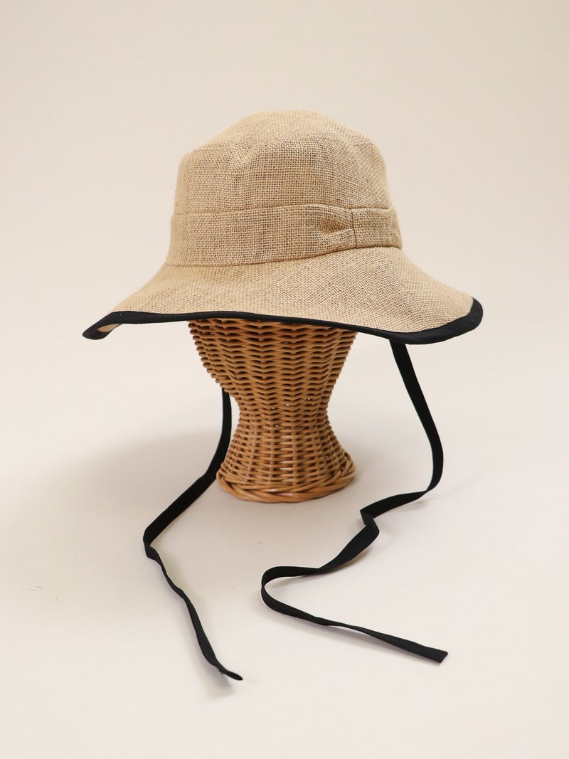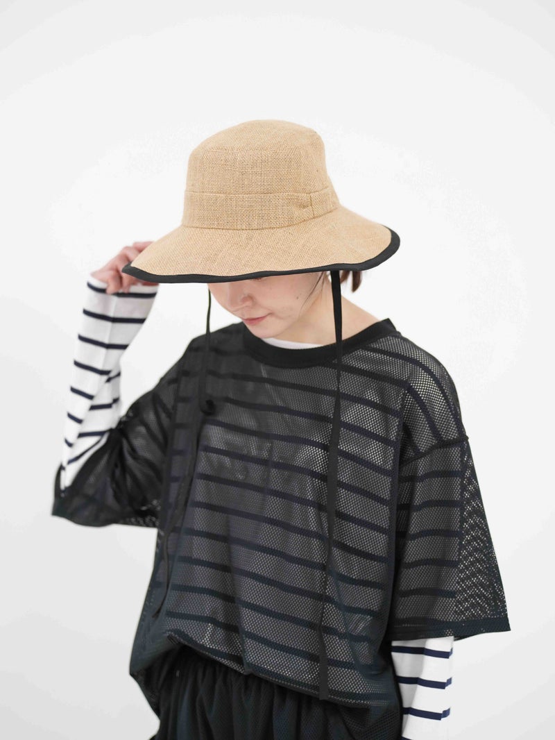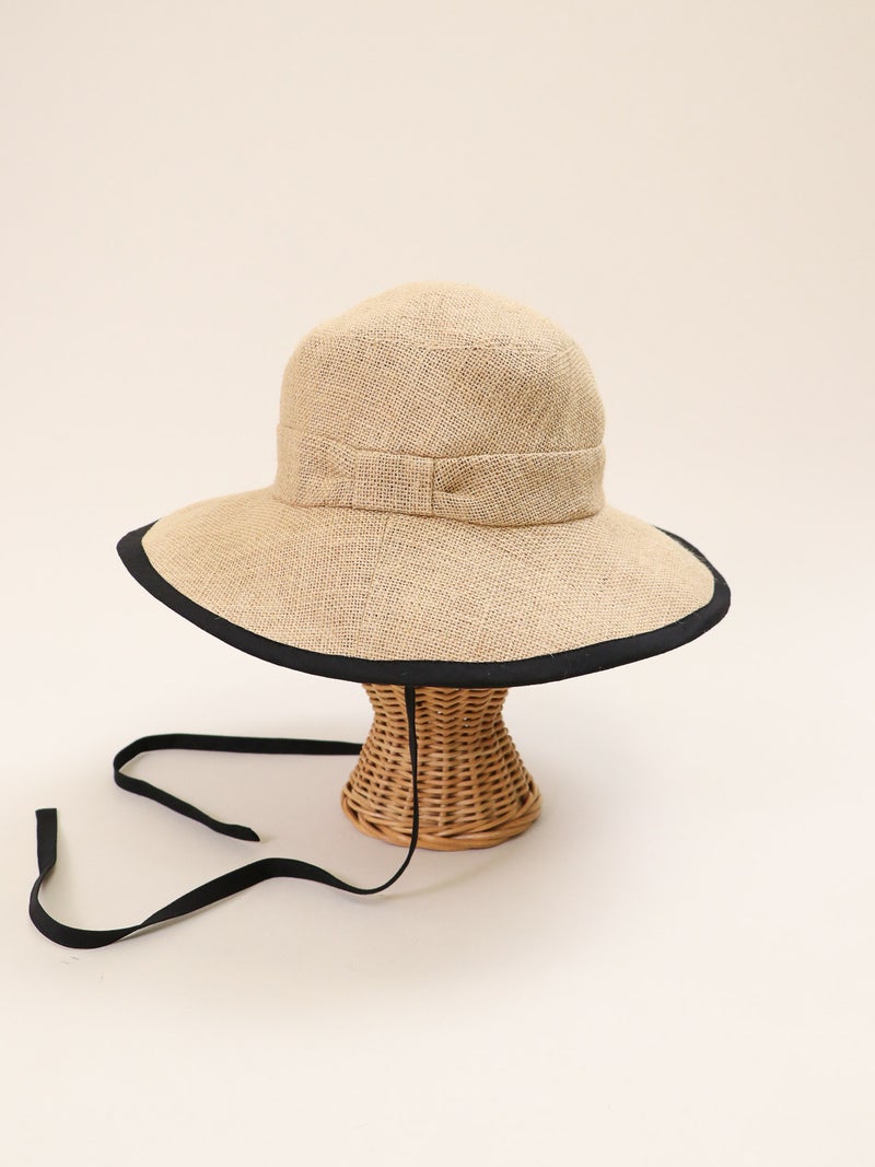 ツバ縁のパイピングが顔周りを引き締めるジュートハット。 ナチュラルな風合いの中に都会的なエッセンスが加わり、カジュアルになりすぎず「きれいめ」な印象を演出。 長めのリボンはそのまま垂らしたり、あご下で結んだりと、その日の気分に合わせたアレンジが可能です。 しっかりと日差しを遮るツバの広さがありながら、軽やかな被り心地でストレスを感じさせません。 夏のワンピーススタイルからデニムスタイルまで、幅広く活躍する頼れる一点です。