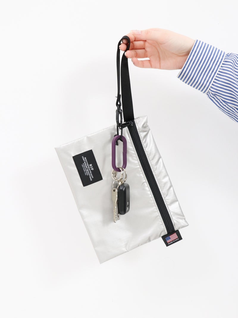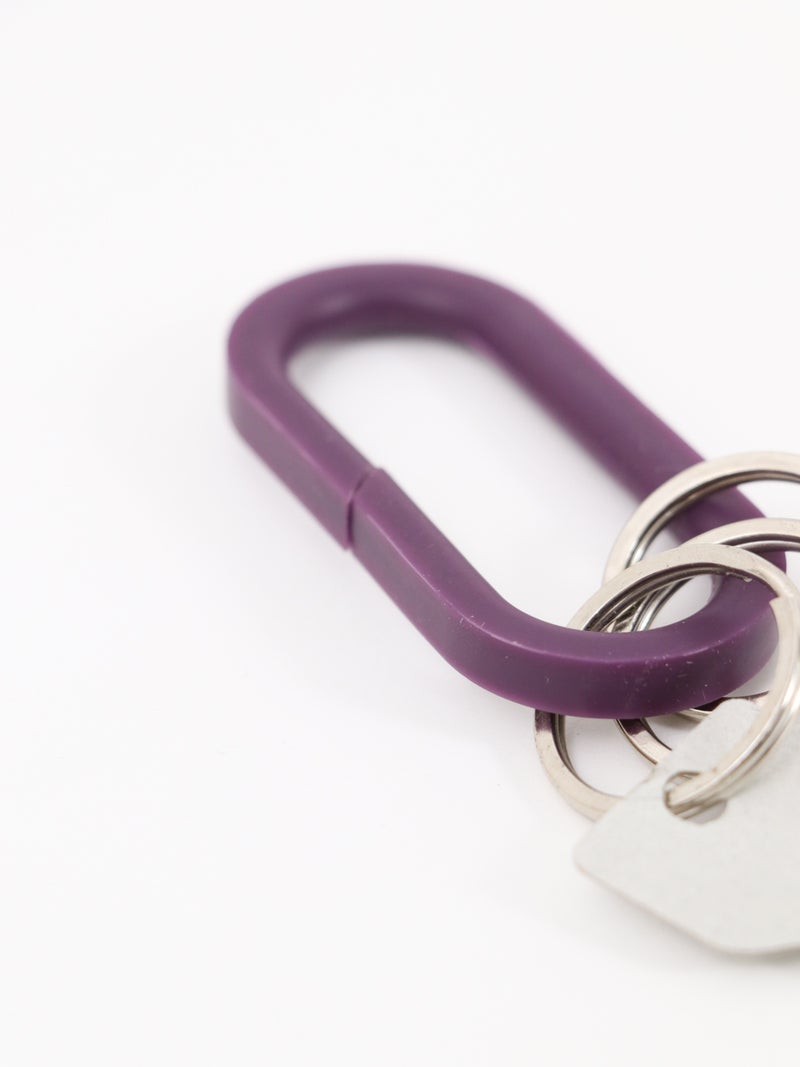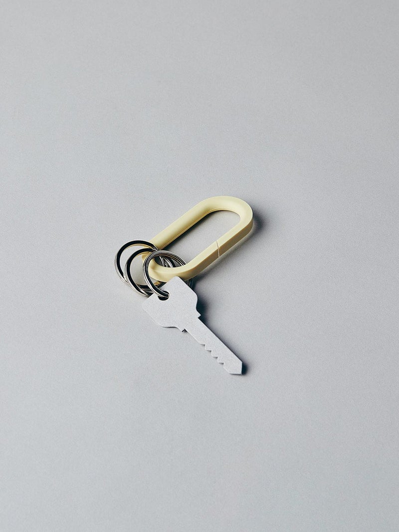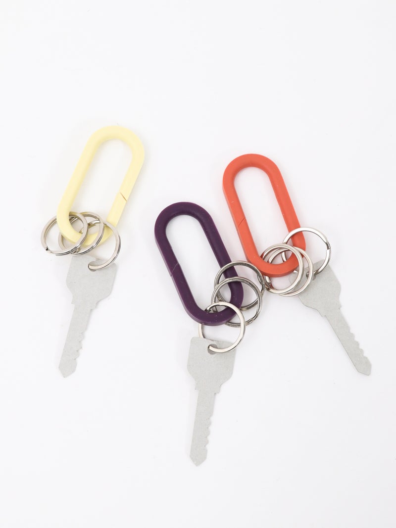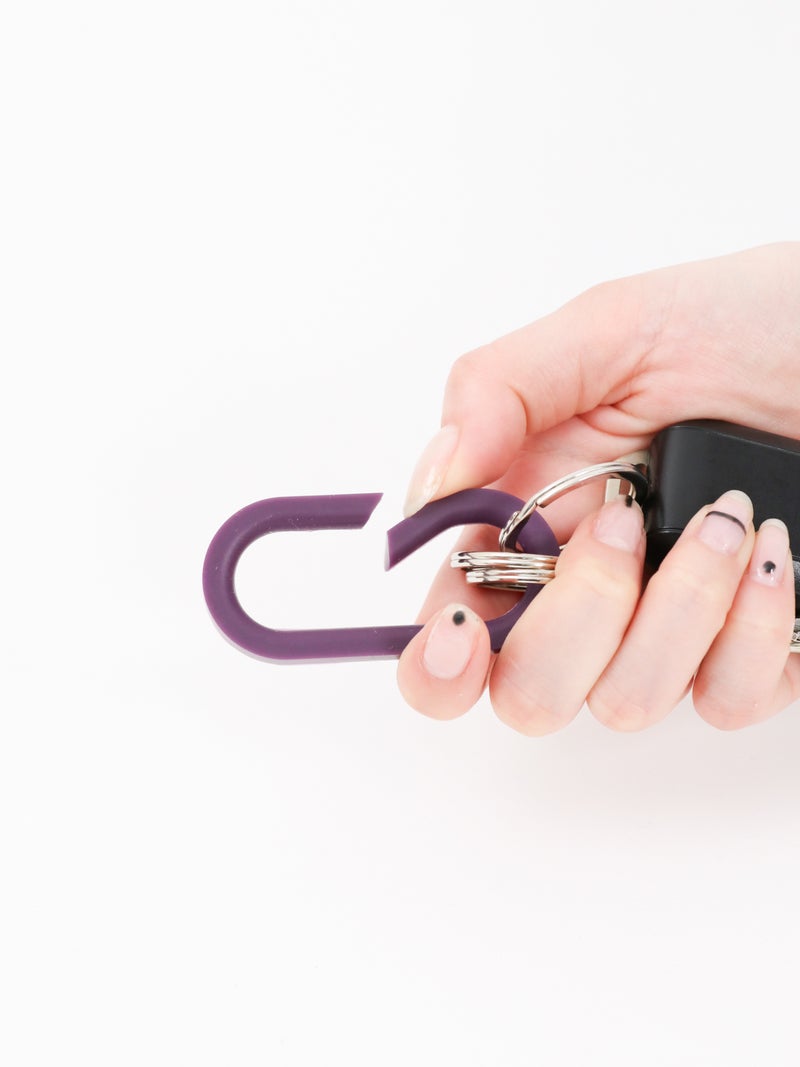 シリコーンゴムの弾力性と、自由度の高い成形性を利用した一体成型のキーリング。 斜めにカットが入ったデザインで取り付けやすいのに外れにくいです。バッグやベルトループにつけて、いつものスタイリングにワンアクセント。